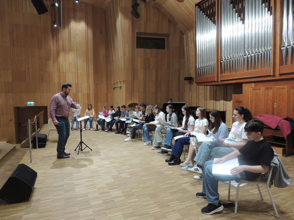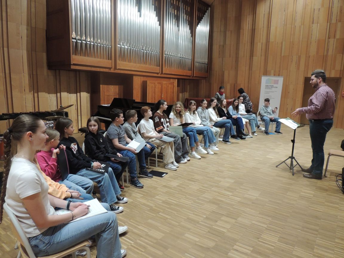Ale zacznijmy od początku, czyli od pana Sebastiana Sikory – prowadzącego warsztaty dyrygenta, który z nieprzebranymi pokładami energii zabrał się do pracy i bardzo szybko zdołał „rozbudzić" trochę zaspane towarzystwo – i mówię tu nie tylko o uczniach, ale także nauczycielach:). Ani się obejrzeliśmy, a minęło 60 minut, które wypełniły ćwiczenia rozgrzewające. Potem przyszedł czas na naukę kanonu „Banaha", w którym odkryliśmy, że kanon można nie tylko zaśpiewać, ale także pokazać. Kolejne utwory, czyli „Samba nietoperzy" i „Coco" wprawiły nas w naprawdę wspaniały nastrój. I mimo że nie dla wszystkich samba jest ulubionym tańcem, to mając za wzór pana Sebastiana daliśmy radę – tu wyjątkowe brawa dla chłopaków!
