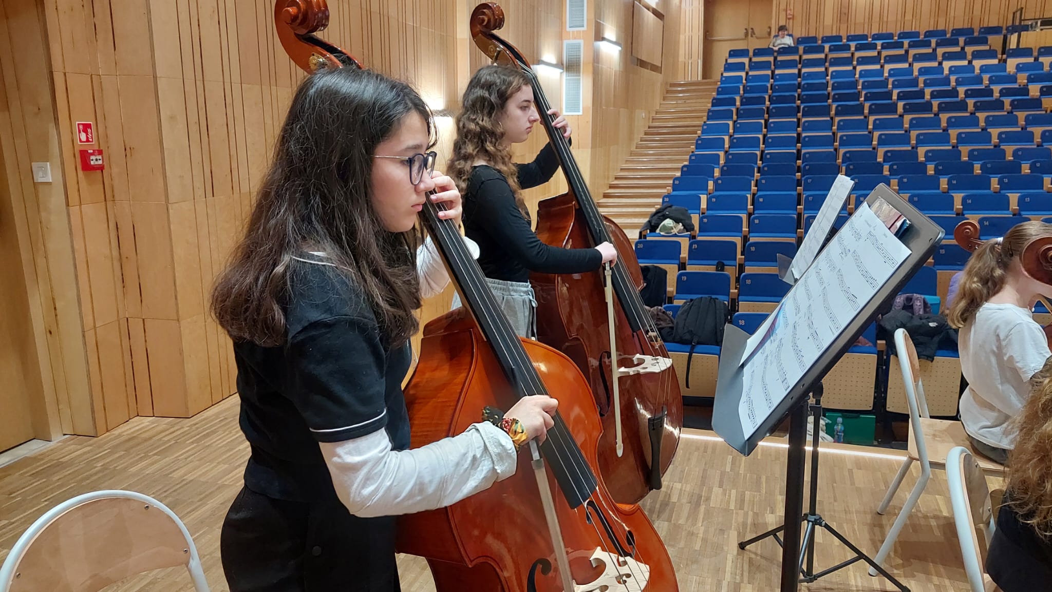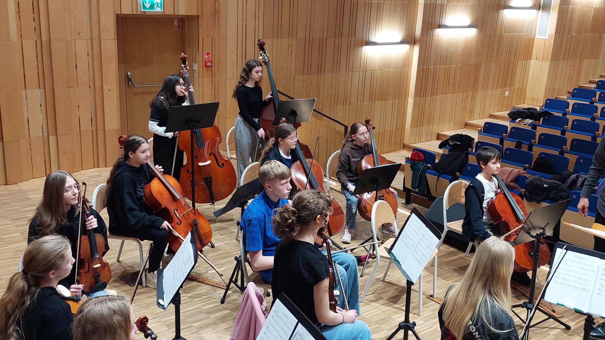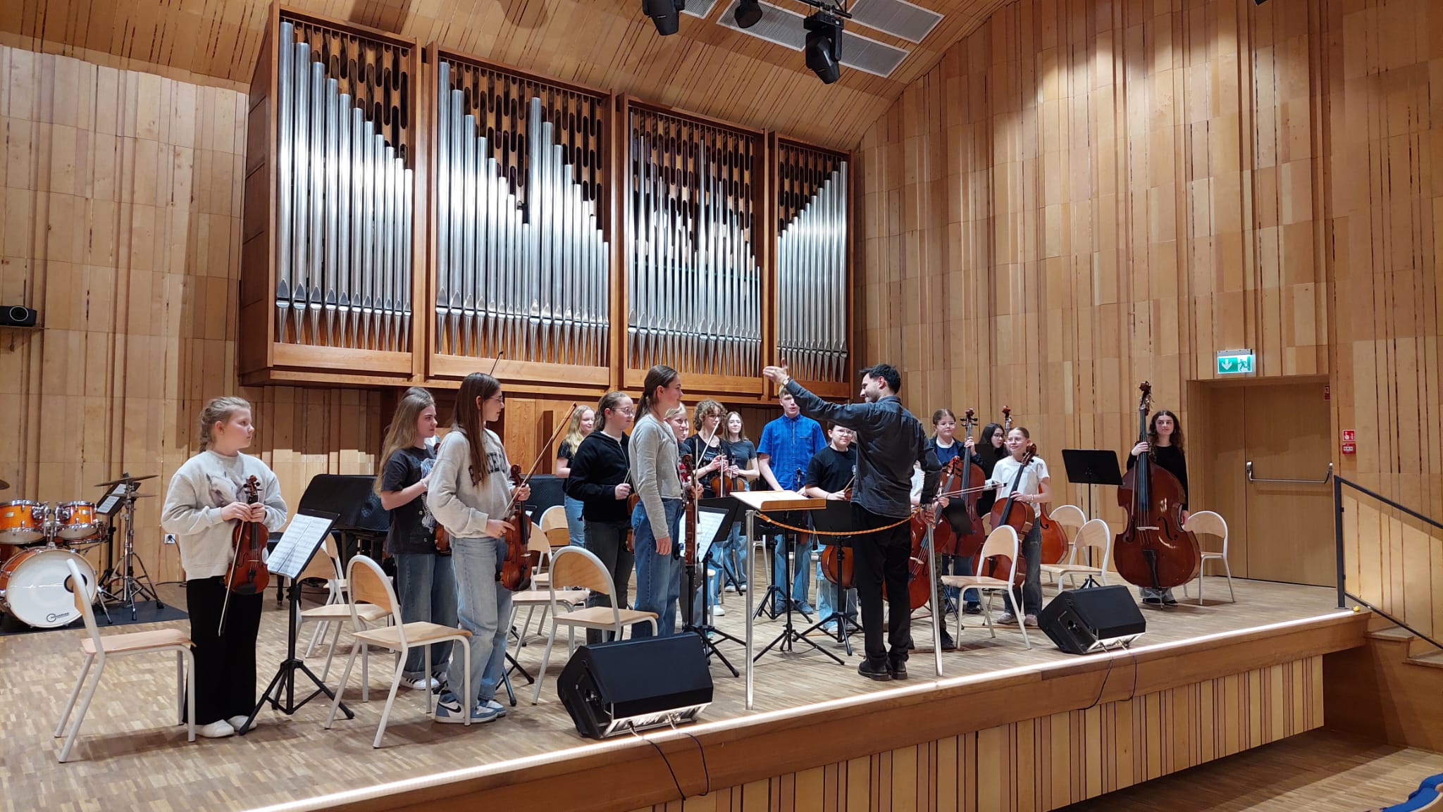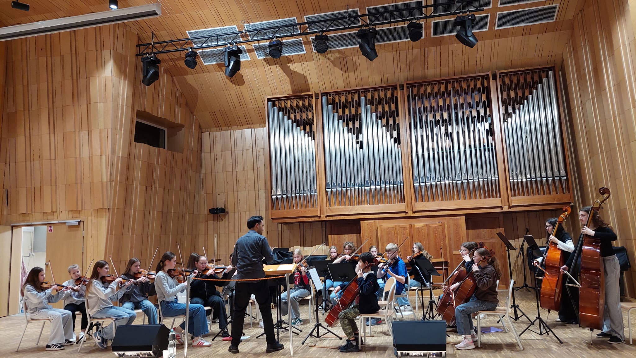 Co można było robić ciekawego w Raciborzu w sobotę 29 marca 2025 r.… spać, leniuchować, korzystać z miejskich atrakcji, wciągnąć się w serial na Netflixie. A co wybrali uczniowie Zespołu Instrumentów Smyczkowych – warsztaty orkiestrowe ze znakomitym dyrygentem Filipem Hugetem. No może nie do końca był to ich wybór, bo to przecież sobota i tak wcześnie rano – ale wszyscy punktualnie (no może z jednym małym wyjątkiem J) stawili się na warsztaty. Byli i tacy, którzy przyjechali wcześniej, bo pamiętali, że trzeba przygotować krzesła i pulpity.