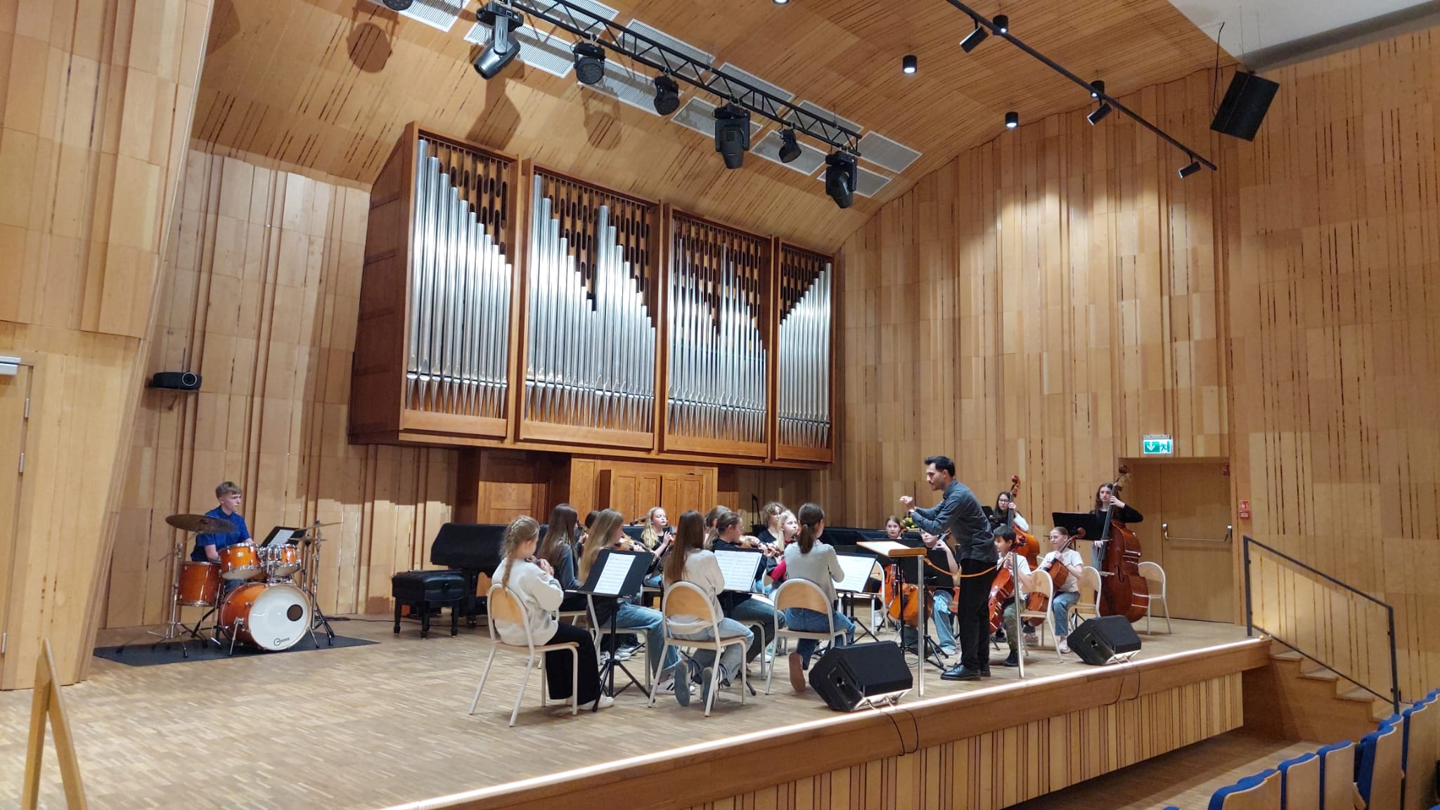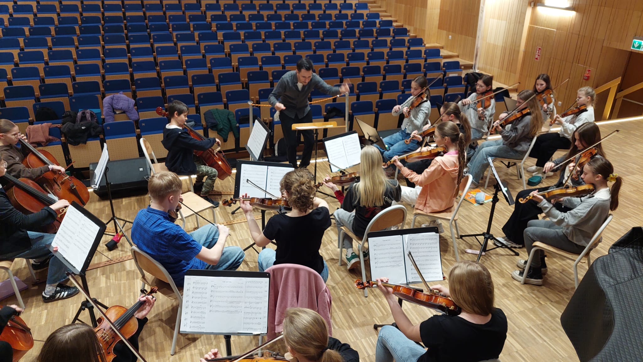 Po raz trzeci gościem warsztatów był Filip Huget – dyrygent, który współpracuje i koncertuje z takimi orkiestrami jak: Śląska Orkiestra Kameralna, Orkiestra Symfoniczna Filharmonii Śląskiej w Katowicach, Orkiestra kameralna Filharmonii Rybnickiej, Chór Mieszany i Orkiestra Symfoniczna Łotewskiej Akademii Muzycznej im. Jazepsa Vitolsa w Rydze, EAMT Sinfonietta w Talinie oraz Orkiestra Muzyki Nowej. Dzieci, które miały już kontakt z panem Filipem, cieszyły się na to kolejne spotkanie. Wiedziały, że czeka je ogrom pracy i skupienia – ale dla tego doświadczenia warto. Pan Filip potrafi zauroczyć uczniów i wprowadzić ich w prawdziwy orkiestrowy świat i pracować z nimi na bardzo wysokim poziomie.