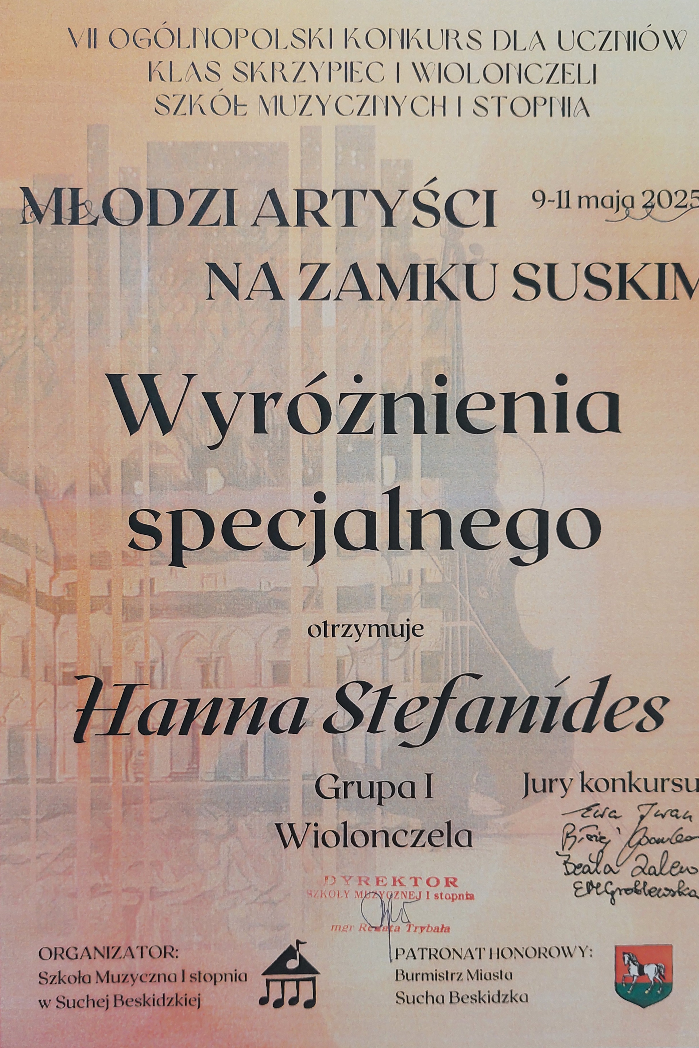 W dniach 9-11 maja 2025 r. w Suchej Beskidzkiej odbył się VII Ogólnopolski Konkurs dla uczniów klas skrzypiec i wiolonczeli szkół muzycznych I stopnia "Młodzi Artyści na Zamku Suskim". Naszą szkołę reprezentowały uczennice z klasy wiolonczeli pani Eweliny Mrozek: Marysia Siorak i Hania Stefanides. Obie zaprezentowały się bardzo dobrze. Hania Stefanides - uczennica klasy I cyklu sześcioletniego otrzymała na konkursie Wyróżnienie Specjalne. Wyjątkową nagrodą, którą Hania otrzymała jest książka z utworami pani Ewy Iwan i z dedykacją samej autorki. Hani i Marysi na scenie towarzyszył pan Jarosław Pawłowski.