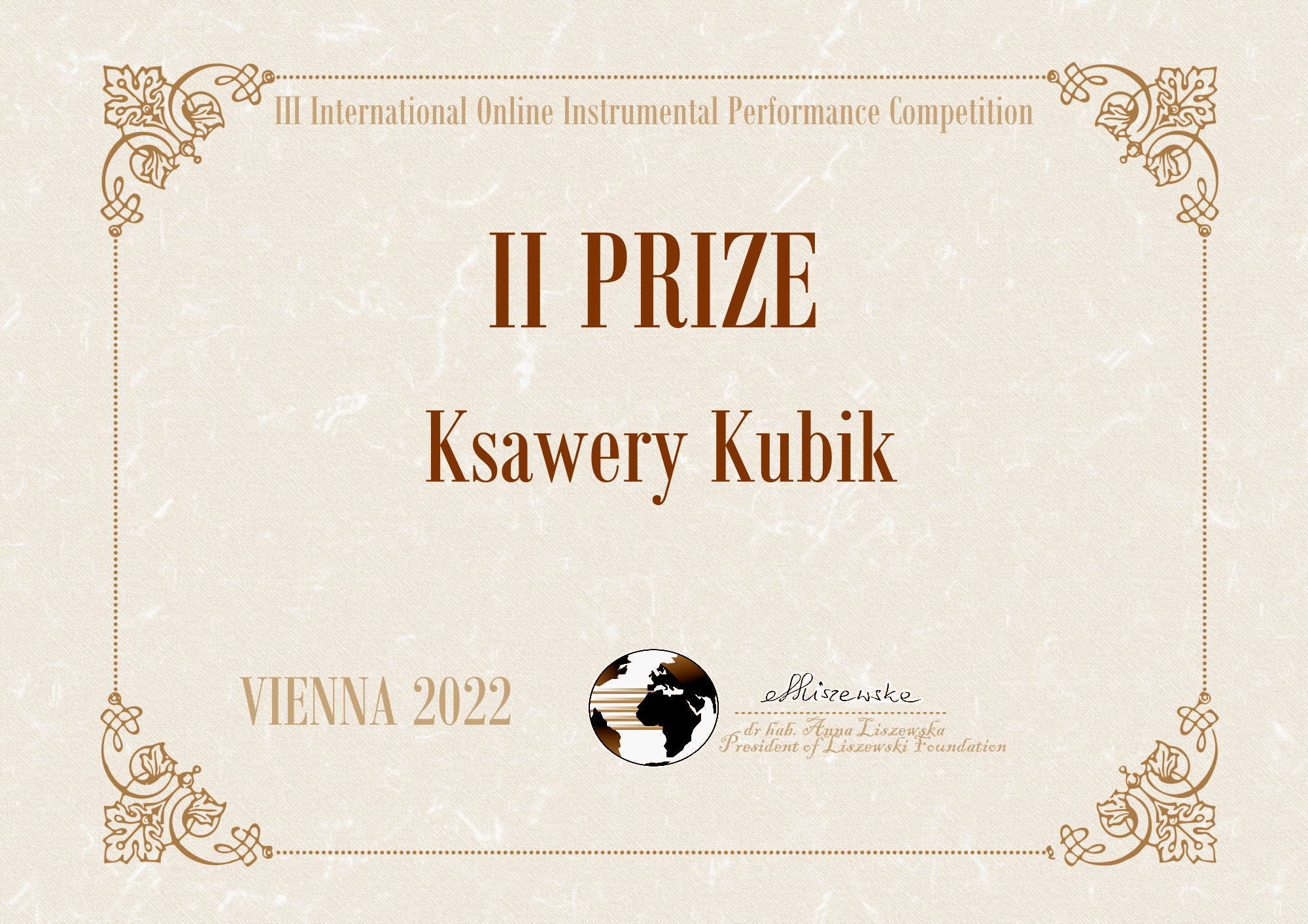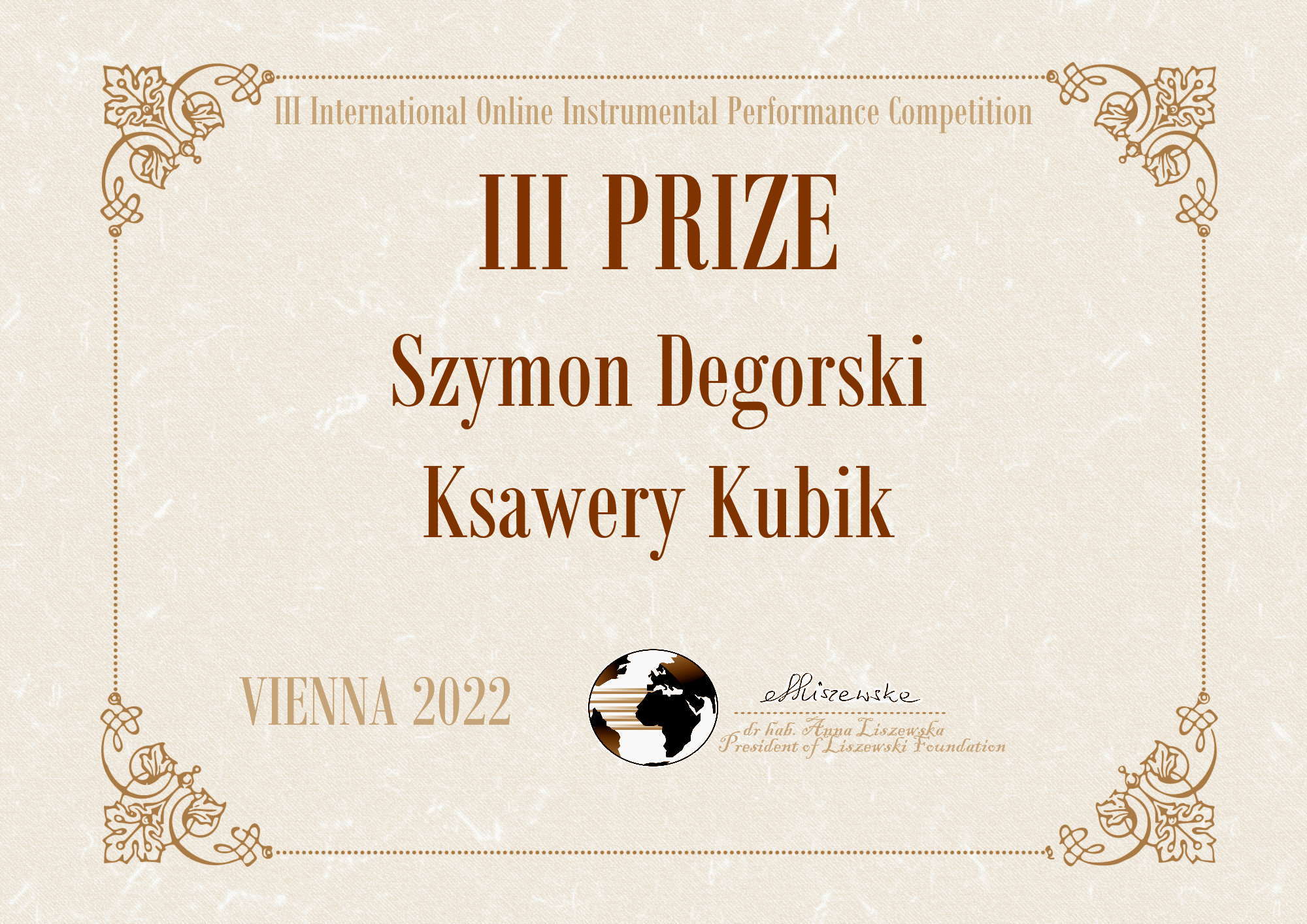 Ksawery Kubik z klasy fortepianu p. Hanny Rodzoń otrzymał II nagrodę w międzynarodowym konkursie: III International Online Instrumental Performance Competiotion w Wiedniu 2022 r., w kat. solistów, oraz III w kat. zespołów wraz Szymonem Degorskim. Duet również prowadzi p. Hanna Rodzoń.