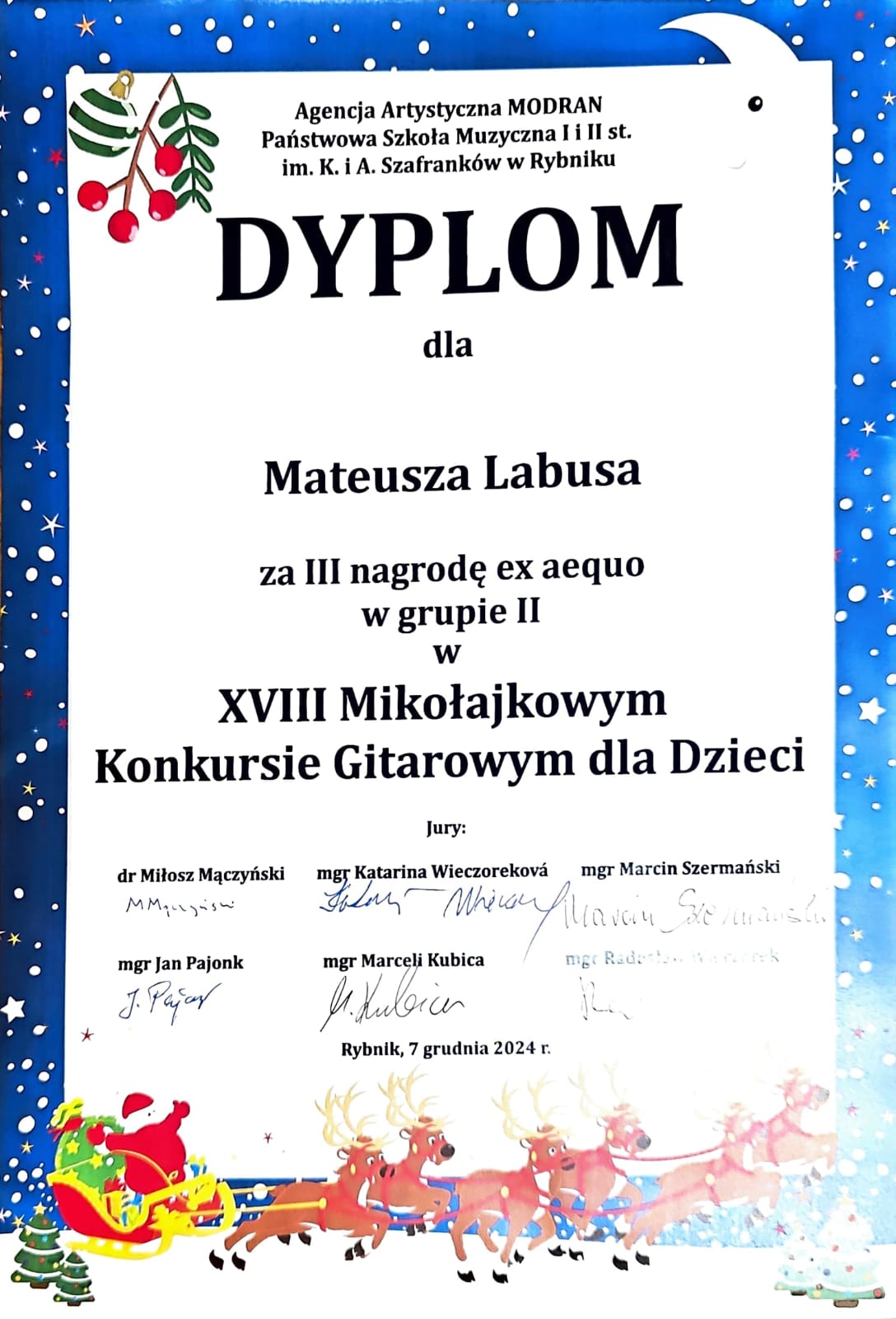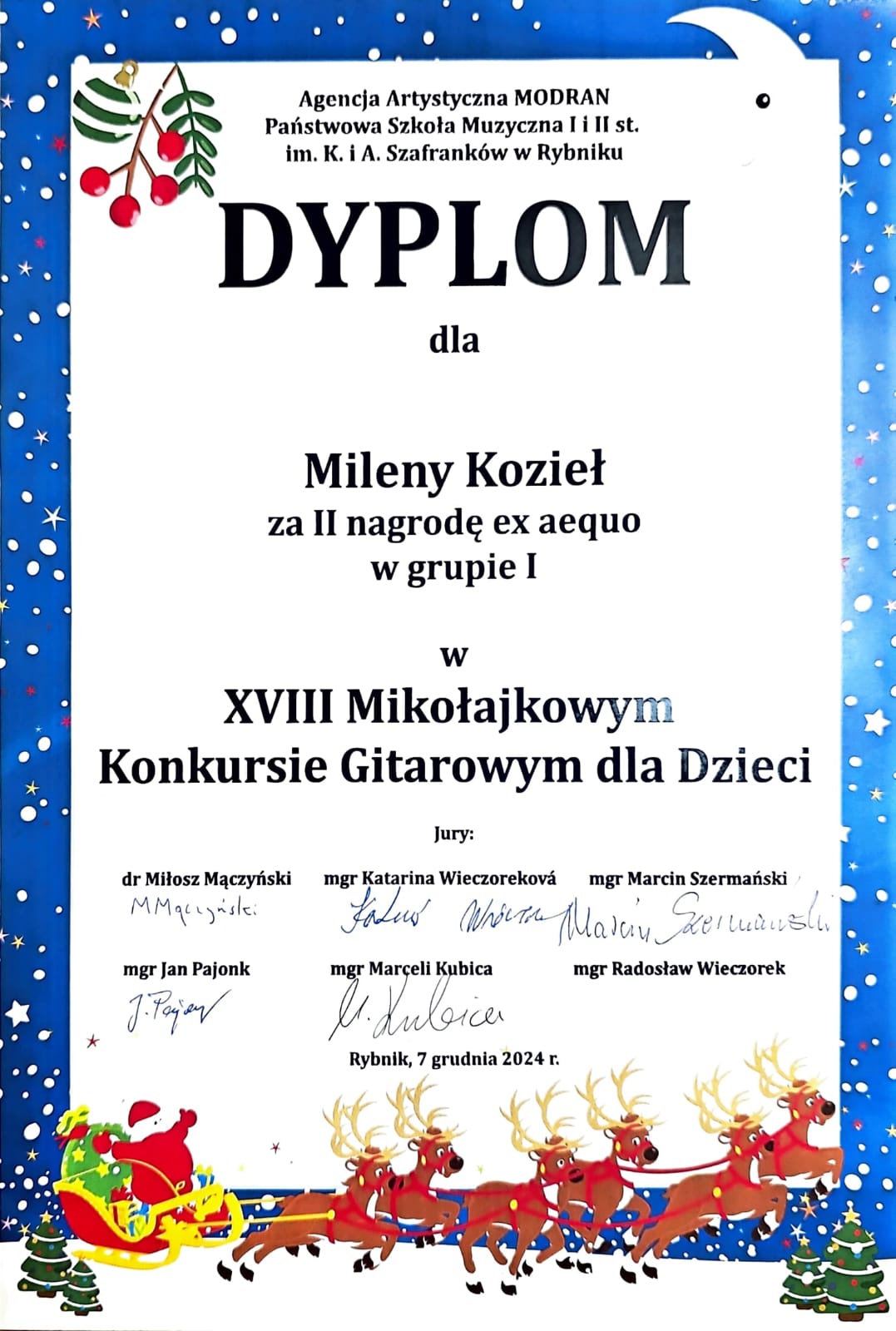 W dniu 7 grudnia 2024 r., uczniowie naszej szkoły z klasy gitary p. Mariusza Swoińskiego, podczas XVIII Mikołajkowego Konkursu Gitarowego dla Dzieci w Rybniku. zdobyli Milena Kozieł z klasy drugiej c6 II nagrodę, oraz Mateusz Labus z klasy trzeciej c6 III nagrodę.