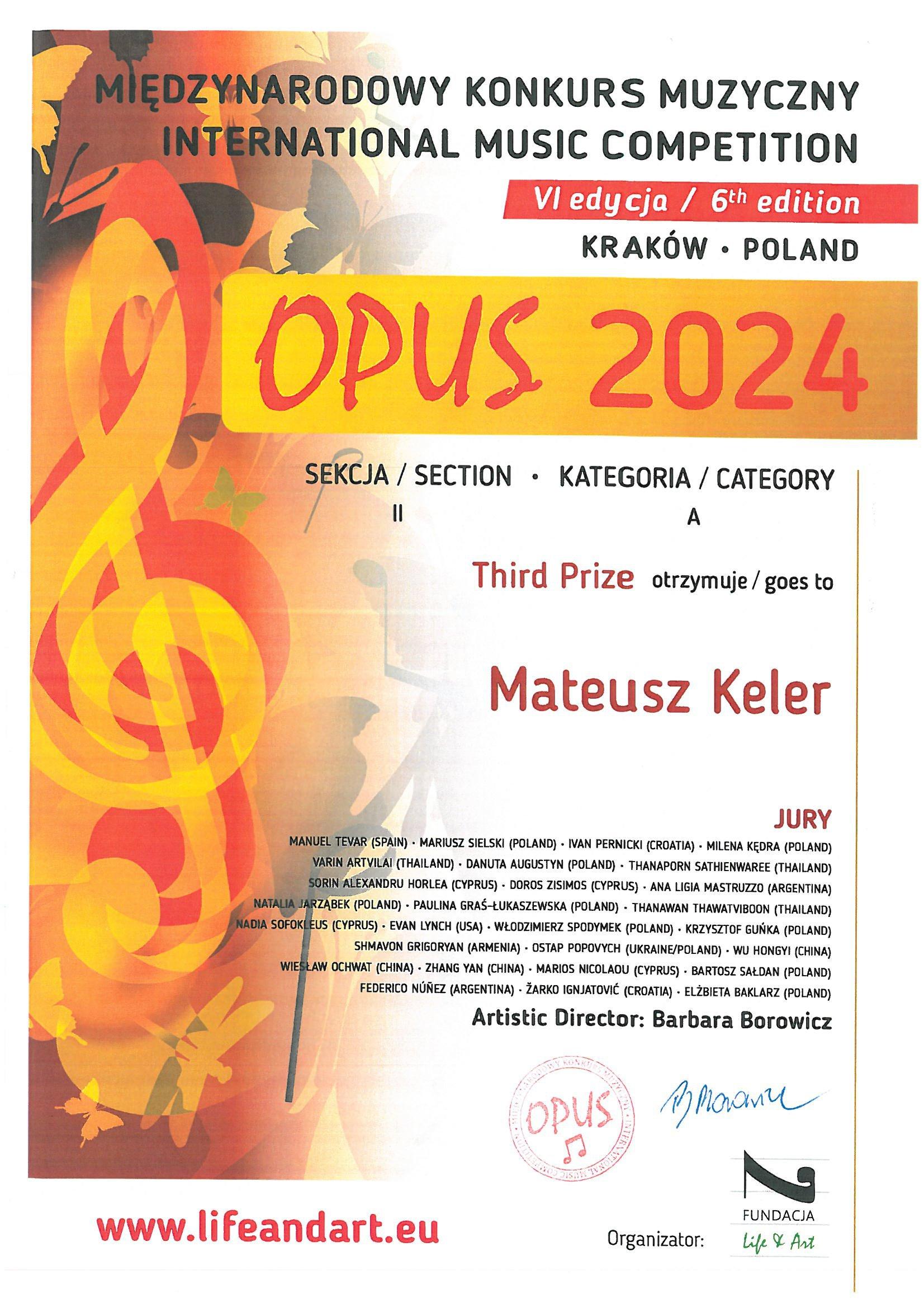 III miejsce w Międzynarodowym Konkursie Muzycznym OPUS 2024. Mateuszowi akompaniował p. Jarosław Pawłowski.