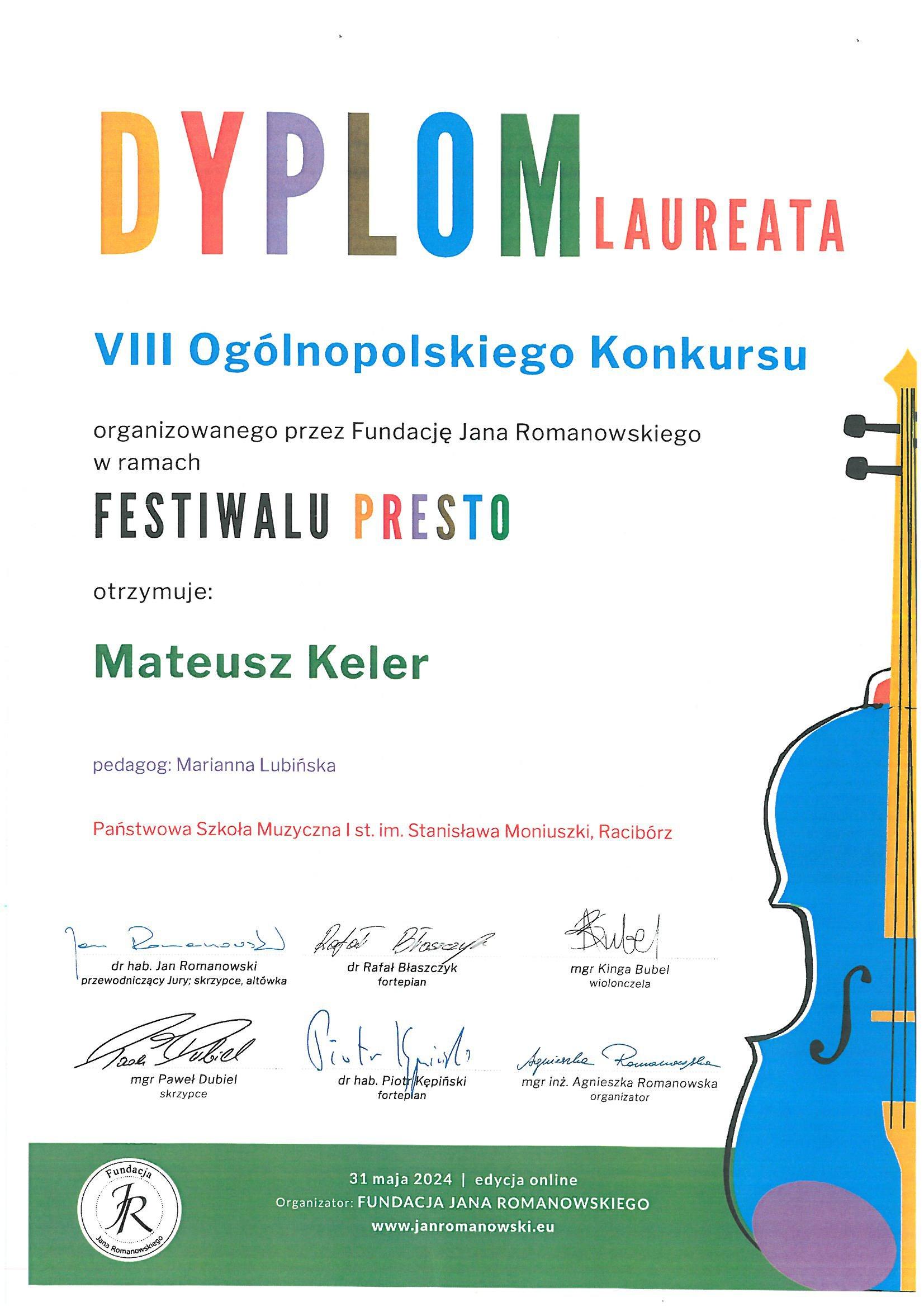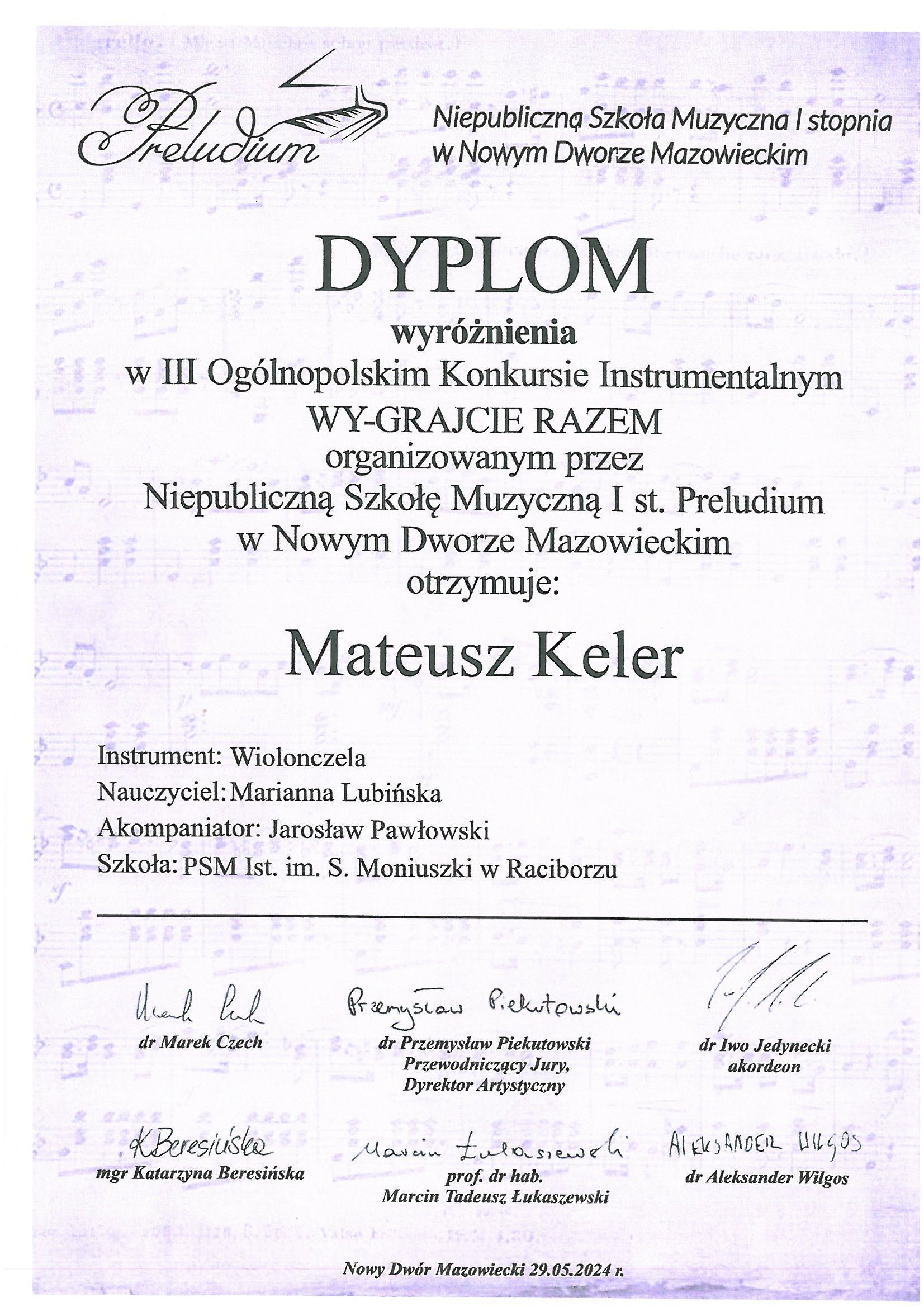Mateusz Keler, z klasy wiolonczeli p. Marianny Lubińskiej otrzymał nagrody i wyróżnienia w następujących konkursach:
