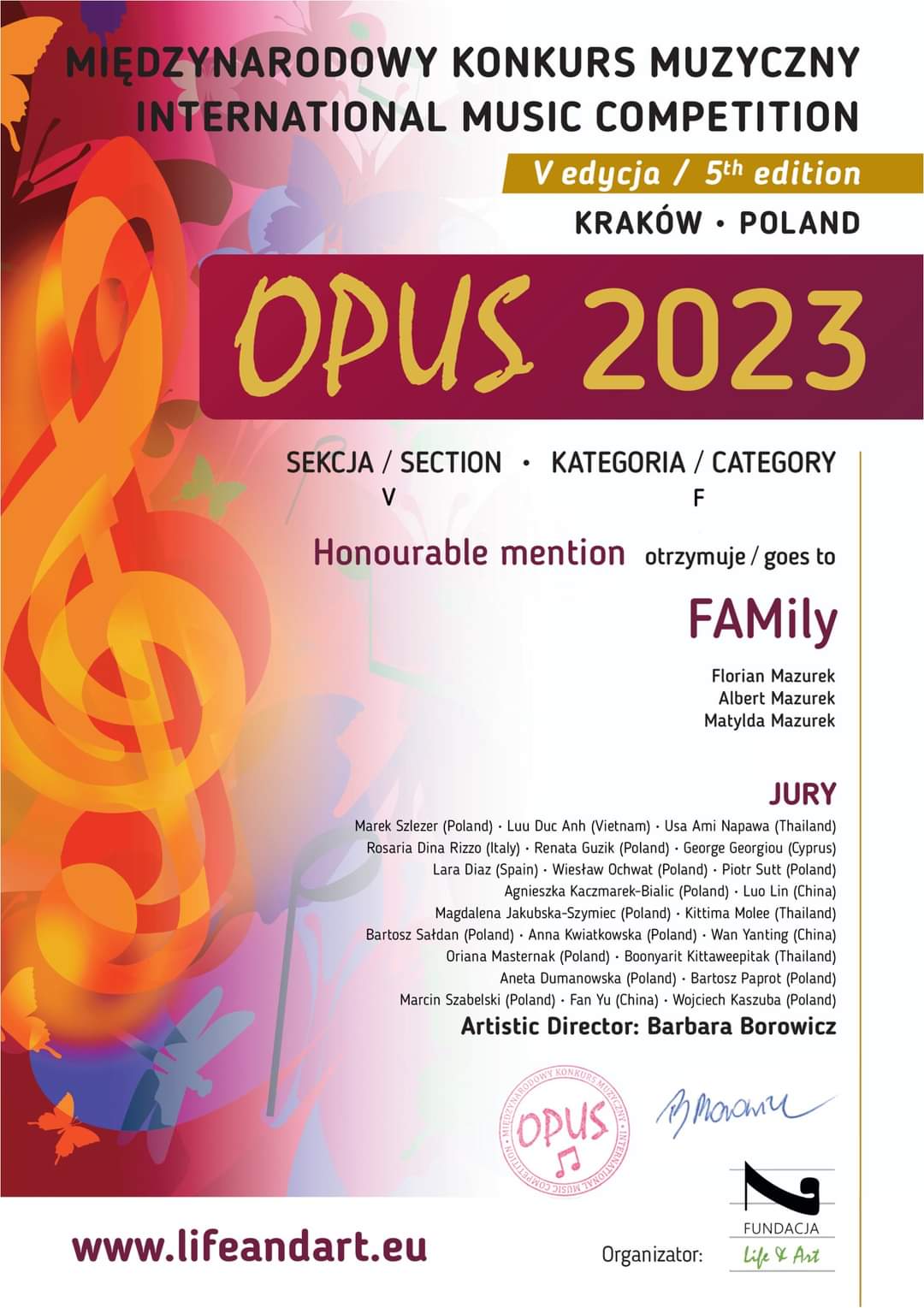 - wyróżnienie na Międzynarodowym Konkursie Muzycznym OPUS 2023 (V edycja)