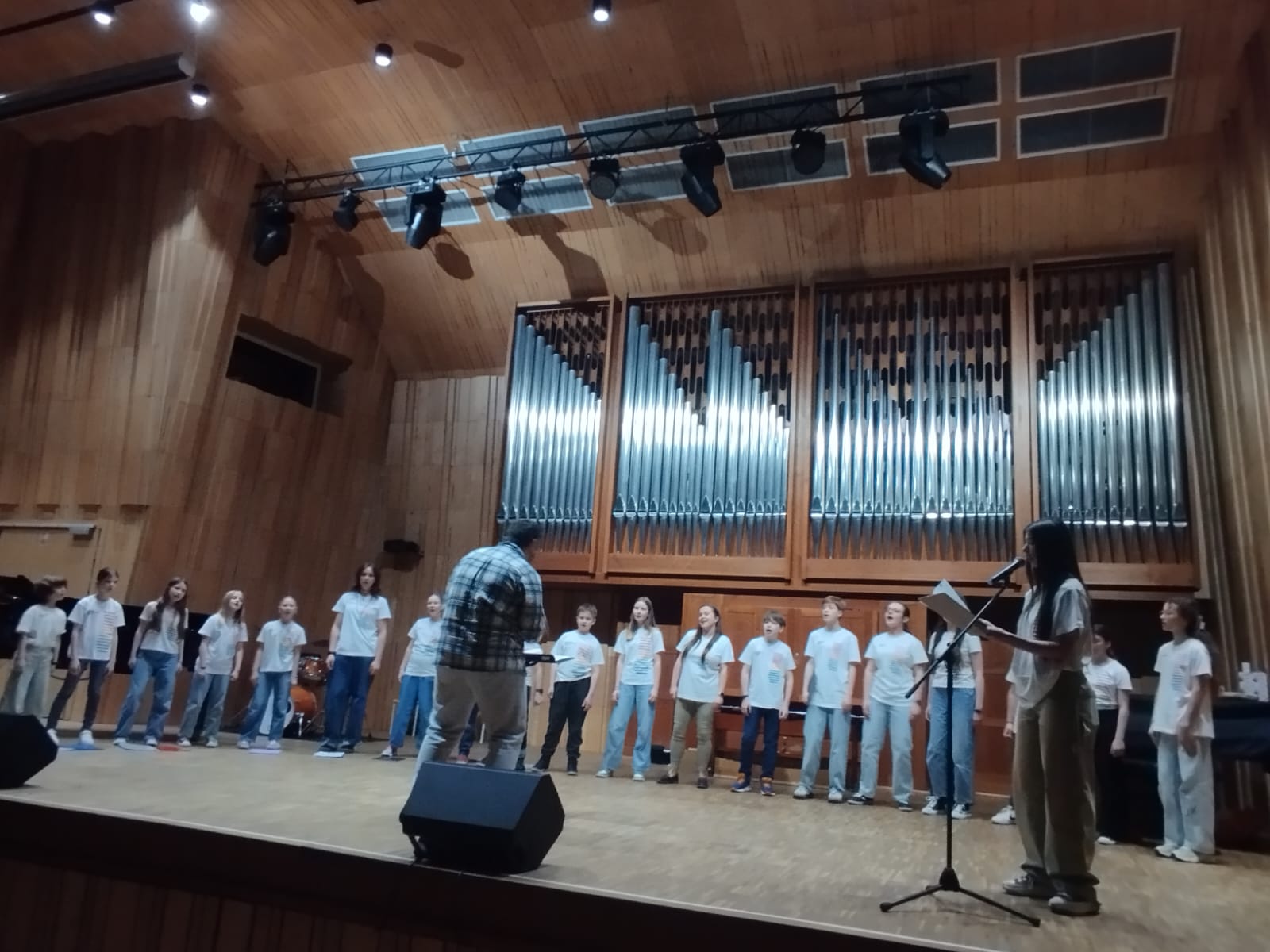 Uczniowie po godzinie 9 zaczęli zbierać się w sali koncertowej, by o 9.30 rozpocząć ciężką, ale jakże owocną i przyjemną pracę:) Pan Sebastian przeprowadził z uczniami różne ćwiczenia emisyjne, połączone z ćwiczeniami rytmicznymi, a nawet ruchowymi. Po rozśpiewaniu, zaczęła się praca nad utworami: Lipka, Keep your lamps, Kukułeczka, O happy Day oraz Django. W przerwach pomiędzy kolejnymi utworami, uczniowie mogli zjeść coś pysznego w bufecie (dziękujemy rodzicom z Rady Rodziców za przygotowanie). Jedzenia i picia nie brakowało - niektórym brakowało za to telefonów, bo opiekunowie zachęcali do niekorzystania z telefonów:)