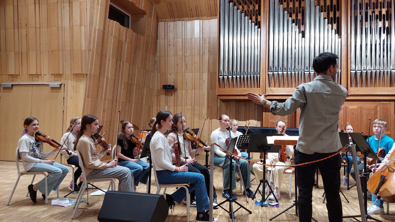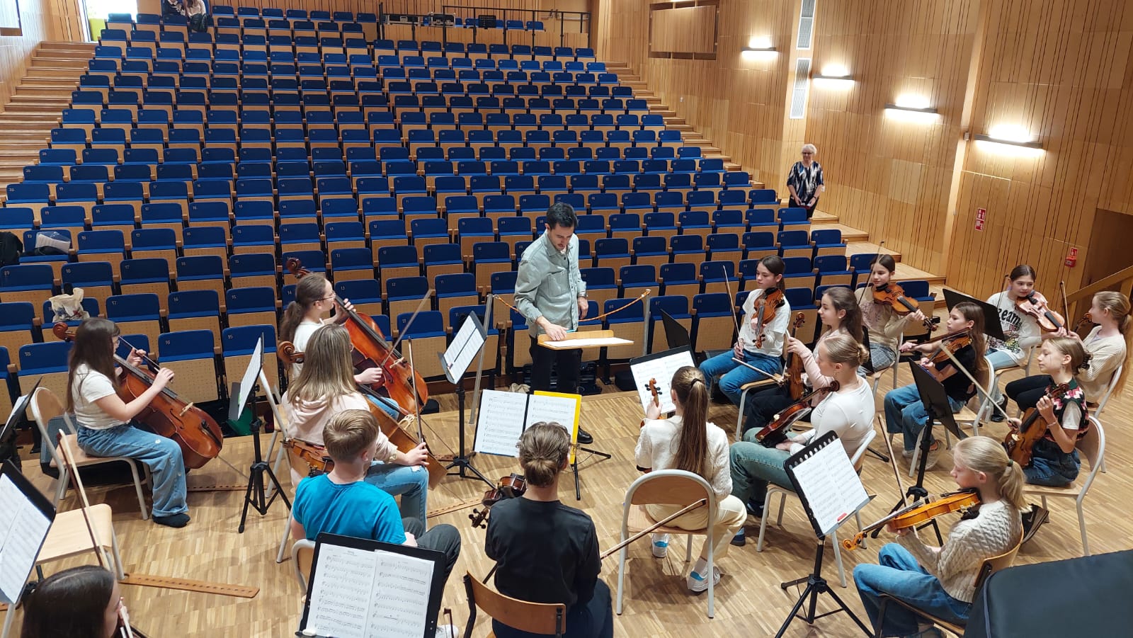 Podobnie jak w zeszłym roku warsztaty dla Zespołu Instrumentów Smyczkowych poprowadził pan Filip Huget. Po zeszłorocznych warsztatach dzieci były tak zachwycone, że same dopytywały czy możemy zaprosić tego samego dyrygenta. I nie dlatego, że praca z nim jest łatwa i przyjemna, wręcz przeciwnie. Pan Filip potrafi zauroczyć uczniów i wprowadzić ich w prawdziwy orkiestrowy świat i pracować z nimi na bardzo wysokim poziomie.