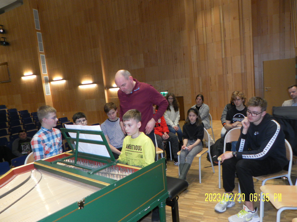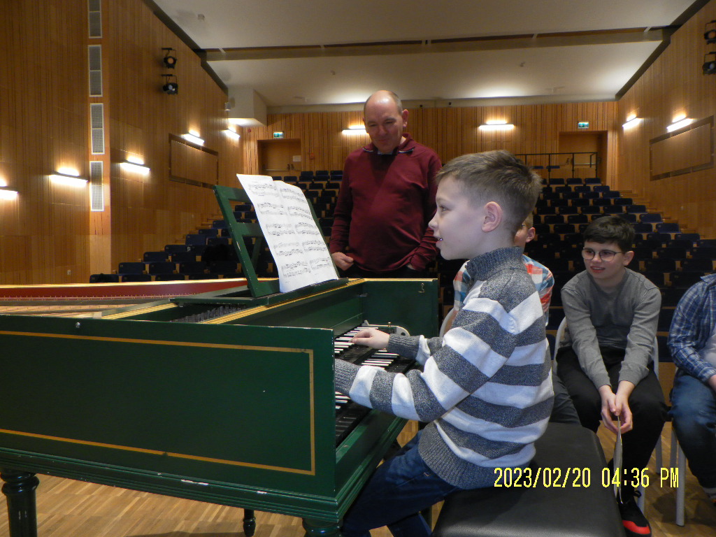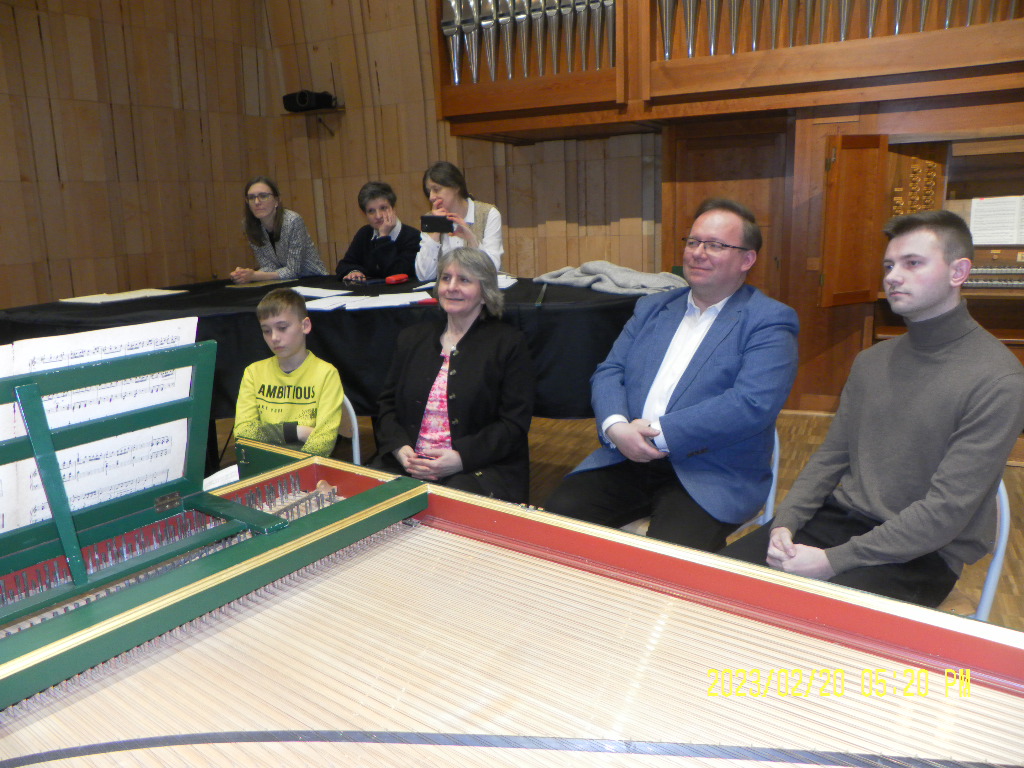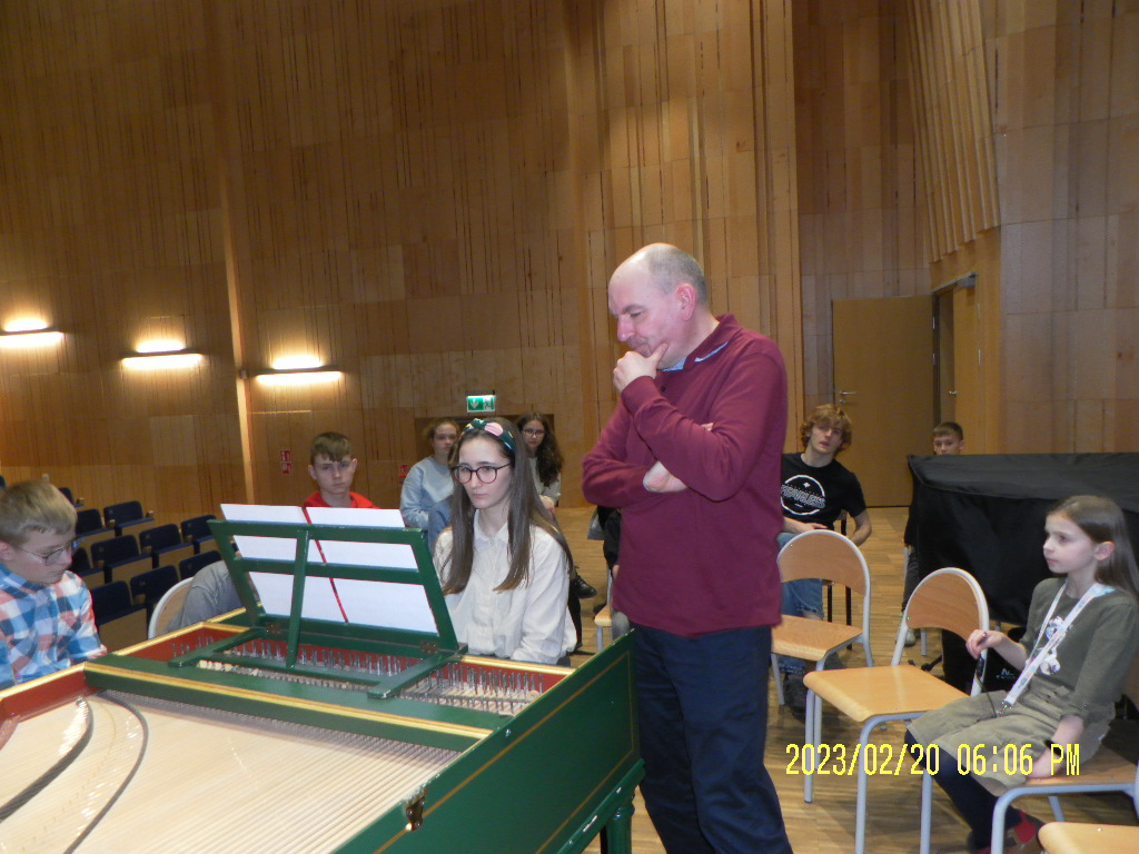 Najpierw prowadzący przedstawił różnicę w budowie klawesynu i fortepianu, a potem aktywni uczestnicy mieli okazję zagrać utwory ze swojego repertuaru na klawesynie typu francuskiego, który przywiózł ze sobą Pan Marek Pilch.