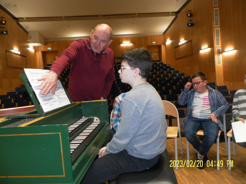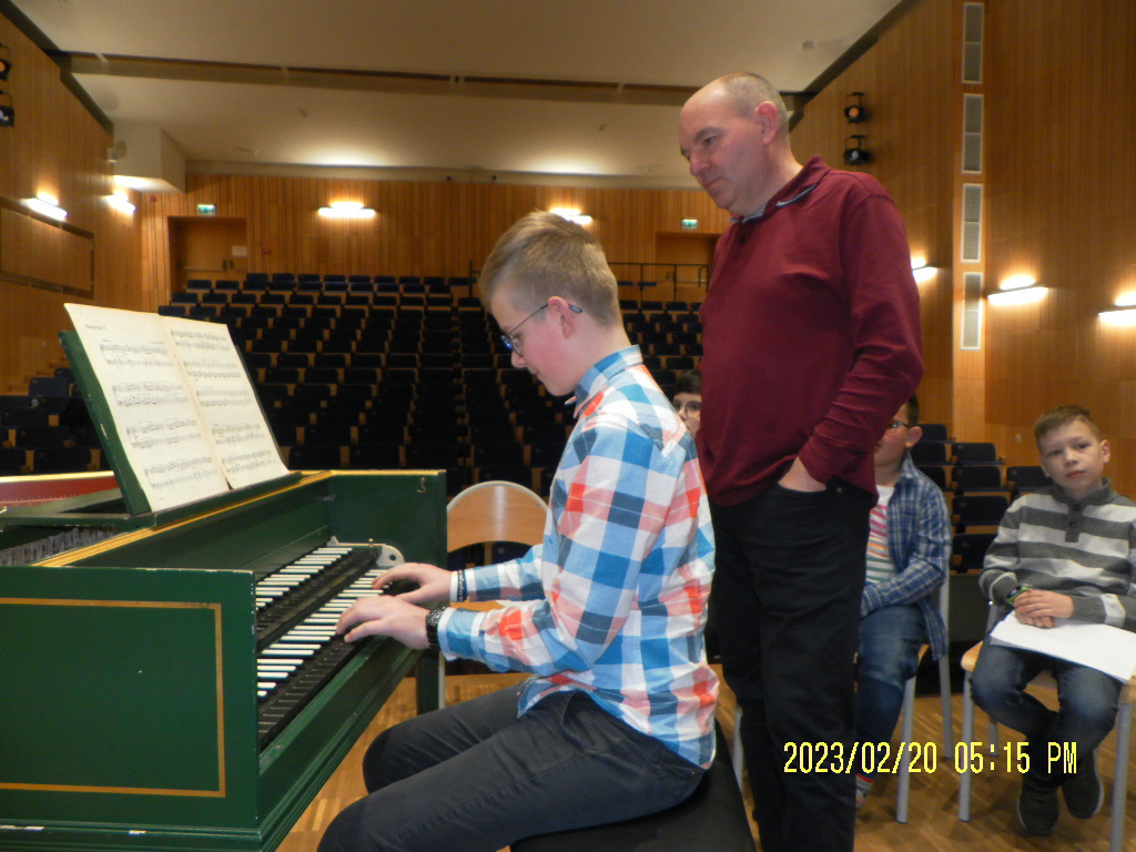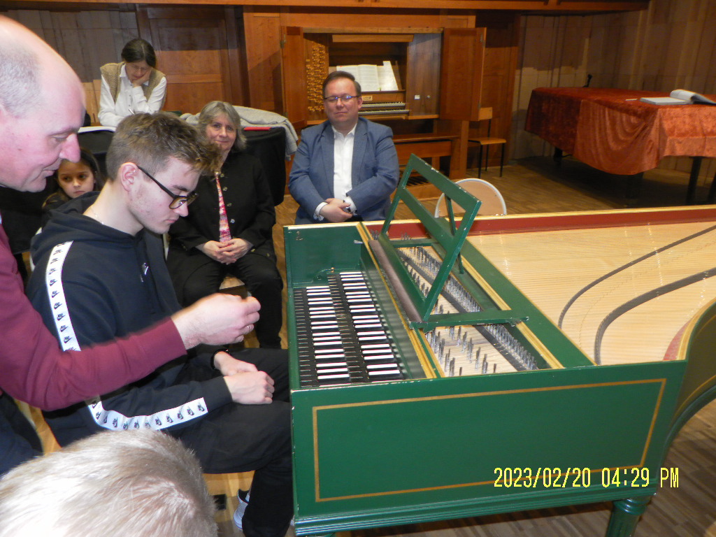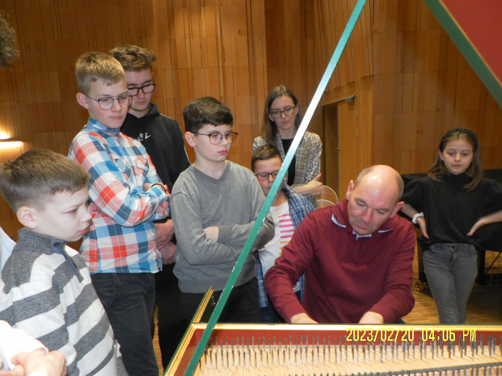 Najpierw prowadzący przedstawił różnicę w budowie klawesynu i fortepianu, a potem aktywni uczestnicy mieli okazję zagrać utwory ze swojego repertuaru na klawesynie typu francuskiego, który przywiózł ze sobą Pan Marek Pilch.