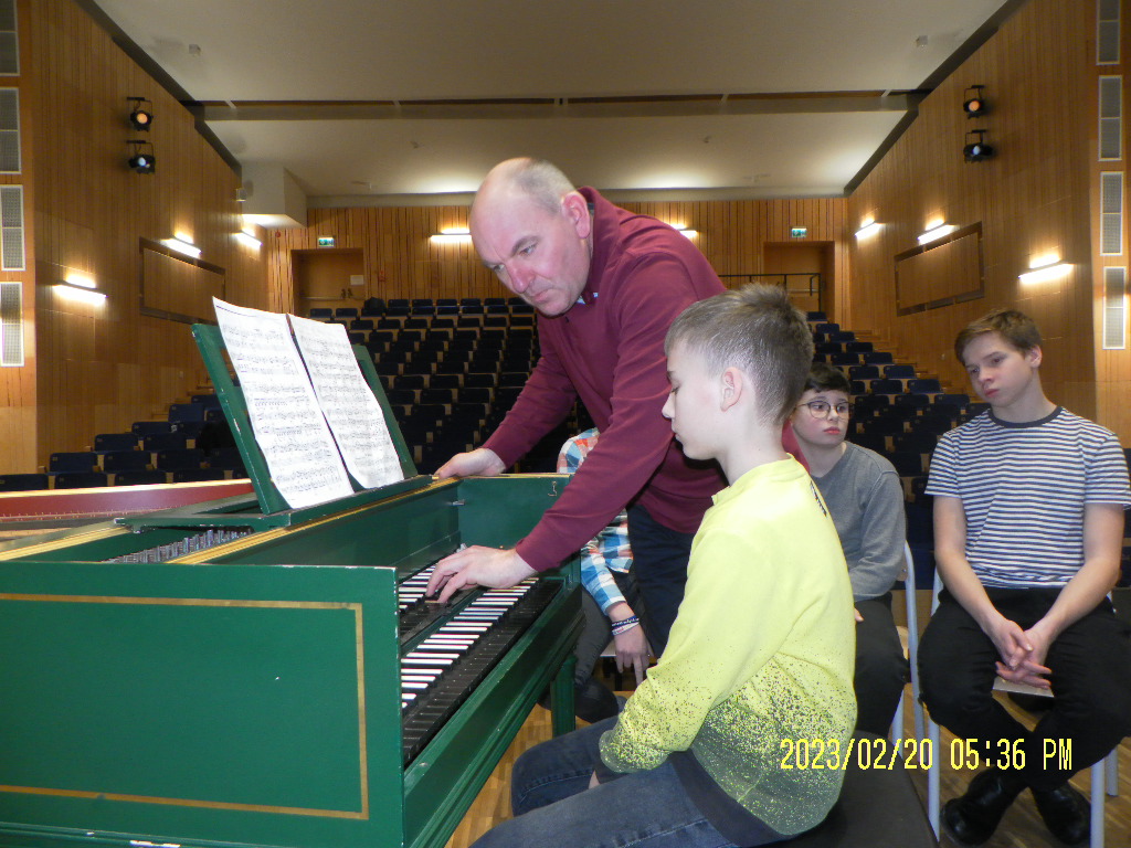 Wczoraj, tj. 20.02.2023 r., odbyły się w naszej szkole warsztaty klawesynowe, prowadzone przez dr hab. Marka Pilcha, kierownika Katedry Klawesynu i Historycznych Praktyk Wykonawczych na Akademii Muzycznej im. Karola Szymanowskiego w Katowicach. Prowadzący gra na historycznych instrumentach klawiszowych: organach, klawesynach i fortepianach historycznych - solo i w zespołach muzyki dawnej oraz prowadzi własny zespół „Trio Brillante” wykonując muzykę przełomu klasycyzmu i romantyzmu na własnym fortepianie stołowym z XIX wieku.