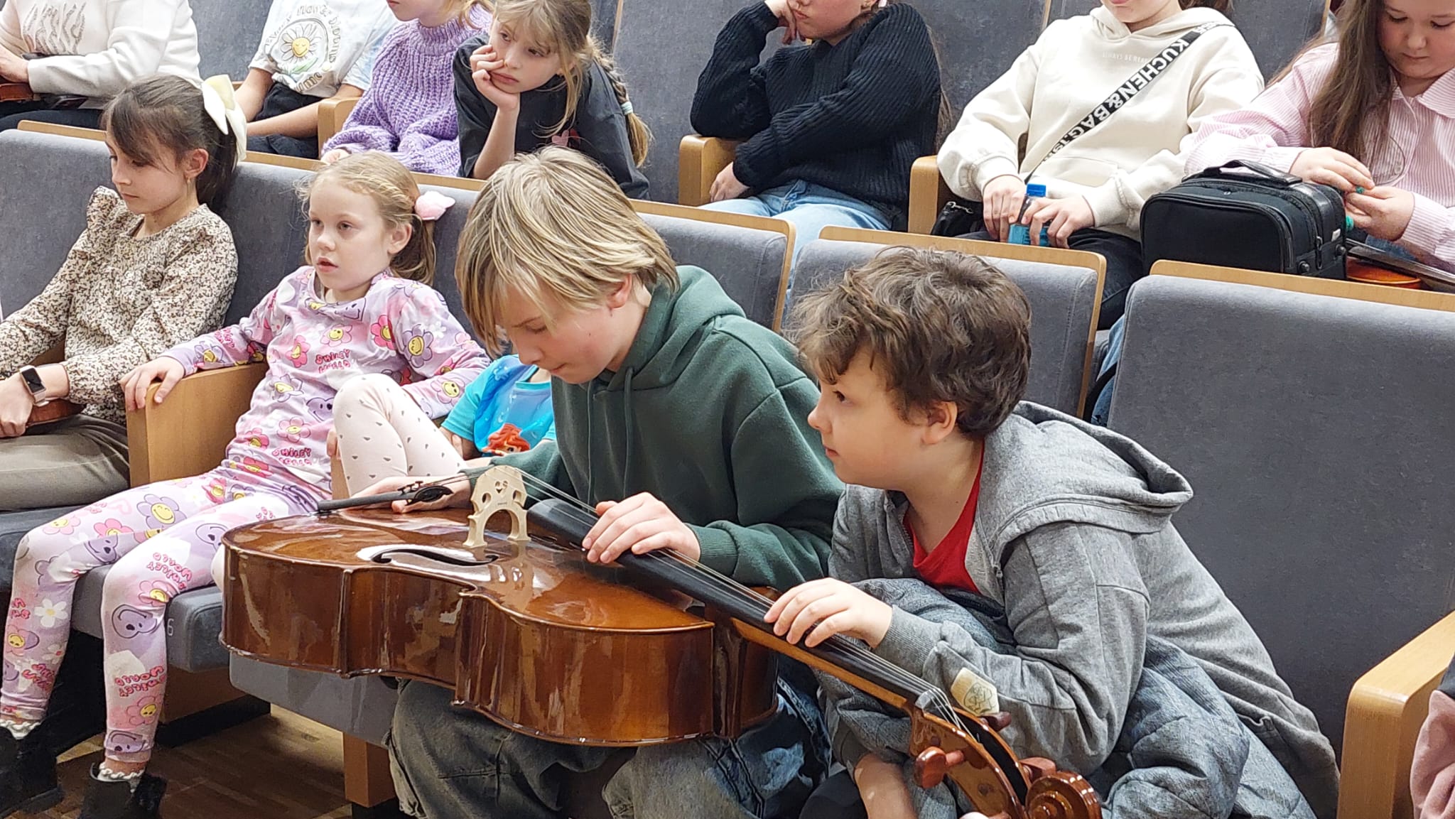 W trosce o zdrową postawę i wygodę gry, znalazł się również czas na indywidualne dopasowanie podbródków i żeberek naszym młodym skrzypkom i skrzypaczkom. A w poszukiwaniu luzu i swobody sprawdziło się ćwiczenie à la leniwiec oraz traktowanie instrumentu jak kota Filemona.
