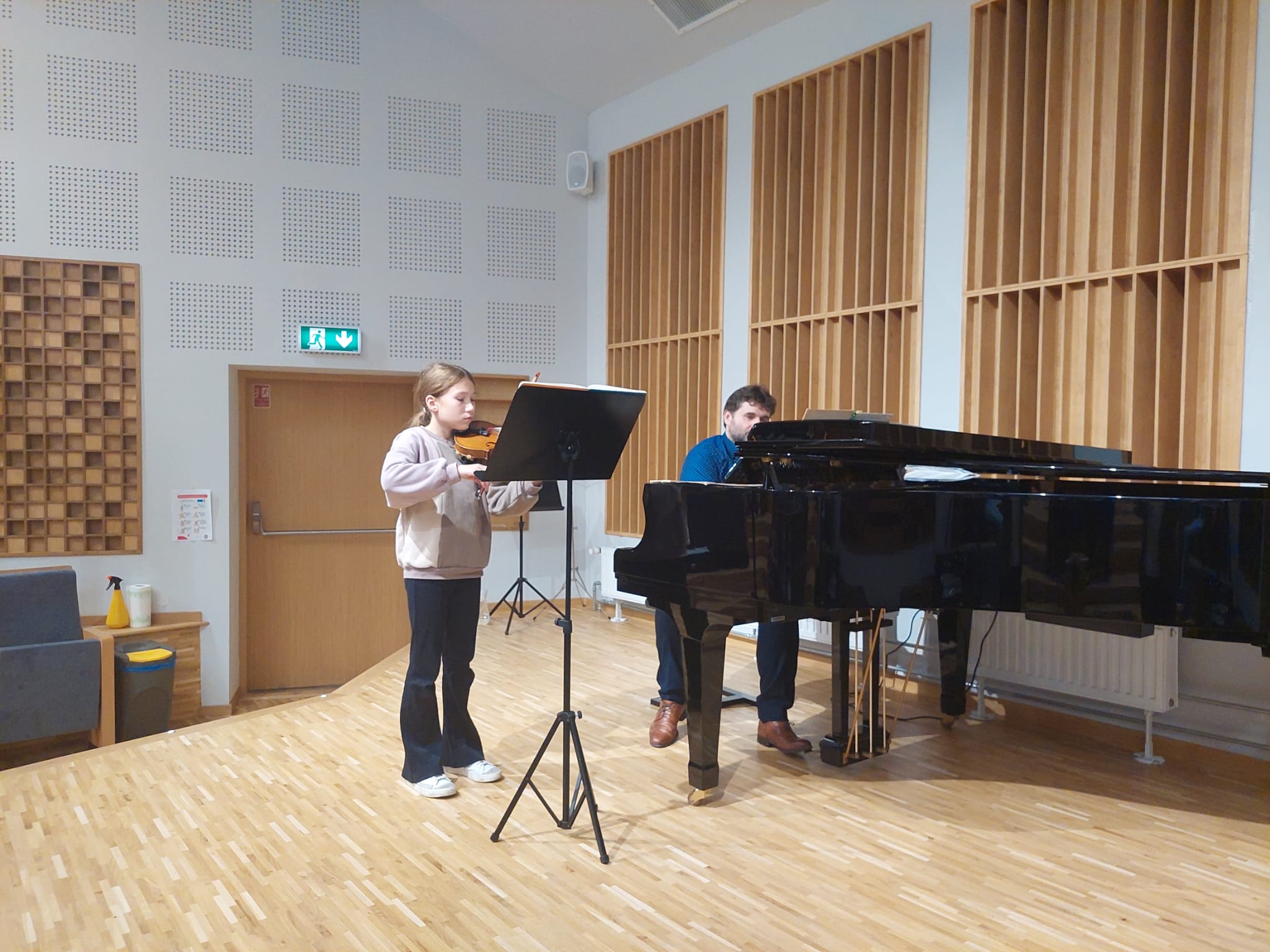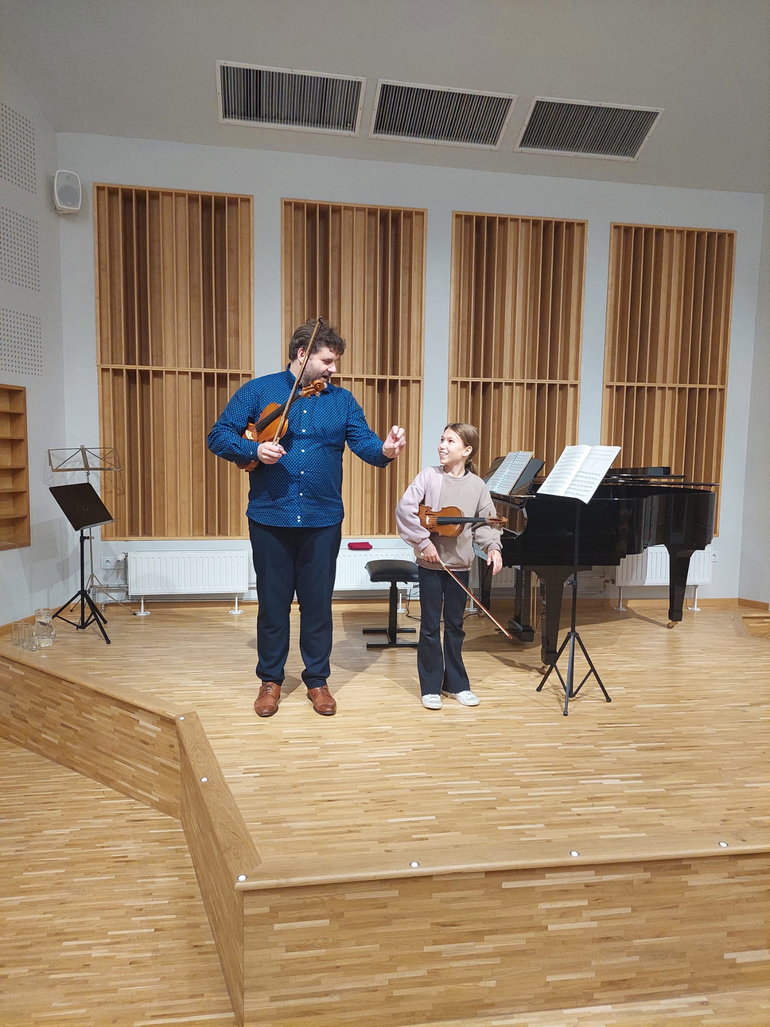Warsztaty skrzypcowe z dr hab. Adamem Mokrusem odbyły się 6 listopada 2023 r., w bardzo przyjaznej i luźnej atmosferze. Zgromadziły prawie wszystkich uczniów skrzypiec naszej szkoły. Pan Adam Mokurs dużą uwagę zwrócił na to, jak ważna w grze na skrzypcach jest odwaga i pewność siebie na scenie. Ta umiejetność pomaga w występach publicznych, które są nieodzowną częścią nauki gry na instrumencie. Kolejnym aspektem, nad którym pracował Pan Adam Mokurs jest postawa - prawidłowe trzymanie instrumentu. Zwrócił także uwagę, aby jak najszybciej uczyć dzieci samodzielnego strojenia skrzypiec. Warsztaty trwały długo, lecz nie można było się na nich nudzić, gdyż pan Adam Mokrus opowiadał różne ciekawe anegdoty i historie, które rozbawiały wszystkich. Było to bardzo ciekawe doświadczenie, które uczniowie na pewno zapamiętają na długo.