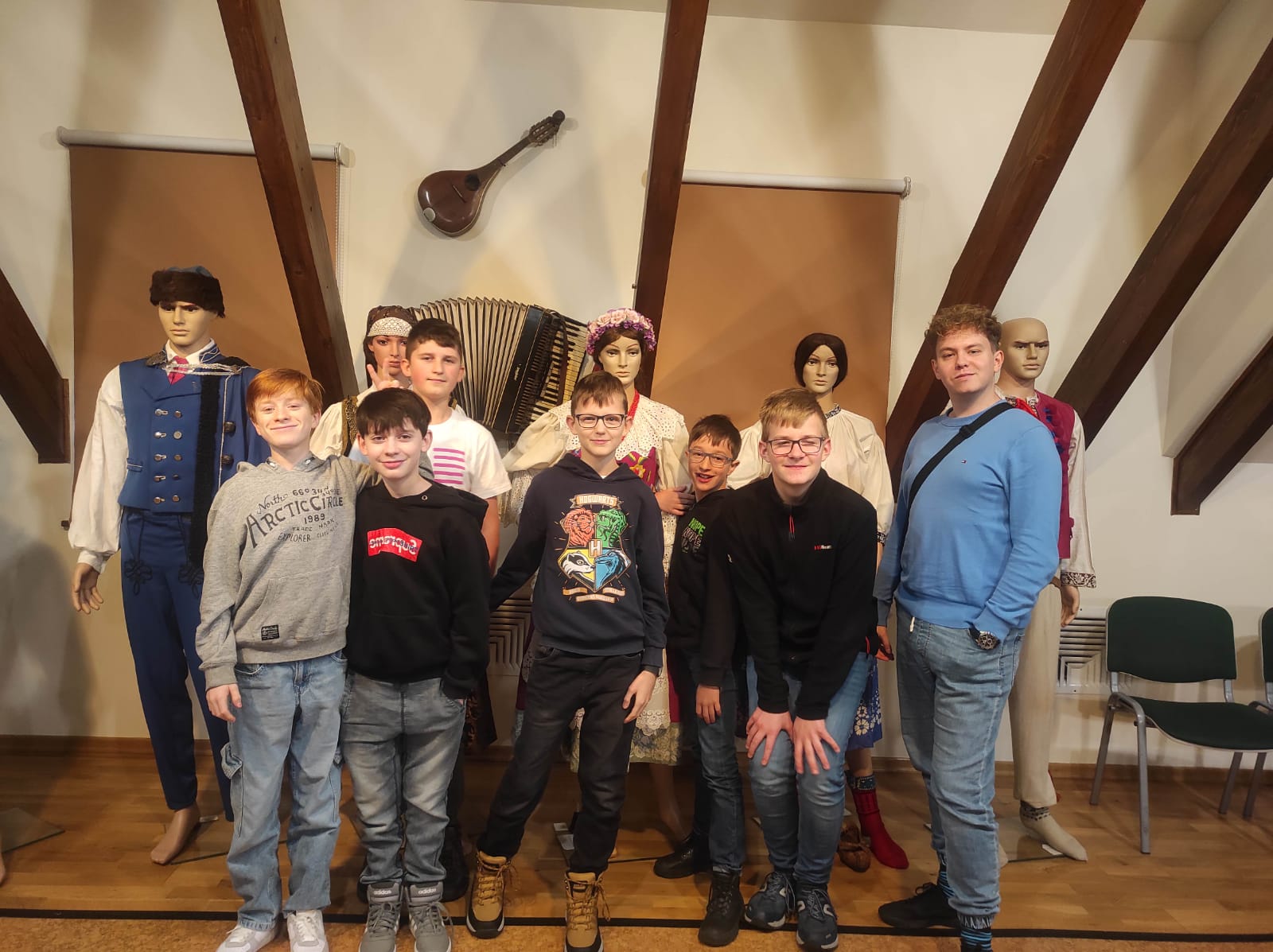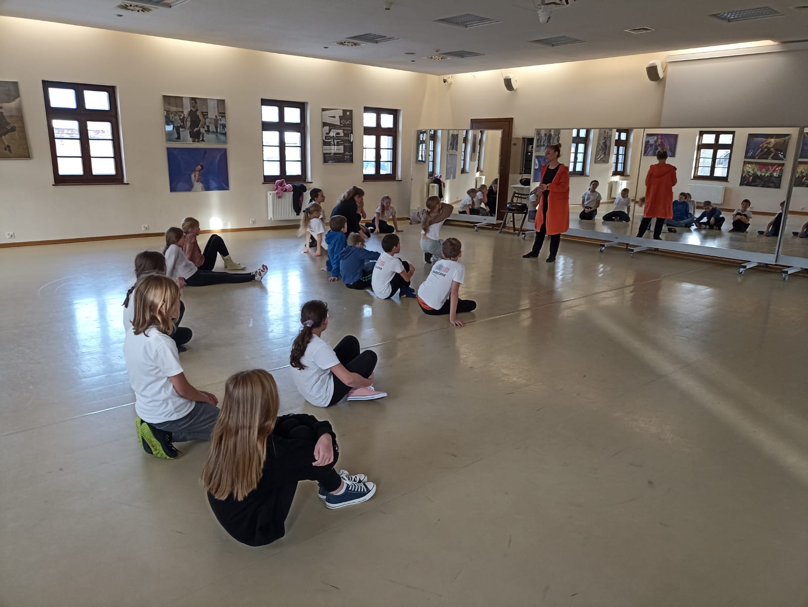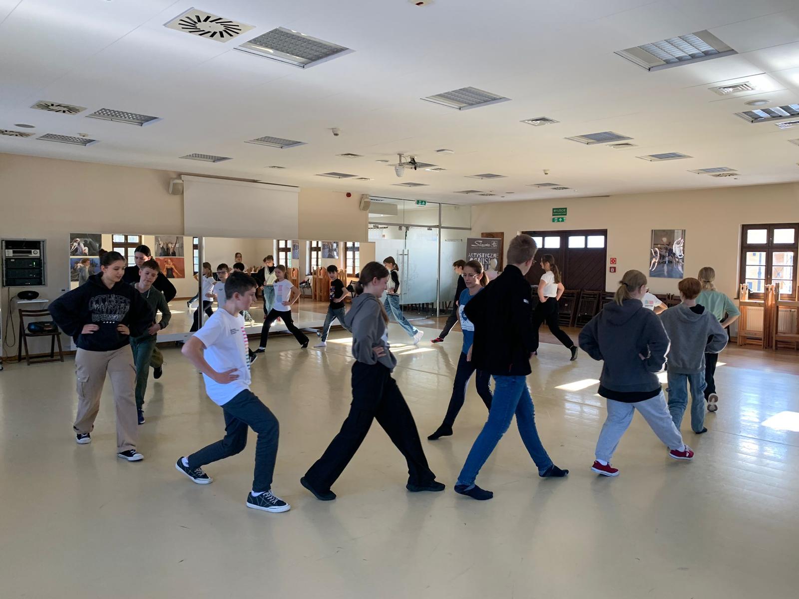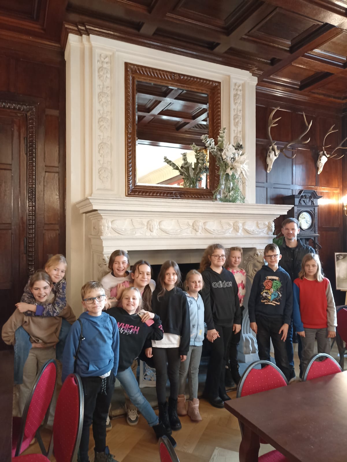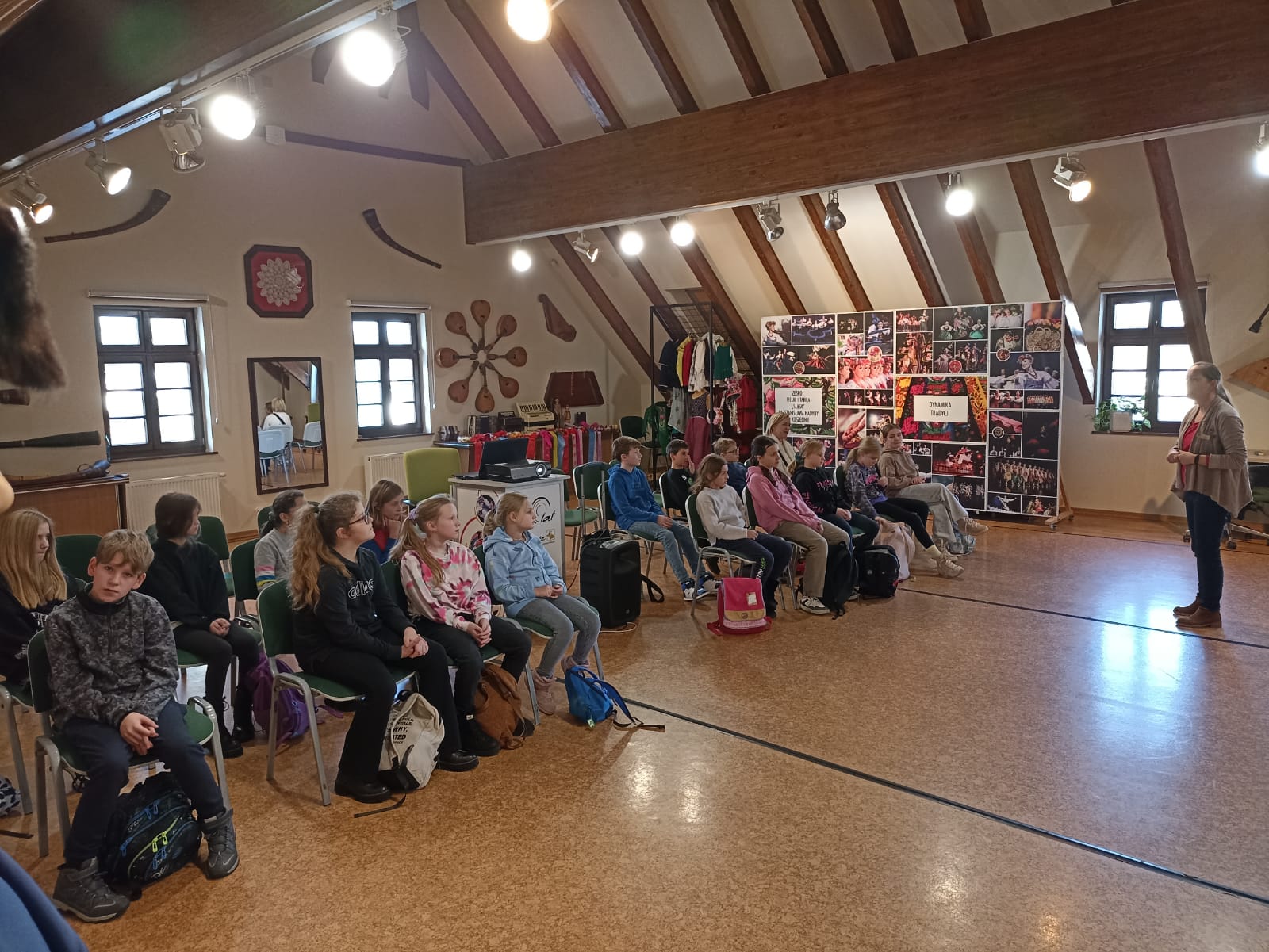 Poniedziałek, 27 listopada 2023 r., to pierwsze chwile pięknej zimowej aury tej jesieni. To również dzień, w którym odbyliśmy owocny wyjazd na warsztaty polskich tańców narodowych. Spędziliśmy cały dzień w pałacu w Koszęcinie, siedzibie Zespołu Pieśni i Tańca "Śląsk". Od rana do wieczora mieliśmy możliwość oglądać na żywo próby muzyków, ćwiczyć kroki poloneza i krakowiaka. Podczas zwiedzania wnętrz pałacowych poznaliśmy bogaty życiorys Stanisława Hadyny (założyciela), zwyczaje i stroje naszego regionu oraz historię całego zespołu (chóru, baletu i orkiestry), a także interesujące komnaty, salę balową i zbiory zabytkowego kompleksu pałacowego w Koszęcinie. Serdecznie dziękujemy pracownikom i instruktorom Zespołu Pieśni i Tańca "Śląsk" za miłą gościnę i organizację całego pobytu. Dziękujemy także za opiekę i organizację wyjazdu naszej pani Basi, panu Krystianowi, panu Piotrowi i pani Ani. Zapewne niejednokrotnie będziemy wracać pamięcią do tych radosnych chwil spędzonych na kolejnym wyjeździe w gronie naszych kolegów i koleżanek z raciborskiej szkoły muzycznej.