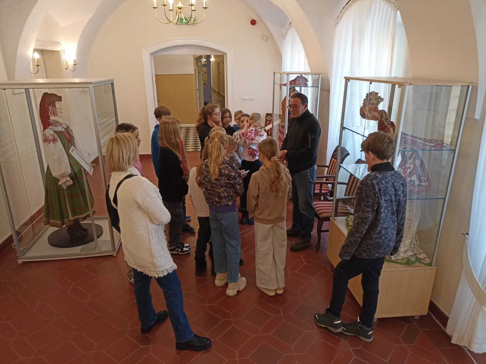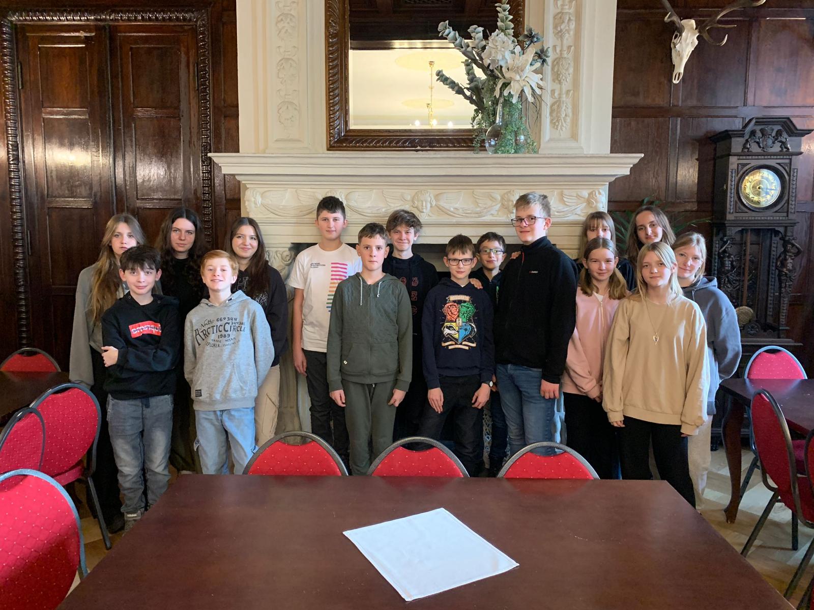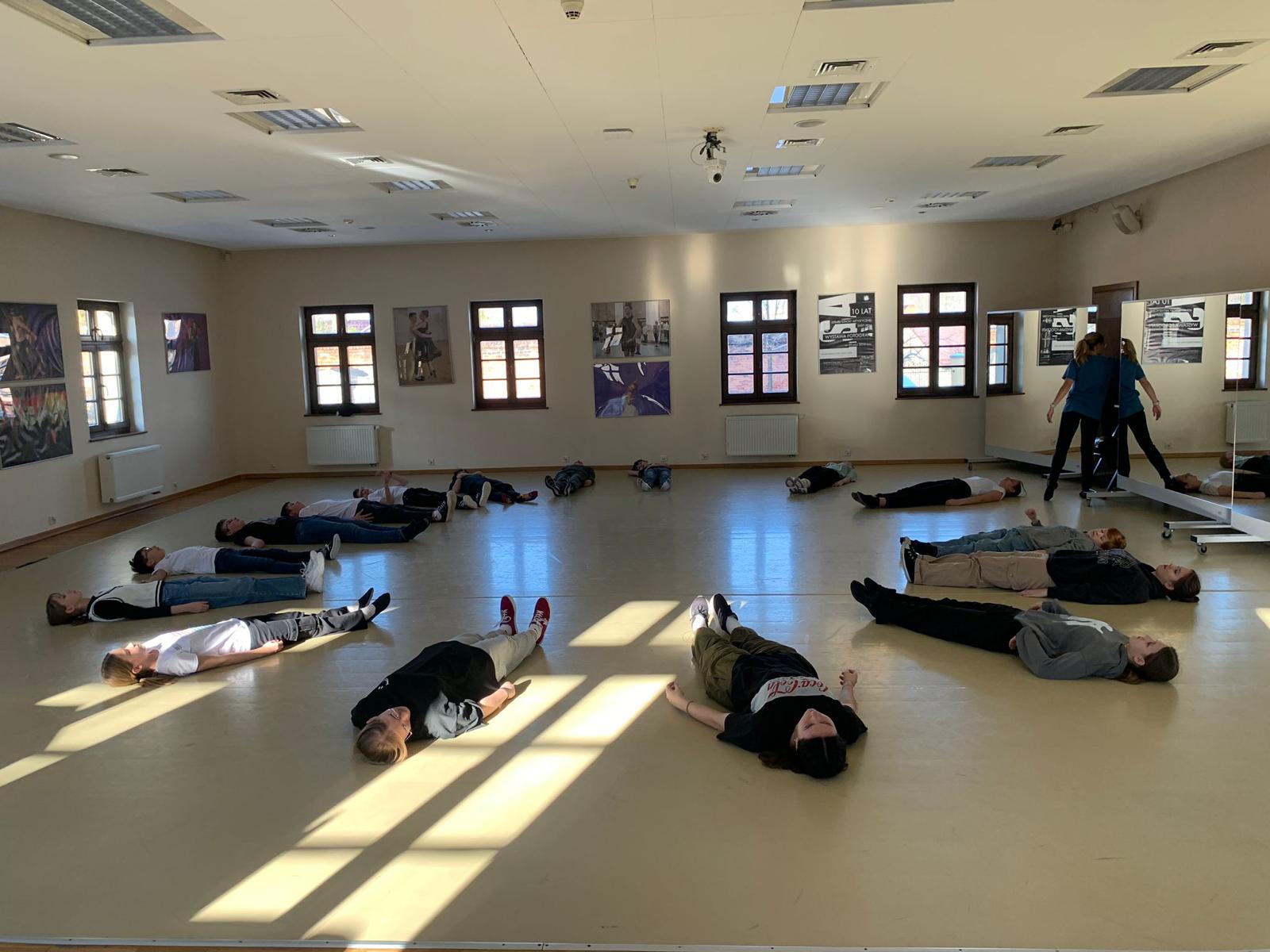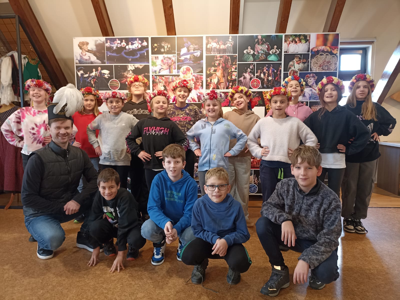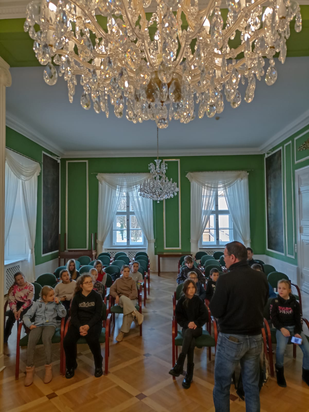 Poniedziałek, 27 listopada 2023 r., to pierwsze chwile pięknej zimowej aury tej jesieni. To również dzień, w którym odbyliśmy owocny wyjazd na warsztaty polskich tańców narodowych. Spędziliśmy cały dzień w pałacu w Koszęcinie, siedzibie Zespołu Pieśni i Tańca "Śląsk". Od rana do wieczora mieliśmy możliwość oglądać na żywo próby muzyków, ćwiczyć kroki poloneza i krakowiaka. Podczas zwiedzania wnętrz pałacowych poznaliśmy bogaty życiorys Stanisława Hadyny (założyciela), zwyczaje i stroje naszego regionu oraz historię całego zespołu (chóru, baletu i orkiestry), a także interesujące komnaty, salę balową i zbiory zabytkowego kompleksu pałacowego w Koszęcinie. Serdecznie dziękujemy pracownikom i instruktorom Zespołu Pieśni i Tańca "Śląsk" za miłą gościnę i organizację całego pobytu. Dziękujemy także za opiekę i organizację wyjazdu naszej pani Basi, panu Krystianowi, panu Piotrowi i pani Ani. Zapewne niejednokrotnie będziemy wracać pamięcią do tych radosnych chwil spędzonych na kolejnym wyjeździe w gronie naszych kolegów i koleżanek z raciborskiej szkoły muzycznej.