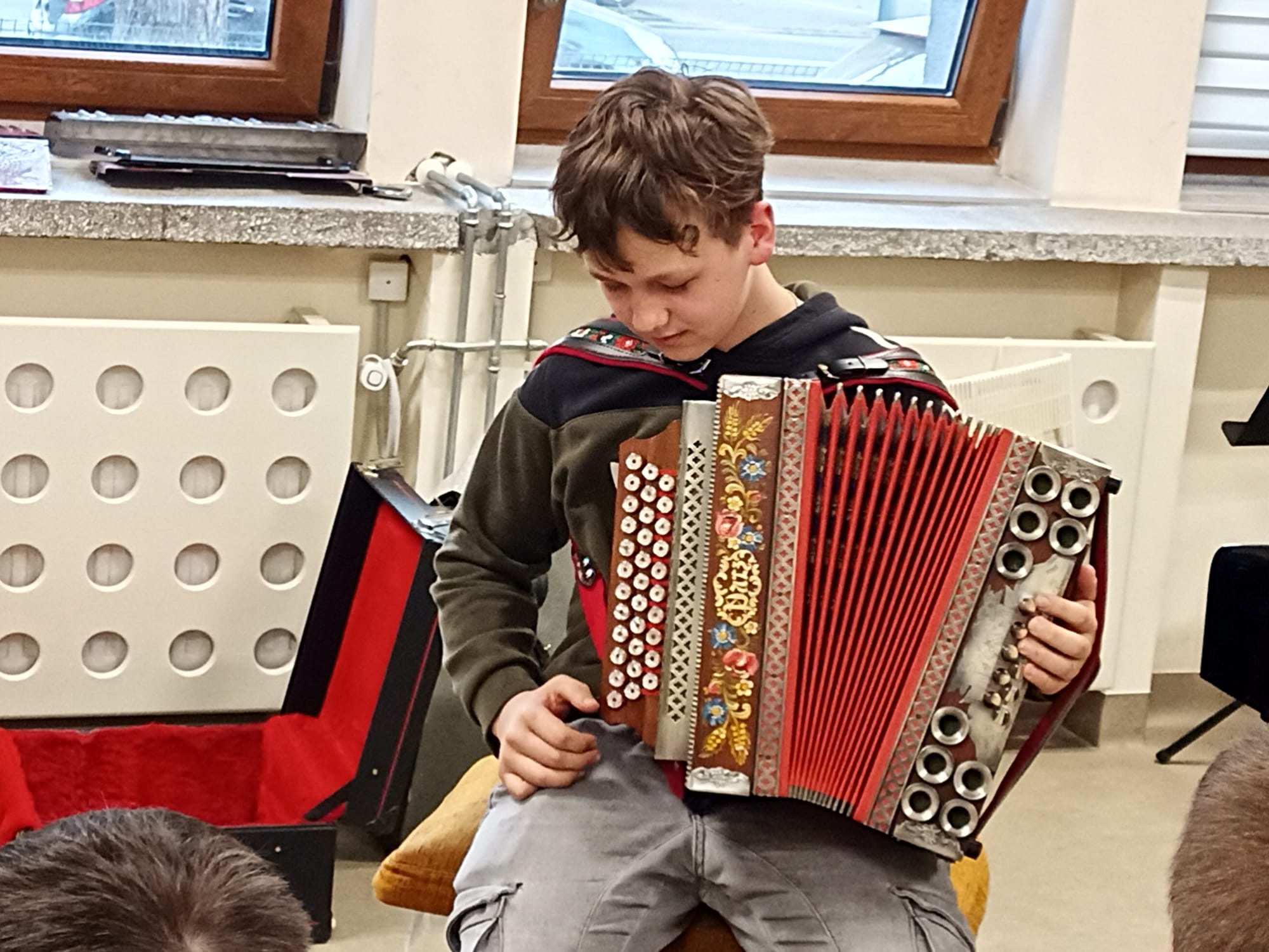 Niespodzianką spotkania była przyniesiona przez prowadzącego heligonka. Jest to tradycyjny instrument ludowy (rodzaj akordeonu diatonicznego), charakterystyczny dla kultury Beskidów, Słowacji i Czech, który wyróżnia się mniejszym rozmiarem oraz specyficznym brzmieniem. Każdy z uczniów mógł spróbować gry na heligonce, jednak odmienny diatoniczny system dźwiękowy – w przeciwieństwie do chromatycznego akordeonu, na którym uczą się w szkole – okazał się sporym wyzwaniem. System diatoniczny polega na tym, że przy rozciąganiu i ściskaniu miecha instrument wydaje różne dźwięki, podczas gdy w akordeonie chromatycznym przy obu ruchach miecha uzyskuje się ten sam dźwięk.