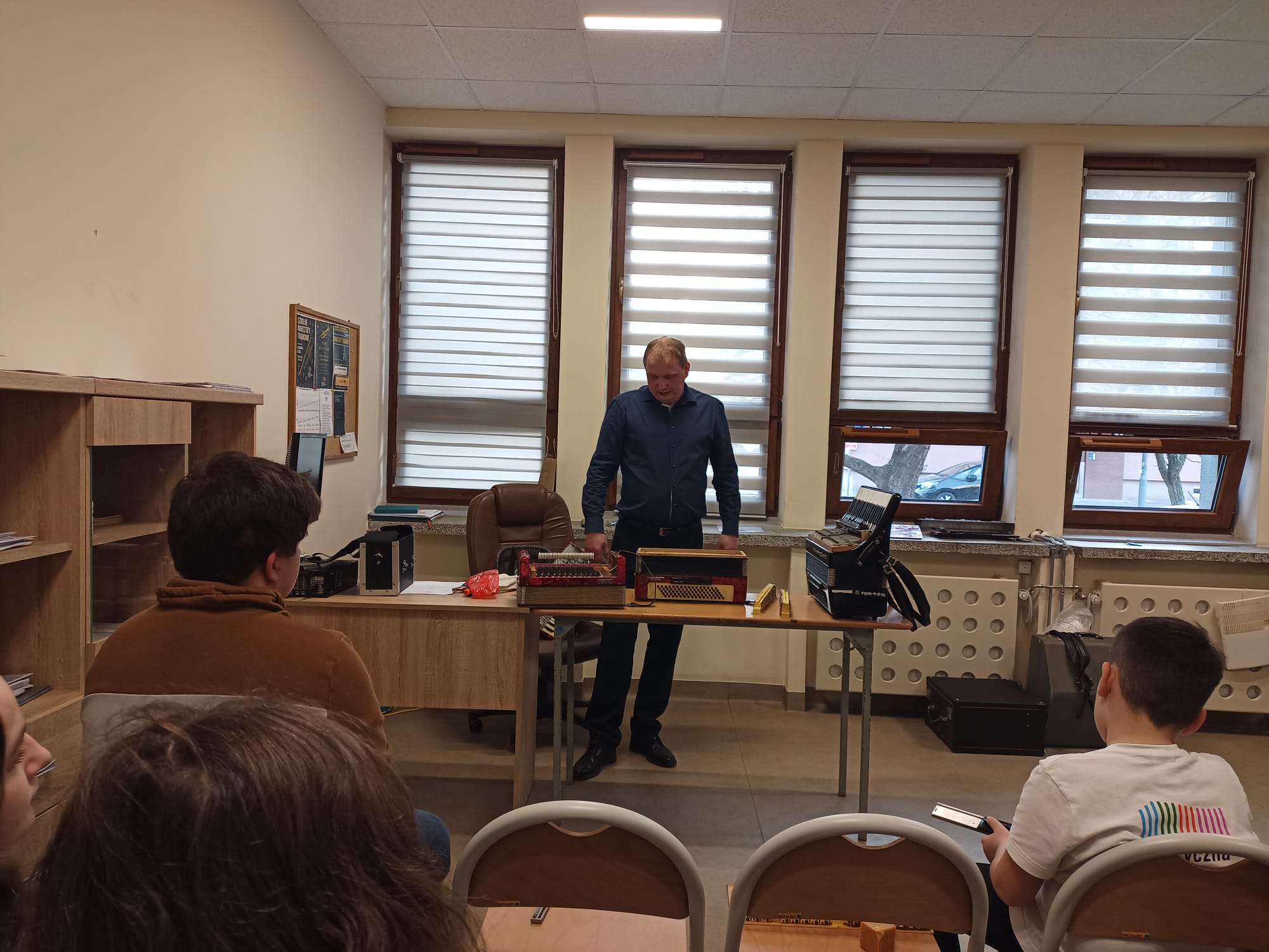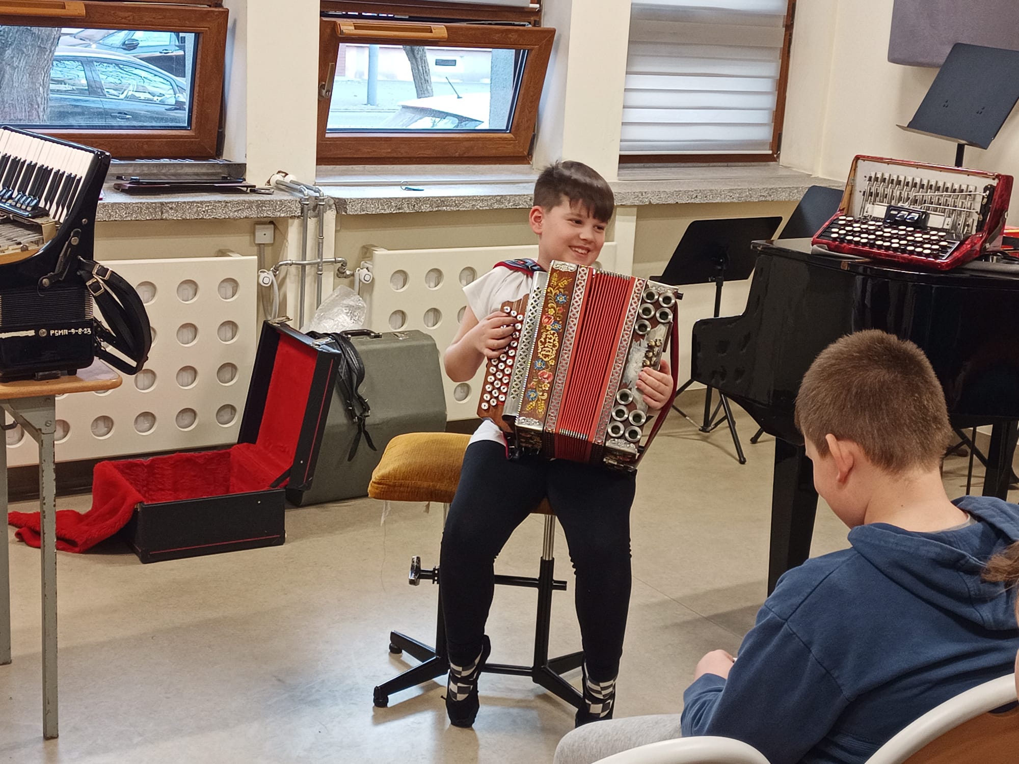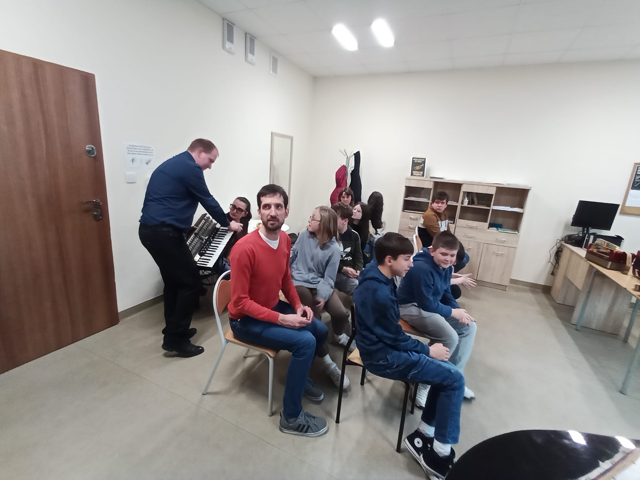 1 marca 2026 r. w naszej szkole odbyły się warsztaty z budowy akordeonu, które poprowadził p. Adrian Pieniak. Prowadzący bardzo szczegółowo zaprezentował „wnętrze” akordeonu oraz wyjaśnił działanie poszczególnych części na przykładzie trzech instrumentów: klawiszowego, guzikowego oraz koncertowego, wyjaśniając przy tym znaczenie zastosowania kanału. Uczniowie, a także obecni na warsztatach rodzice, mogli z bliska przyjrzeć się elementom tego skomplikowanego instrumentu, jakim jest akordeon, a także spróbować wydobyć dźwięk z podarowanego im przez p. Adriana stroika. Pan Adrian opowiadał także o najczęstszych usterkach pojawiających się w akordeonach, warunkach, w jakich instrument powinien być użytkowany, oraz o własnych doświadczeniach związanych z jego naprawą.