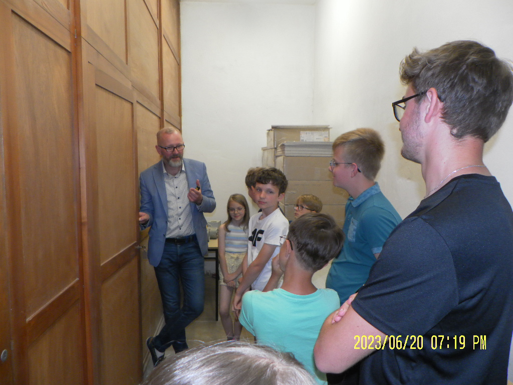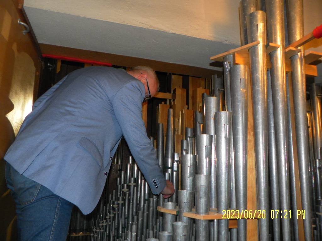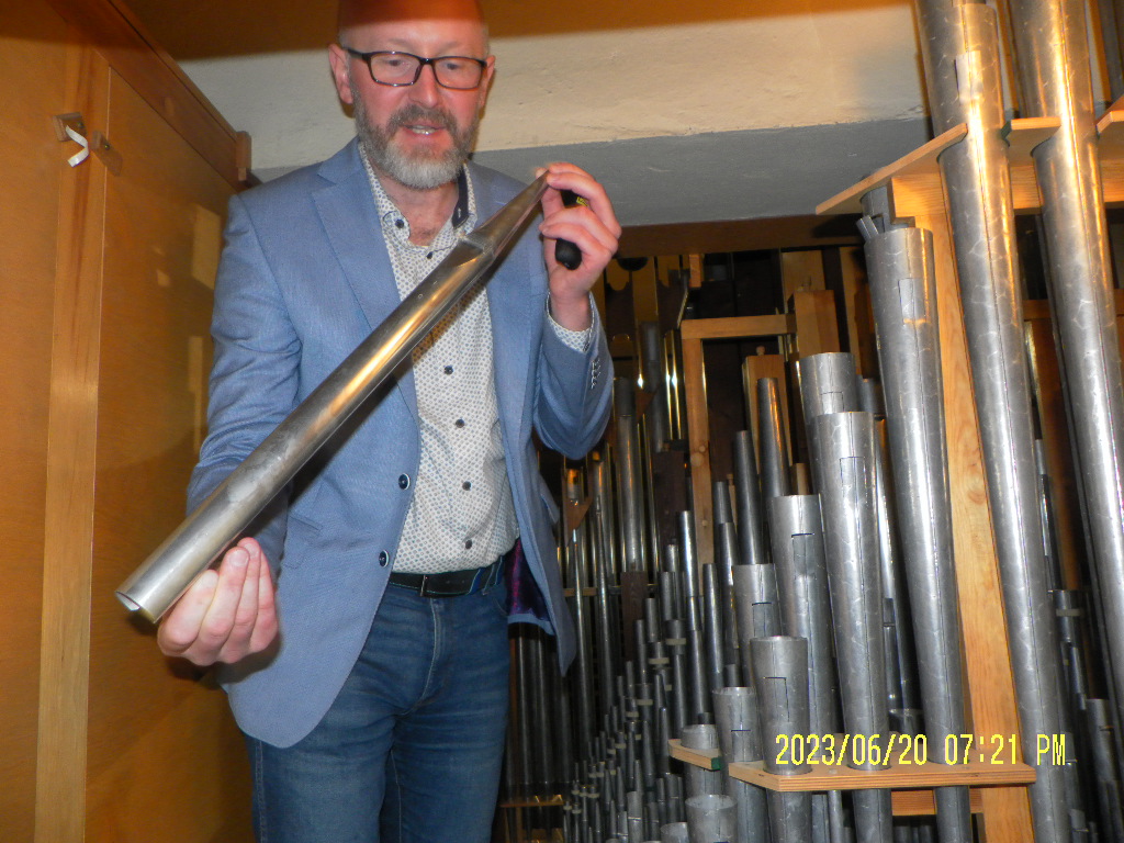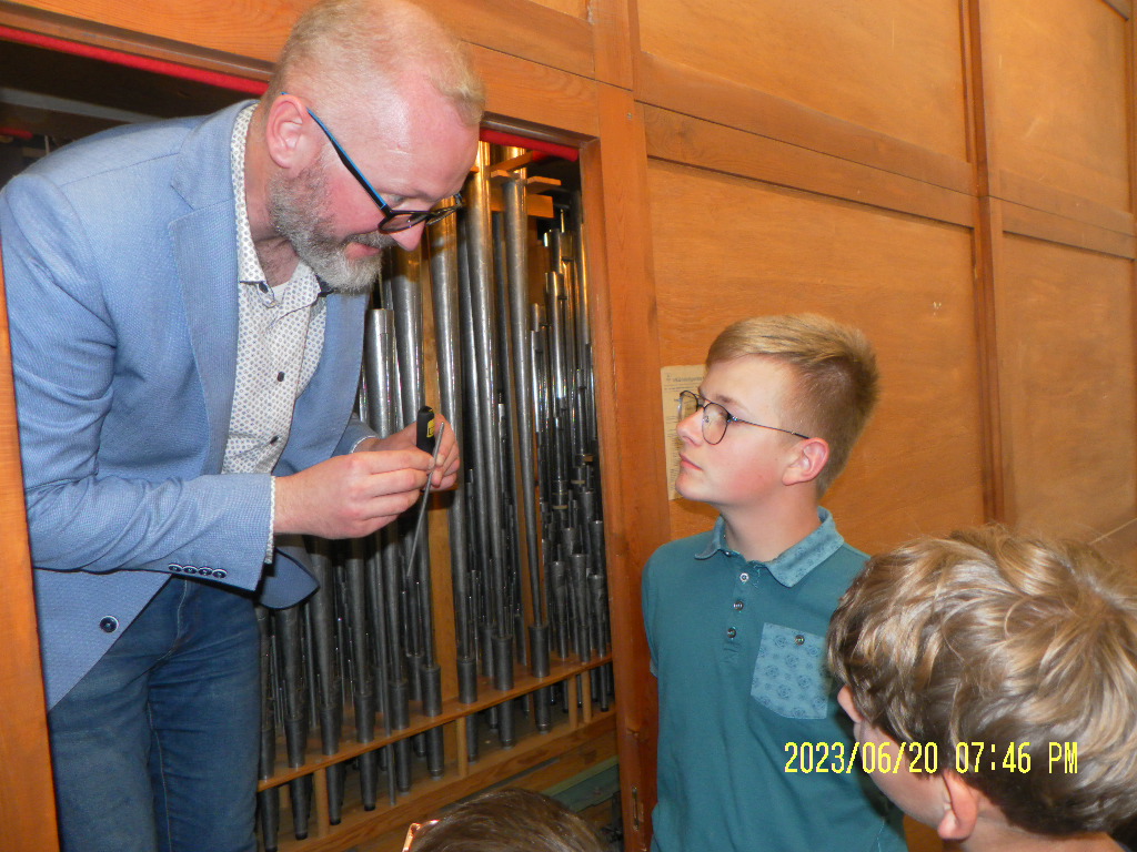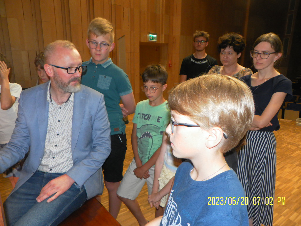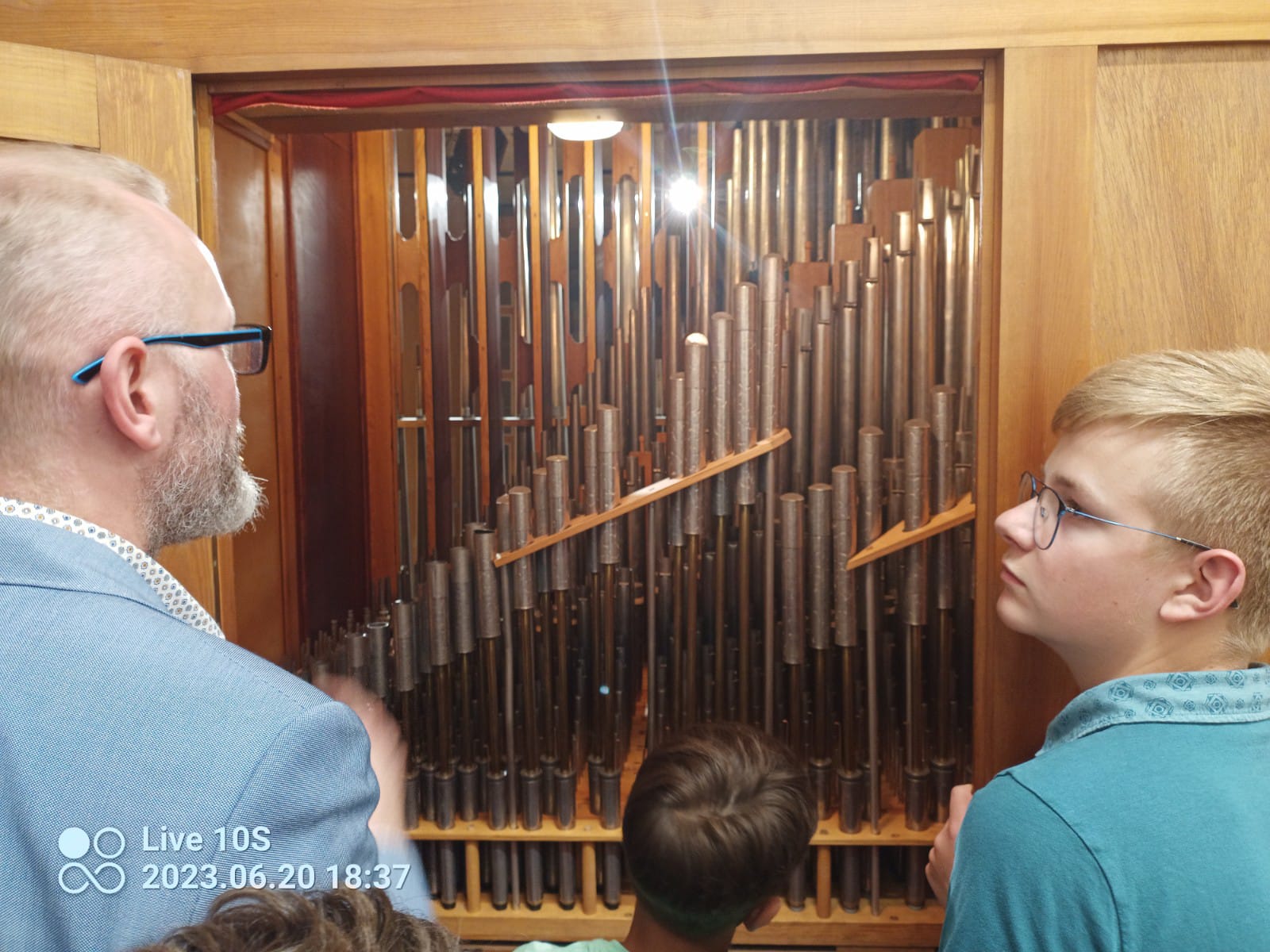 Podczas warsztatów z wielkim profesjonalizmem przedstawił zgromadzonej w sali publiczności proces budowy organów oraz etapy pracy renowacji naszych organów po termomodernizacji szkoły, opierając się na prezentacji slajdów. Następnie uczniowie mogli zobaczyć i dotknąć narzędzi używanych w pracowni organmistrzowskiej. które nasz gość przyniósł ze sobą. Kolejnym etapem było podejście do kontuaru organów i wyjaśnienie zasady działania tzw. stołu gry czyli manuałów, pedału oraz rodzaju rejestrów. Na koniec uczniowie mogli zobaczyć wnętrze organów czyli zaplecze tego ogromnego – liczącego setki tysięcy elementów – mechanizmu, na który składają się organy. Zaplecze organów mieści się za salą koncertową, ale wejść do nich może tylko jedna osoba – nie tylko ze względu na brak miejsca , ale i na niebezpieczeństwo zniszczenia tego misternie ułożonego mechanizmu.