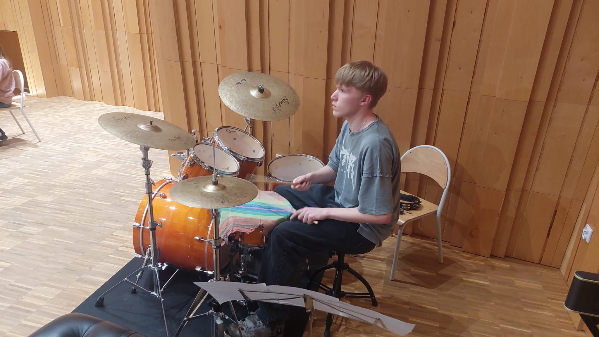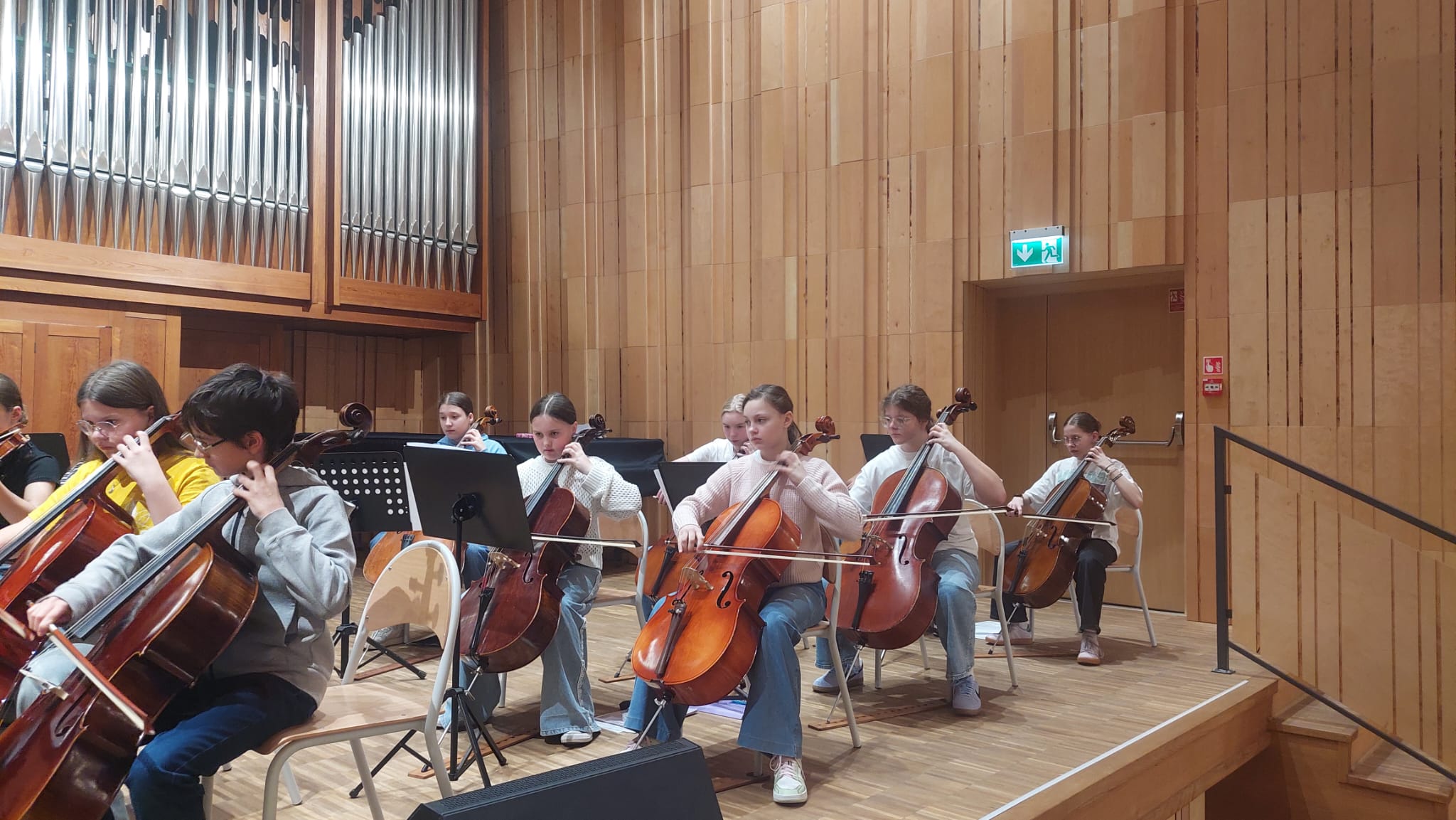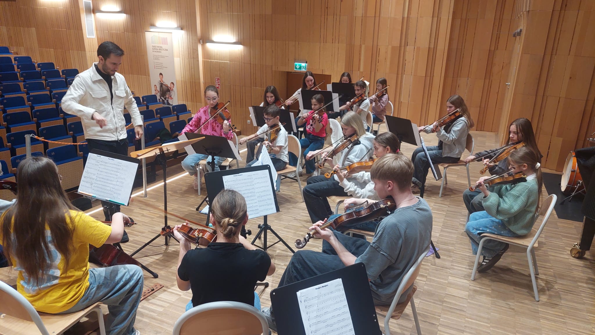 Punktualnie o 9:30 rozpoczęła się praca nad wybranym repertuarem. Smyczki poszły w ruch. Było dużo skupienia, powtarzania, notowania. Ale było tez wesoło i z uśmiechem, ponieważ pan dyrygent zarażał wszystkich dobrą energią. Uczniowie pracowali nad czterema utworami: „Filipino Song”, „Hungary Mungary”, „Stringe of Fire” i „Wheels of Fury”. Ten ostatni najdłuższy i najtrudniejszy – wymagał najwięcej pracy i skupienia. I właśnie w tym utworze jeden ze skrzypków „porzaucał” swoje stanowisko i oddawał się swojej drugiej ( a może pierwszej?) pasji czyli perkusji.