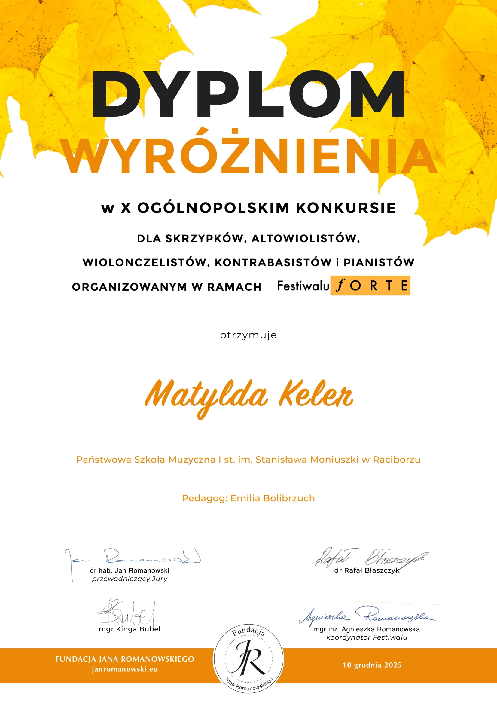 w X Ogólnopolskim Konkursie oragnizowanym w ramach Festiwalu Forte, który odbył się w edycji w dniu 24.11.2025 .