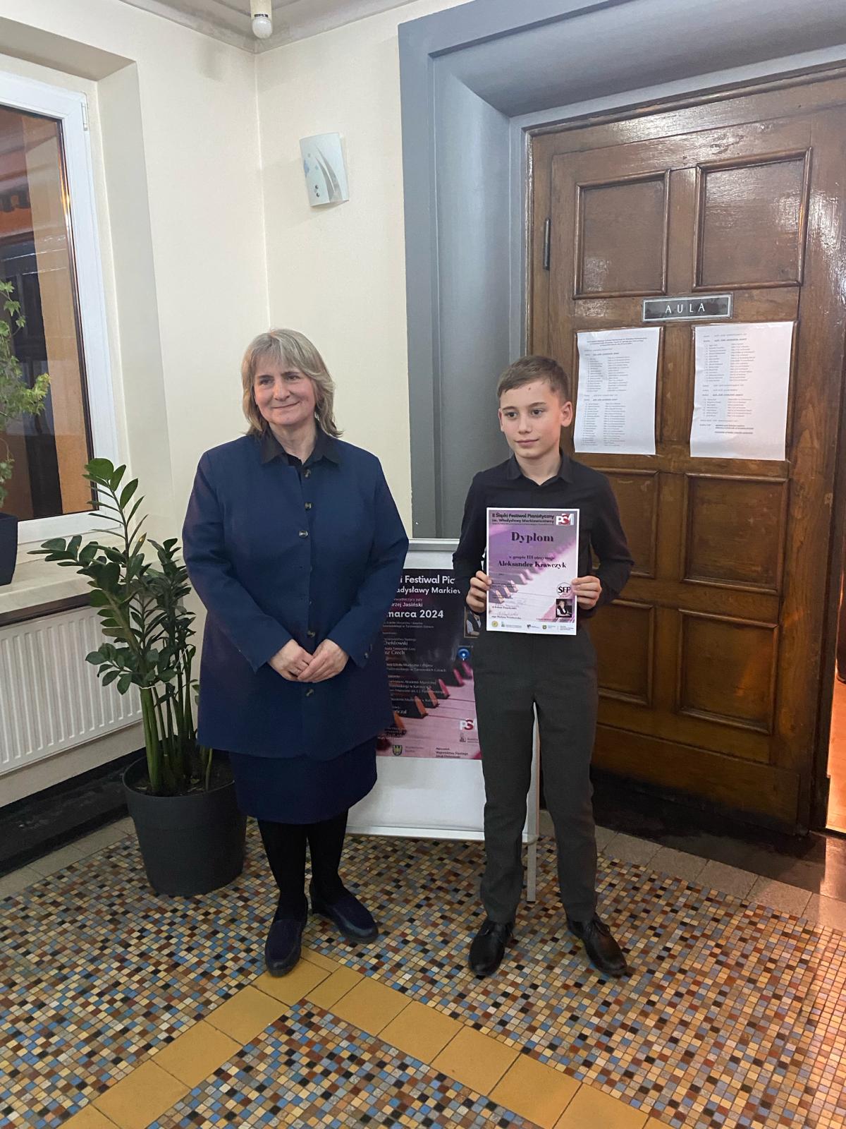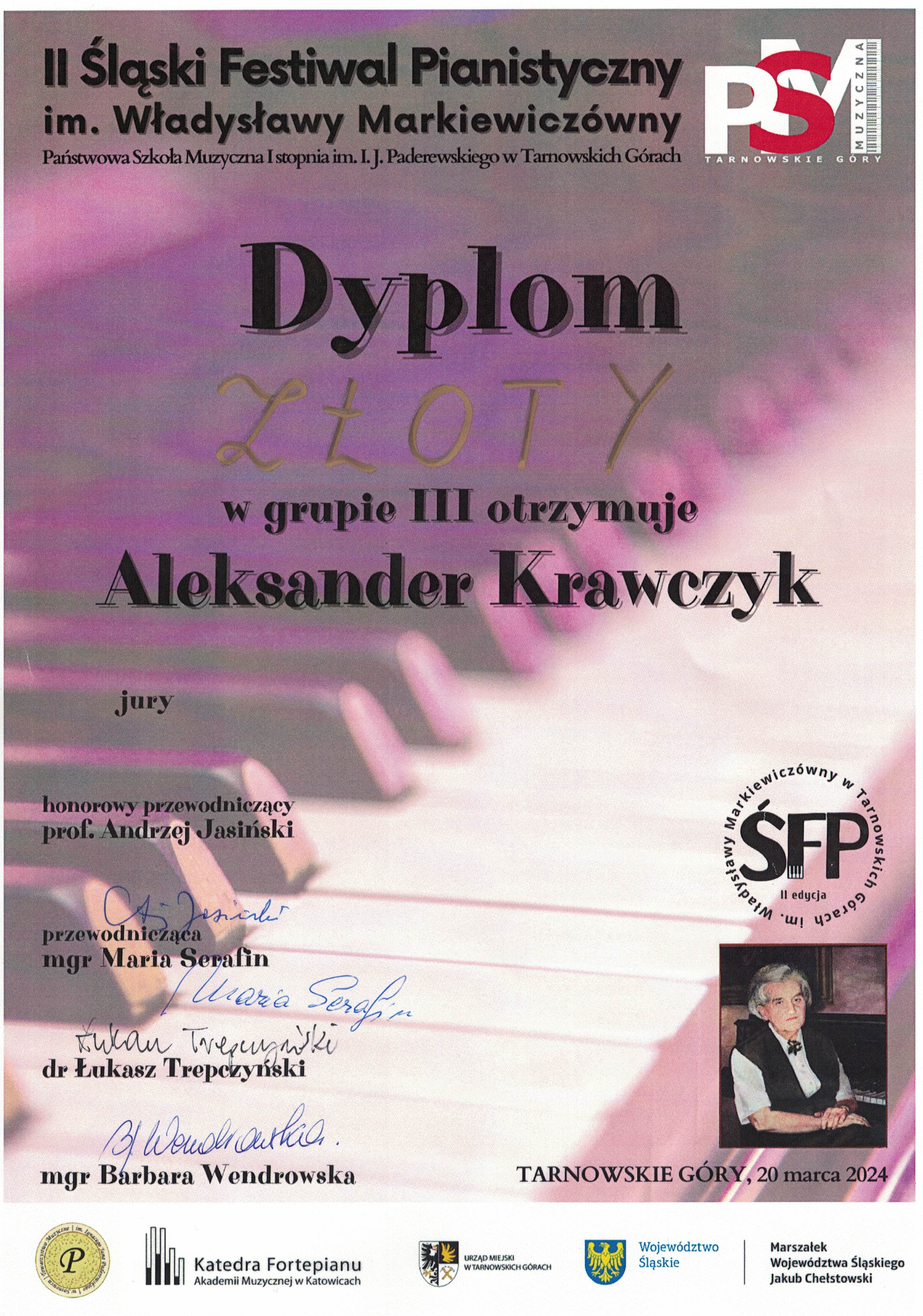 Aleksander Krawczyk z klasy 4 c6, został laureatem Złotego Dyplomu czyli 1 miejsca w III grupie wiekowej na II Śląskim Festiwalu Pianistycznym im. Władysławy Markiewiczówny, który odbył się 20 marca 2024 r. w Tarnowskich Górach. Olek jest uczniem klasy fortepianu p. Elżbiety Włosek-Żurawieckiej. Dodać warto, że Honorowym przewodniczącym jury tego konkursu był sam Prof. Andrzej Jasiński (Akademia Muzyczna w Katowicach).