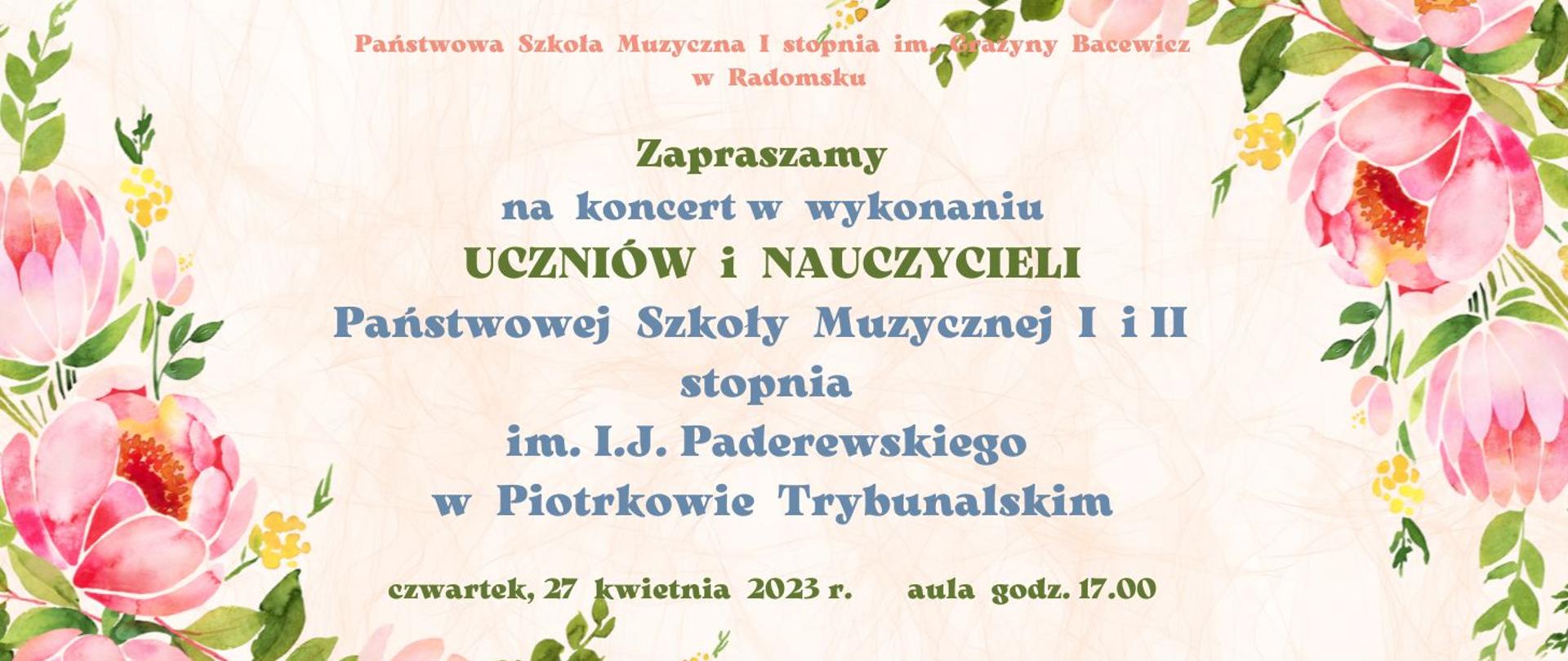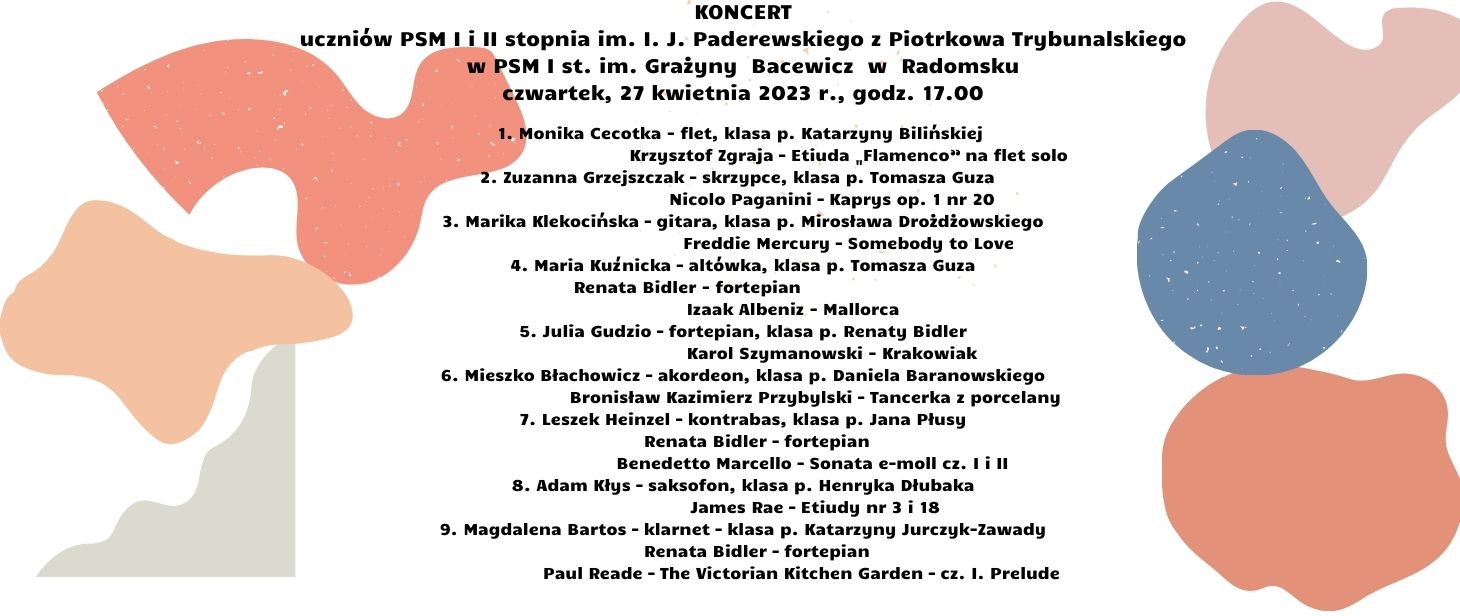 Serdecznie zapraszamy na koncert w wykonaniu uczniów i nauczycieli PSM I i II stopnia im. I.J.Paderewskiego w Piotrkowie Trybunalskim już 27 kwietnia w auli szkolnej o godz. 17.00.