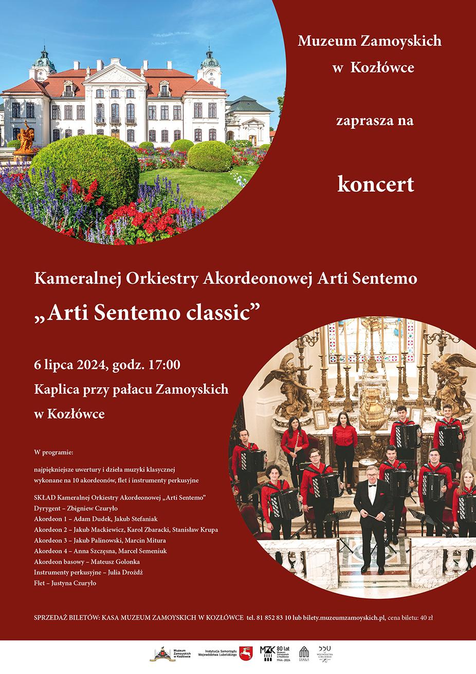 Serdecznie zapraszamy na koncert Kameralnej Orkiestry Akordeonowej "Arti Sentemo" pod dyrekcją Zbigniewa Czuryły, który odbędzie się 6 lipca 2024 roku w kaplicy przy Pałacu Zamoyskich w Kozłówce. W wykonaniu nauczycieli oraz absolwentów Państwowej Szkoły Muzycznej I st. im. Karola Lipińskiego w Radzyniu Podlaskim usłyszymy uwertury oraz dzieła muzyki klasycznej w aranżacji na 10 akordeonów, flet i instrumenty perkusyjne.