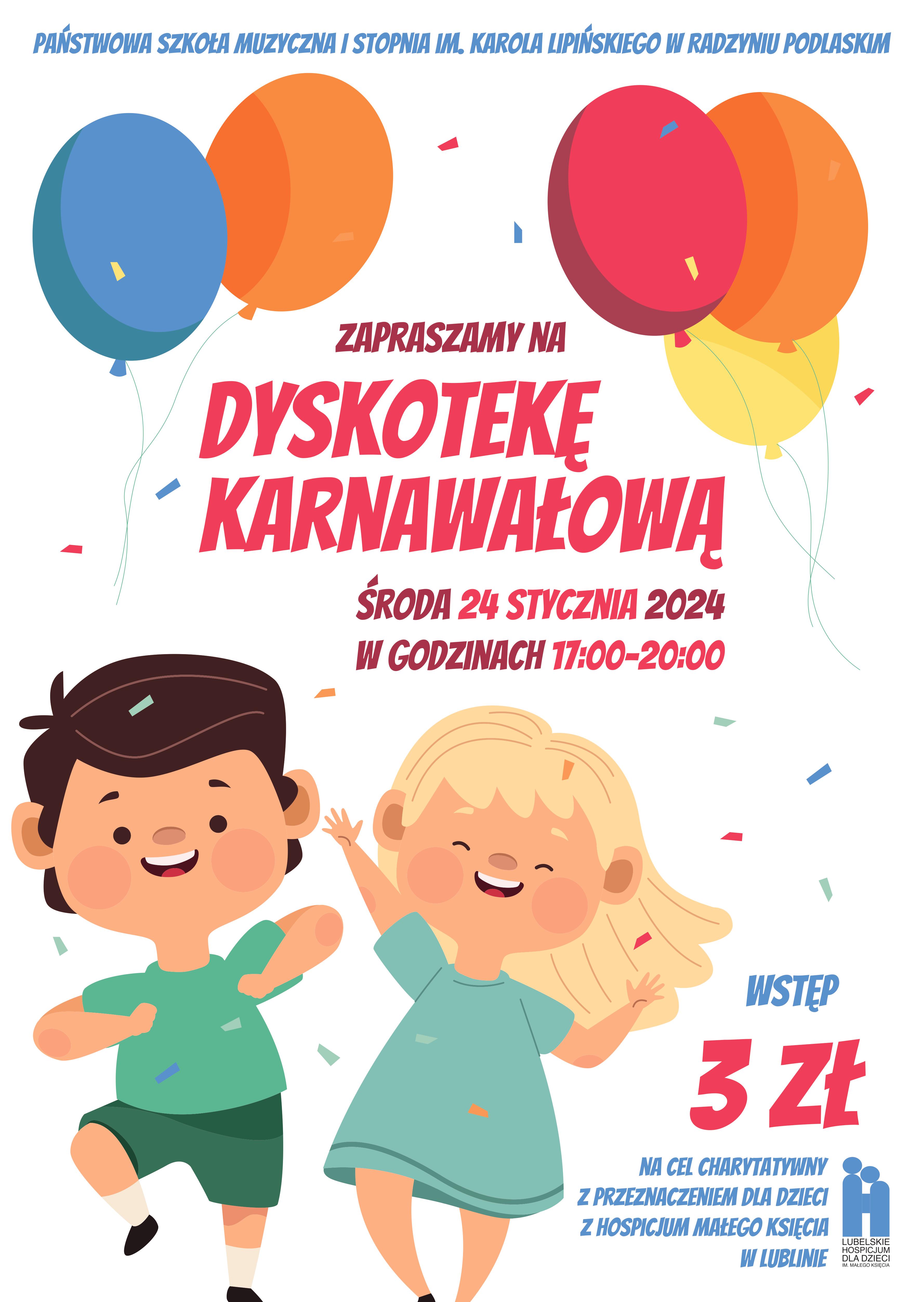 Już 24 stycznia 2024 roku w Naszej szkole w godz. 17-20 odbędzie się szkolna dyskoteka karnawałowa. Wstęp na zabawę kosztuje 3 zł, a zebrane środki zostaną przeznaczone dla dzieci z Hospicjum Małego Księcia w Lublinie. Serdecznie zapraszamy!!!