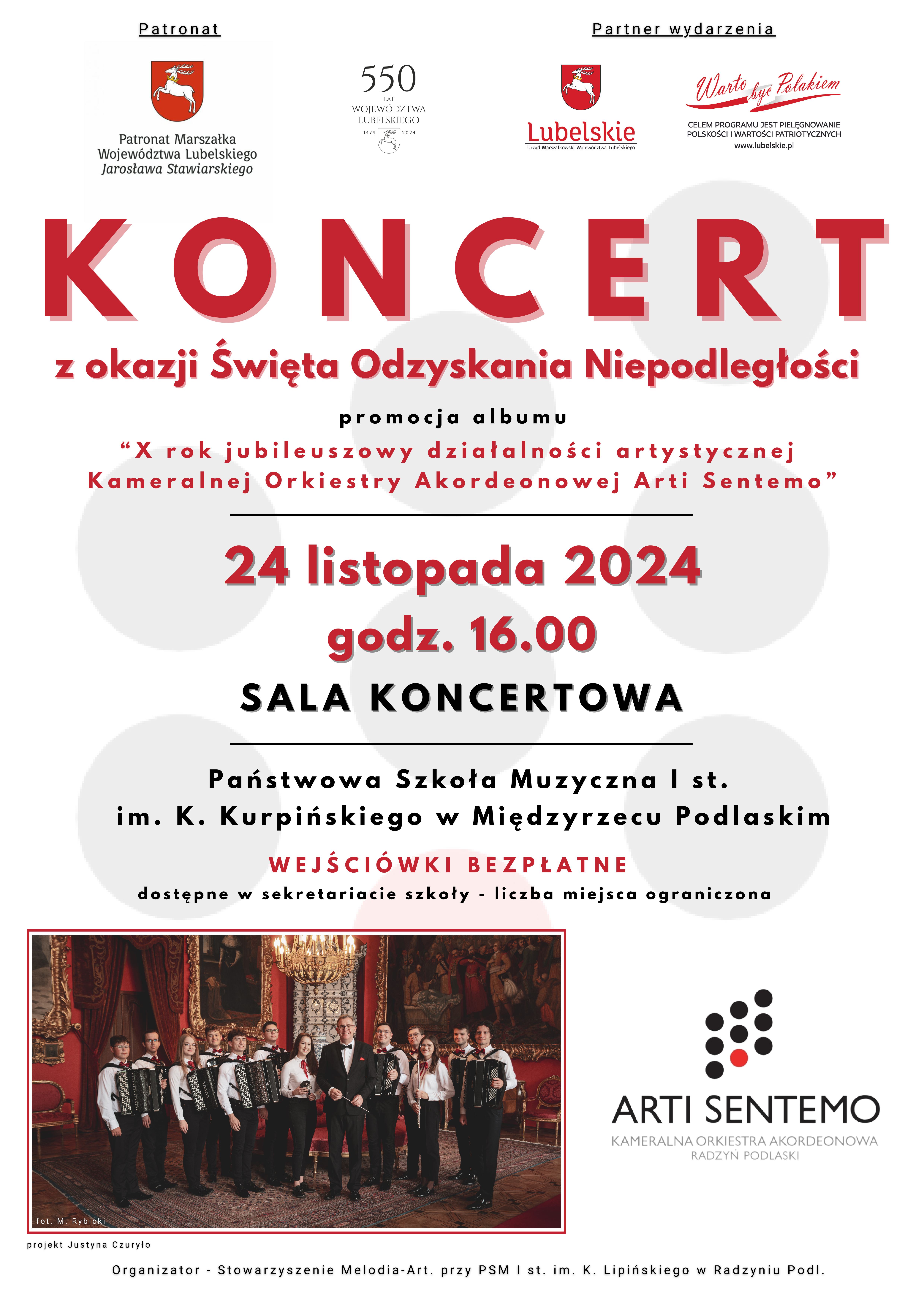 Partnerem wydarzenia "Koncert Arti Sentemo z okazji Święta Odzyskania Niepodległości - promocja albumu 10-lecia Kameralnej Orkiestry Akordeonowej Arti Sentemo" jest Województwo Lubelskie.