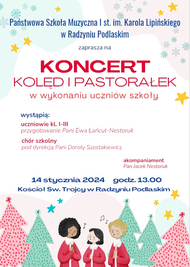 Już w najbliższą niedzielę 14.01.2024 roku o godz. 13 w Kościele Św. Trójcy w Radzyniu Podlaskim wystąpią uczniowie kl. I-III cyklu 6-letniego przygotowani przez p. Ewę Łańcut-Nestoruk oraz chór szkolny pod dyrekcją p. Doroty Szostakiewicz. W programie polskie kolędy oraz pastorałki, a akompaniować będzie p. Jacek Nestoruk. Serdecznie zapraszamy!!!