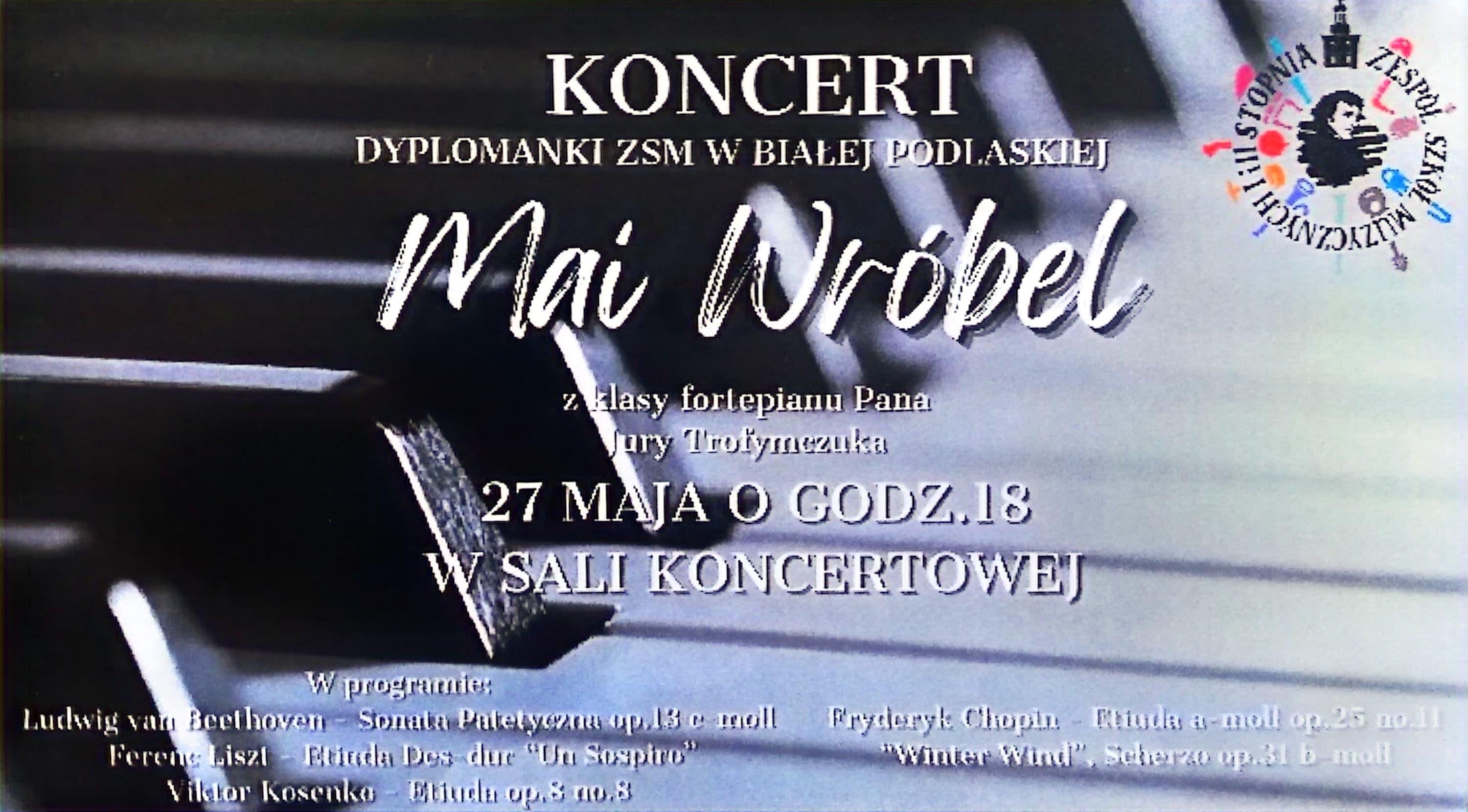 Zapraszamy na koncert Mai Wróbel - dyplomantki Zespołu Szkół Muzycznych I i II st. im. Fryderyka Chopina w Białej Podlaskiej. Młoda pianistka wystąpi 27 maja 2024 roku o godzinie 18 w Sali Koncertowej im. Zygmunta Pietrzaka. W programie m. in. muzyka Ludwiga van Beethovena, Ferenca Liszta, Viktora Kosenki oraz Fryderyka Chopina. Szczegółowy program na plakacie poniżej.