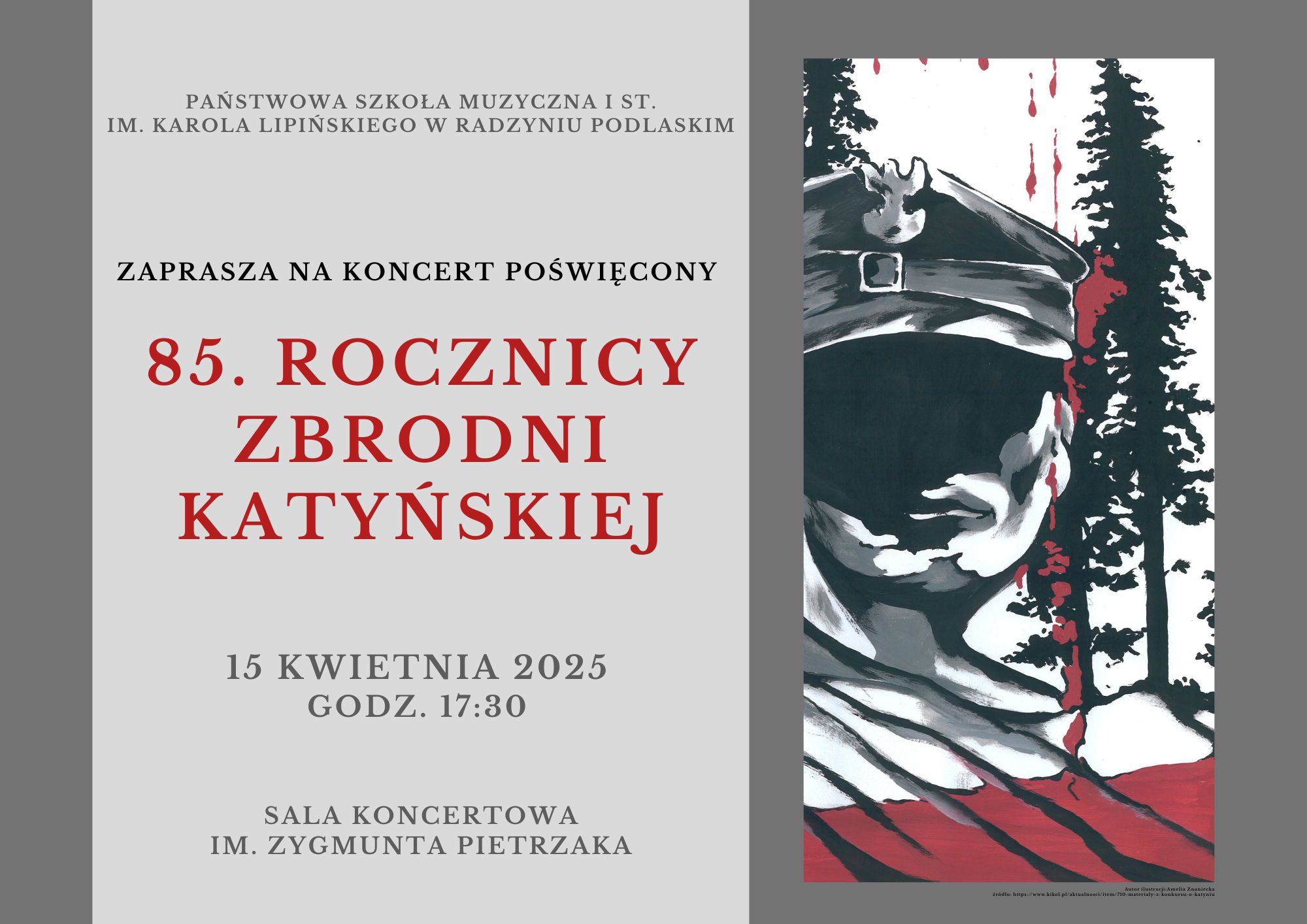 Serdecznie zapraszamy na koncert poświęcony 85. rocznicy zbrodni katyńskiej przygotowany przez uczniów naszej szkoły, który odbędzie się 15 kwietnia 2025 roku o godz. 17:30 w Sali Koncertowej im. Zygmunta Pietrzaka. W programie, m. in. muzyka polska, pieśni patriotyczne oraz prelekecja na temat historii i okoliczności zbrodni katyńskiej.