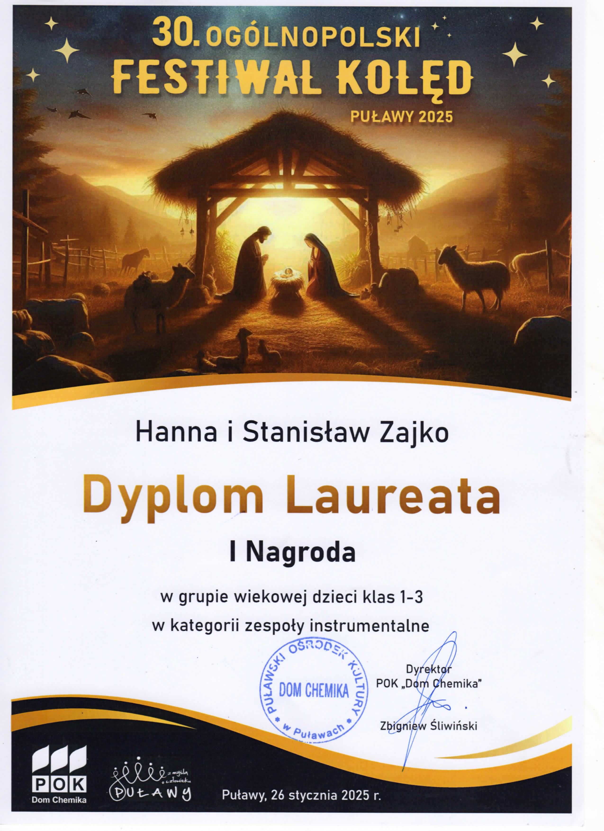Miło nam poinformować o sukcesach naszych uczniów na 30. Ogólnopolskim Festiwalu Kolęd Puławy 2025: