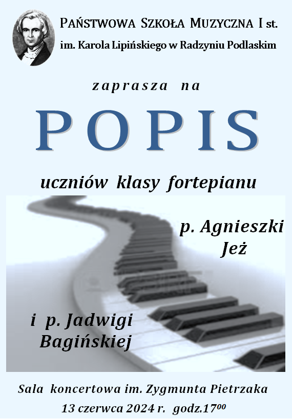 Serdecznie zapraszamy na popis uczniów klas fortepianu p. Agnieszki Jeż oraz p. Jadwigi Bagińskiej. Koncert odbędzie się w 13 czerwca 2024 roku o godzinie 17 w Sali Koncertowej im. Zygmunta Pietrzaka.