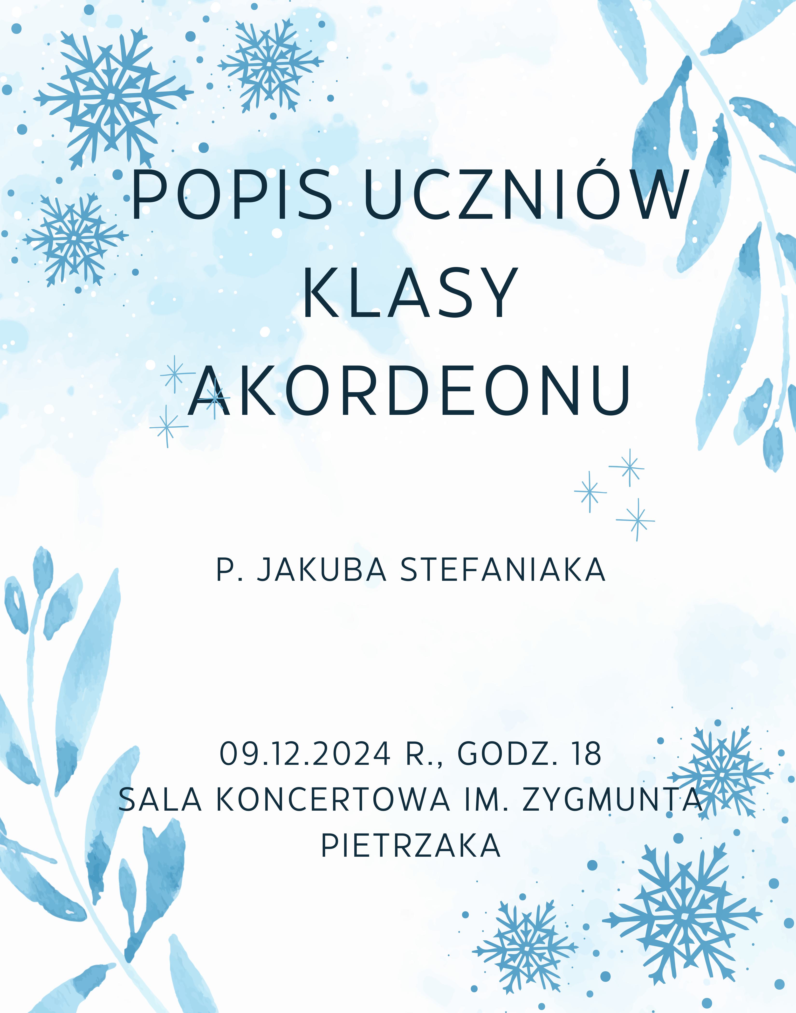Serdecznie zapraszamy na popis uczniów klasy akordeonu p. Jakuba Stefaniaka, który odbędzie się 9 grudnia 2024 roku o godzinie 18 w Sali Koncertowej im. Zygmunta Pietrzaka.