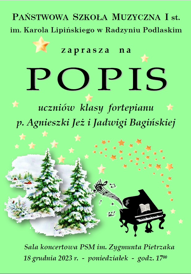 Serdecznie zapraszamy na popis klasy fortepianu p. Agnieszki Jeż oraz p. Jadwigi Bagińskiej, który odbędzie się 18 grudnia 2023 roku w Sali Koncertowej im. Zygmunta Pietrzaka w Naszej szkole.