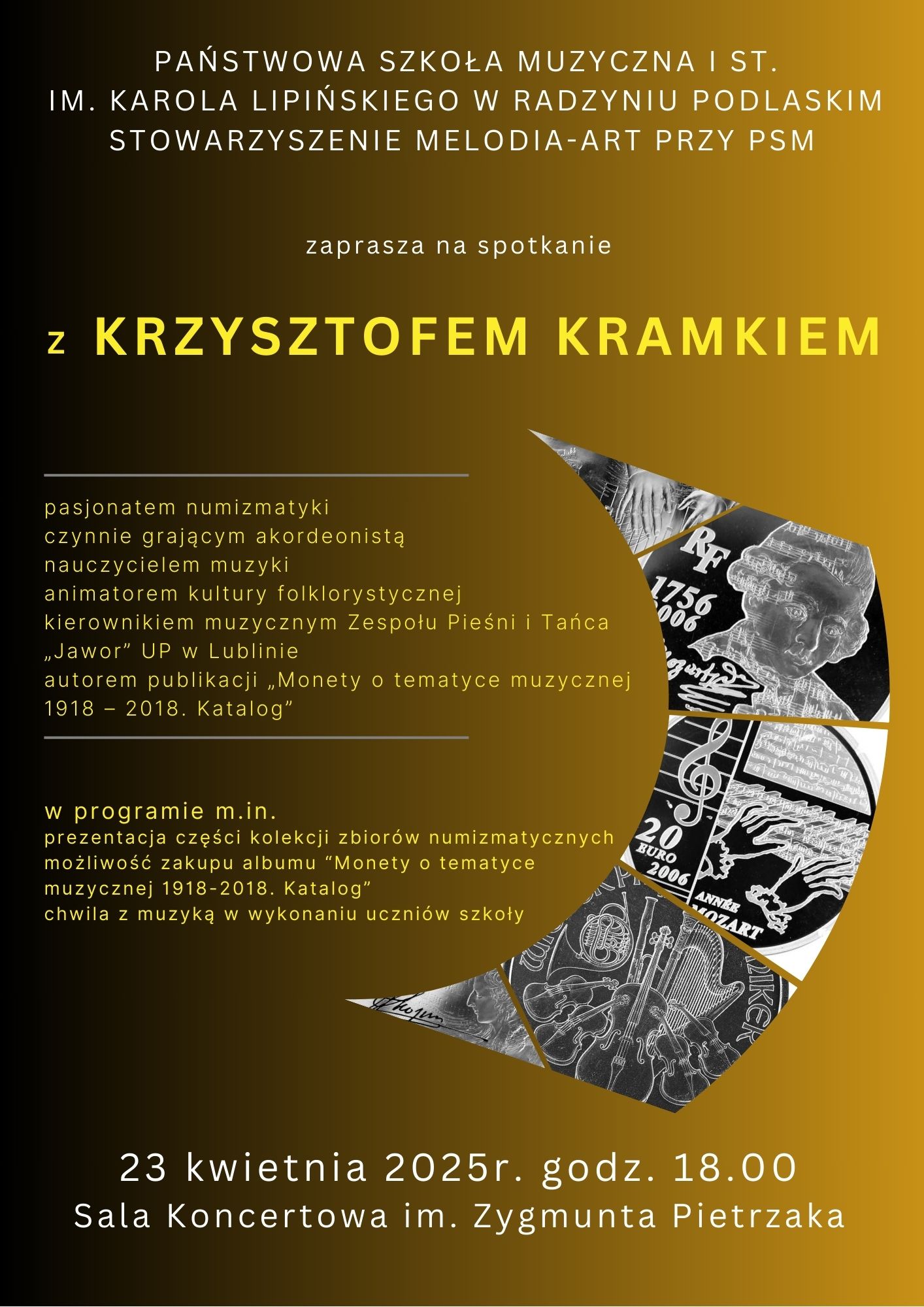 Zapraszamy na spotkanie z Krzysztofem Kramkiem, które odbędzie się 23 kwietnia 2025 roku o godz. 18 w Sali Koncertowej im. Zygmunta Pietrzaka. Podczas spotkania nasz gość zaprezentuje część swojej niezwykłej kolekcji i opowie o jej powstaniu. Uczestnicy wydarzenia będą mogli również nabyć wyjątkowy katalog, autorstwa Krzysztofa Kramka: „Monety o tematyce muzycznej 1918-2018”. Spotkanie zwieńczy chwila z muzyką w wykonaniu uczniów naszej szkoły.