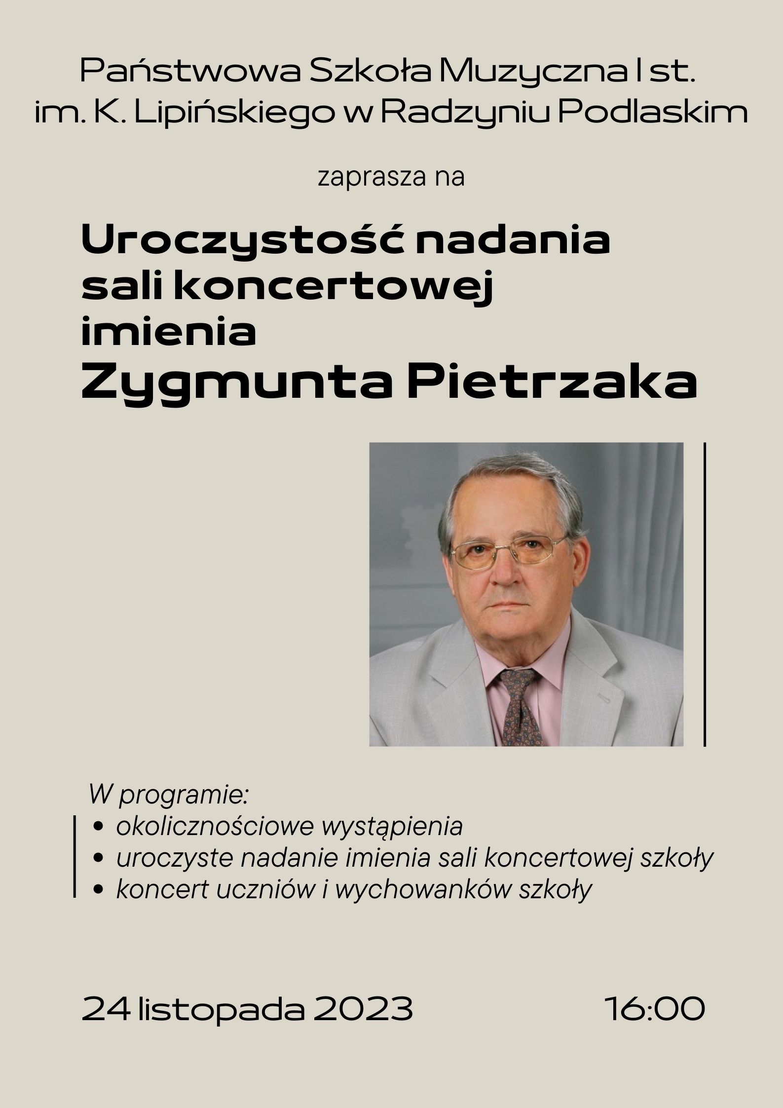 Serdecznie zapraszamy na uroczystość nadania Sali Koncertowej imienia ZYGMUNTA PIETRZAKA - pierwszego dyrektora Państwowej Szkoły Muzycznej I stopnia im. Karola Lipińskiego w Radzyniu Podlaskim.