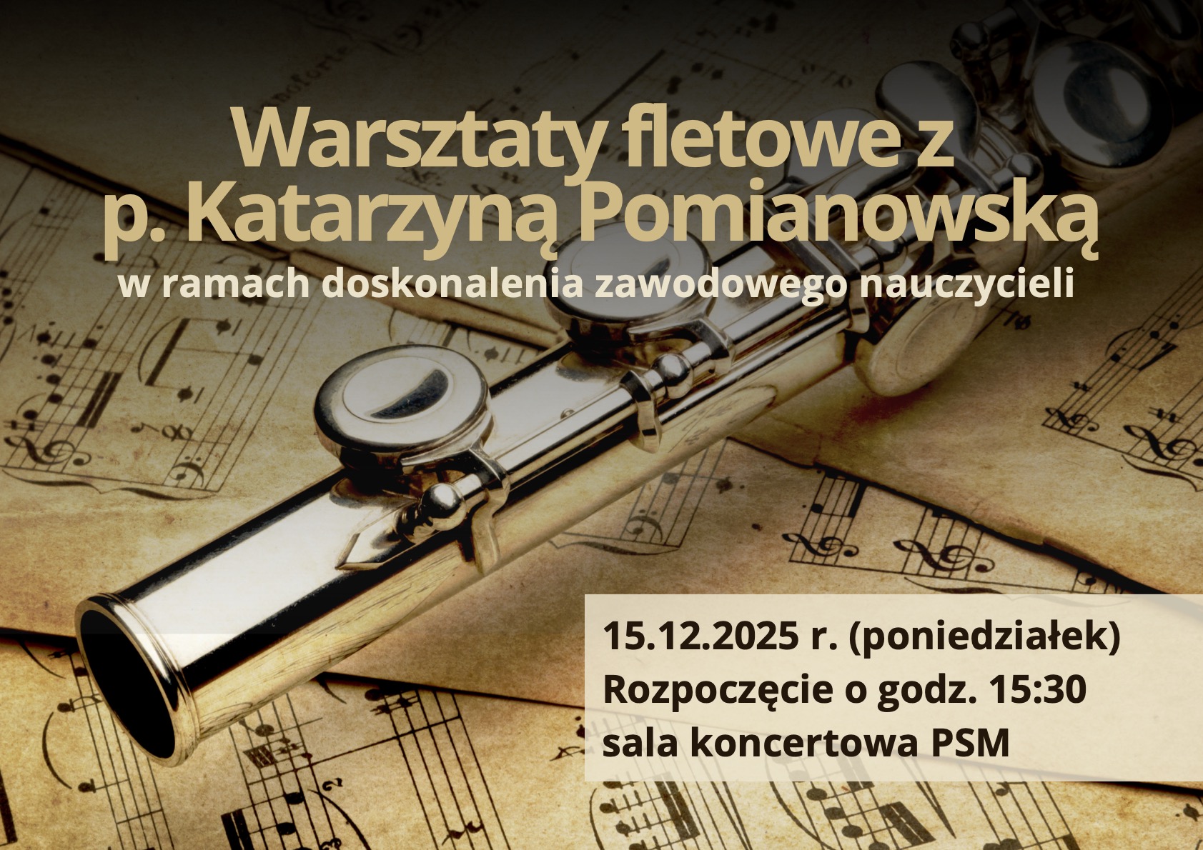 Zapraszamy uczniów, rodziców i nauczycieli na warsztaty fletowe z p. Katarzyną Pomianowską, które odbędą się 15 grudnia 2025 roku od godz. 15:30 w Sali Koncertowej naszej szkoły.