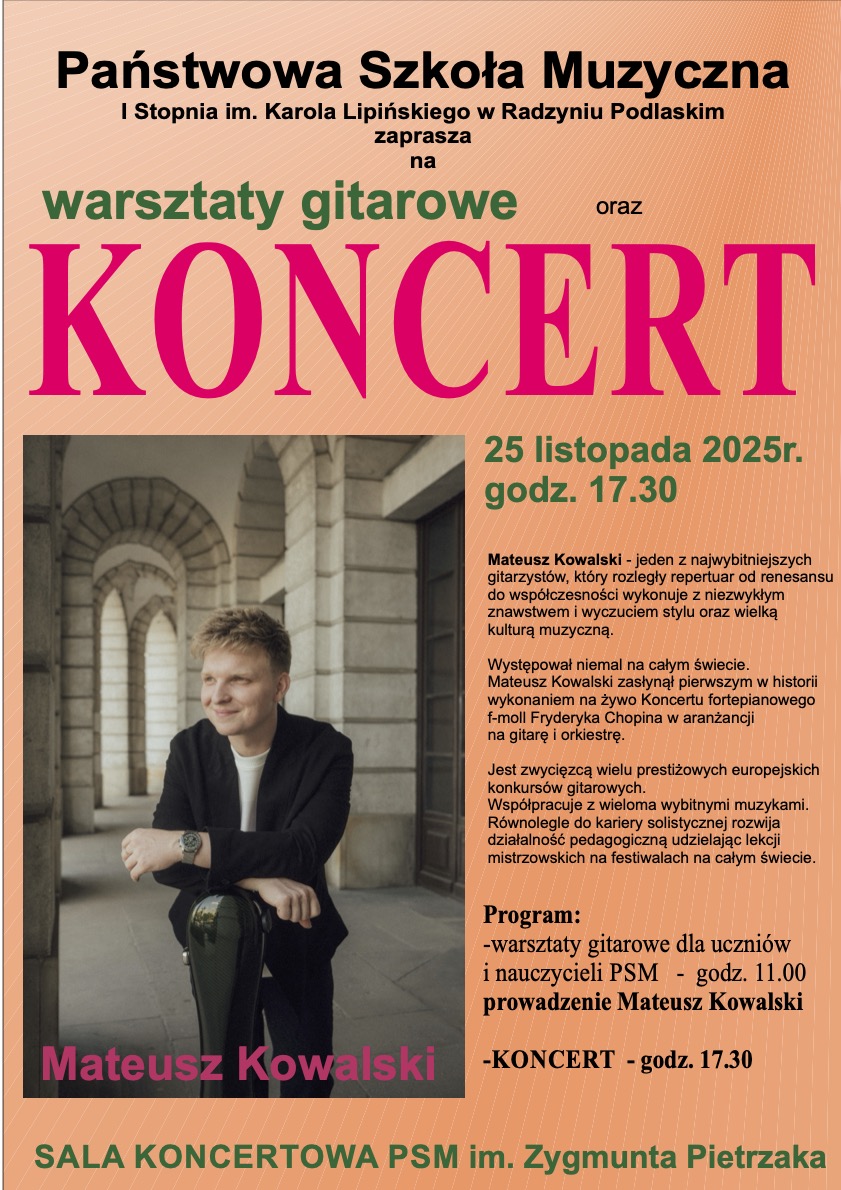 25 listopada 2025 roku odbędą się koncert oraz warsztaty z Mateuszem Kowalskim - jednym z najwybitniejszych gitarzystów, który rozległy repertuar od renesansu do współczesności wykonuje z niezwykłym znawstwem i wyczuciem stylu oraz wielką kulturą muzyczną. Występował niemal na całym świecie. Mateusz Kowalski zasłynął pierwszym w historii wykonaniem na żywo Koncertu fortepianowego f-moll Fryderyka Chopina w aranżancji na gitarę i orkiestrę. Jest zwycięzcą wielu prestiżowych europejskich konkursów gitarowych. Współpracuje z wieloma wybitnymi muzykami. Równolegle do kariery solistycznej rozwija działalność pedagogiczną udzielając lekcji mistrzowskich na festiwalach na całym świecie.