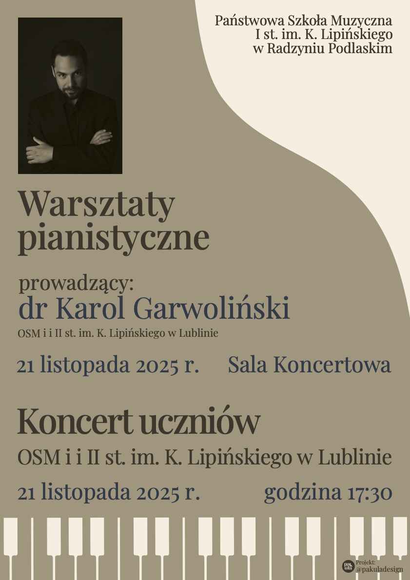 Serdecznie zapraszamy na warsztaty pianistyczne z dr. Karolem Garwolińskim z Ogólnokształcącej Szkoły Muzycznej I i II stopnia. im. Karola Lipińskiego w Lublinie, które odbędą się 21 listopada 2025 w Sali Koncertowej im. Zygmunta Pietrzaka.. Tego samego dnia o godz. 17:30 odbędzie się koncert uczniów OSM w Lublinie, na który również serdecznie zapraszamy.