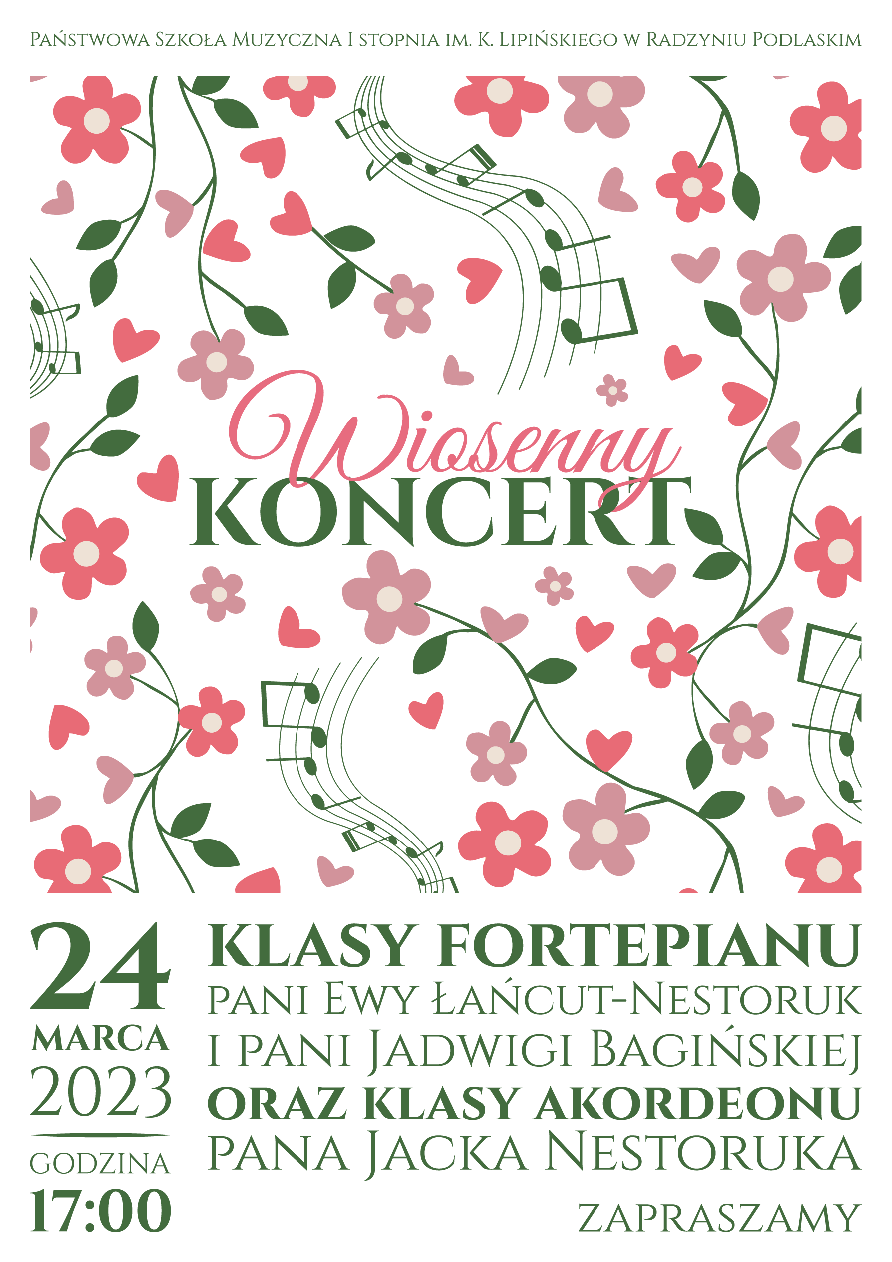 24 marca 2023 roku w Sali Koncertowej Naszej Szkoły o godz. 17 odbędzie się koncert klasy fortepianu Pani Jadwigi Bagińskiej i Pani Ewy Łańcut-Nestoruk oraz klasy akordeonu Pana Jacka Nestoruka.
