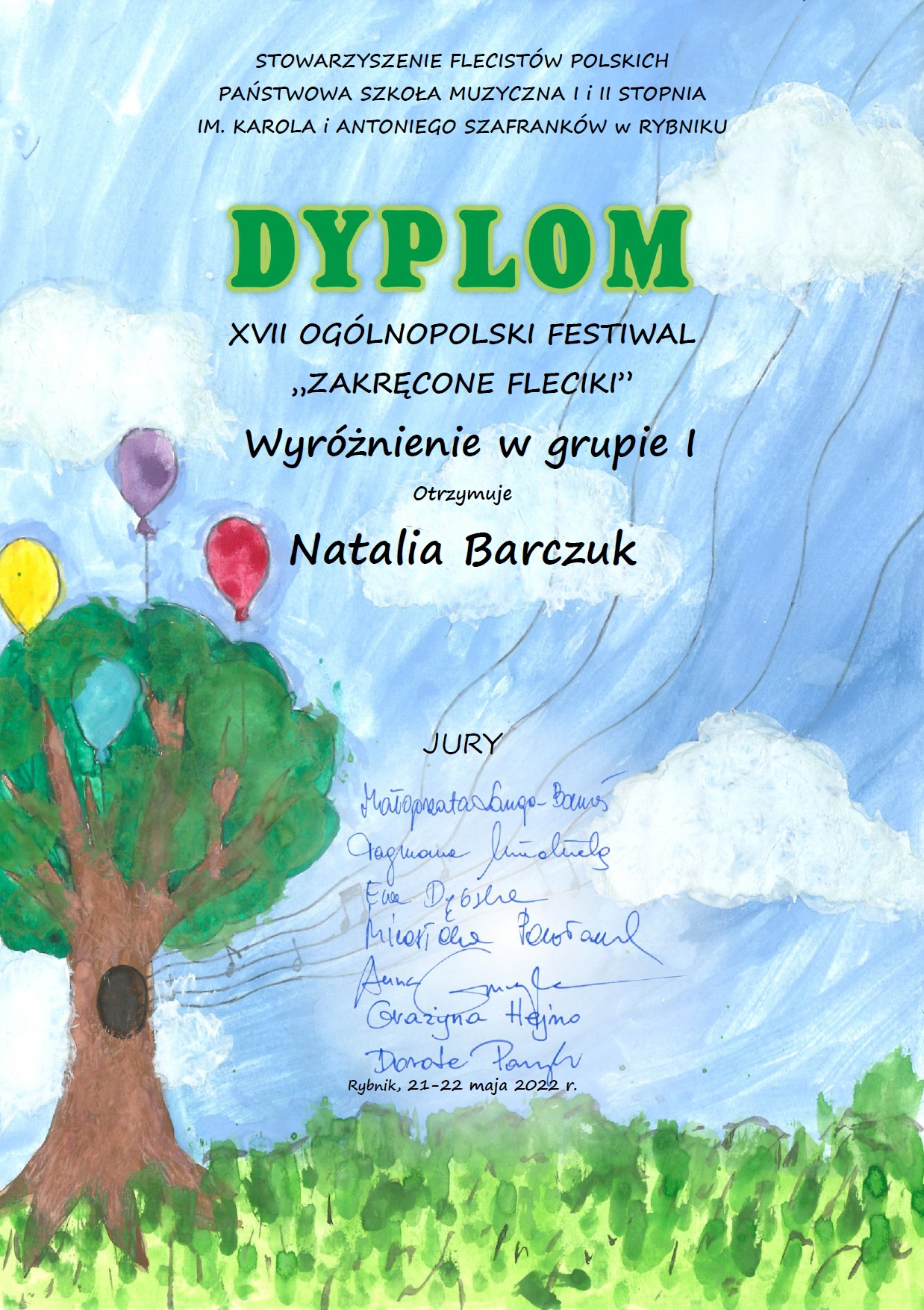 natomiast podczas XII Ogólnopolskiego Festiwalu „Zakręcone Fleciki” uczennice Antonina MĘŻYK, Julia i Natalia BARCZUK otrzymały wyróżnienia.