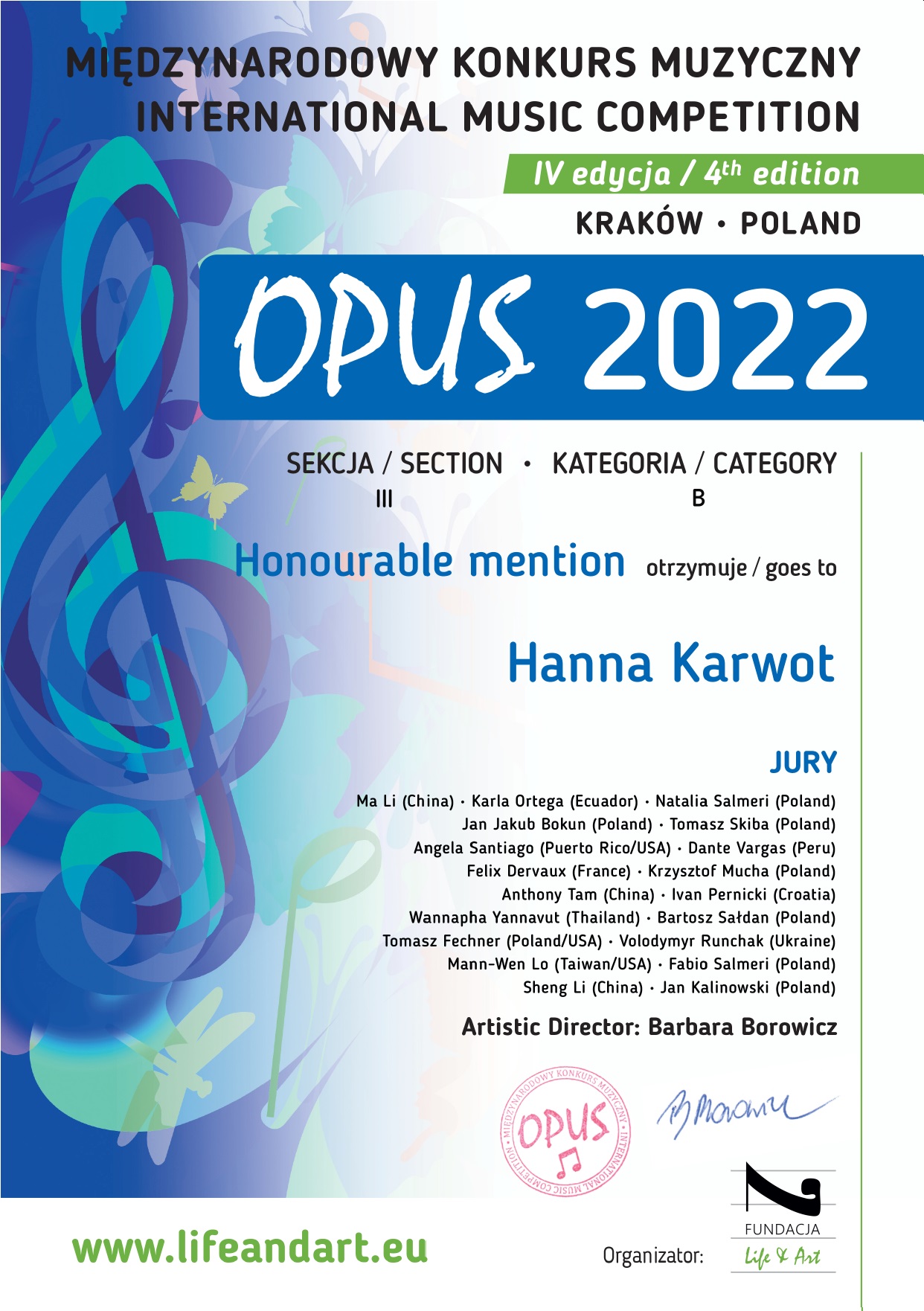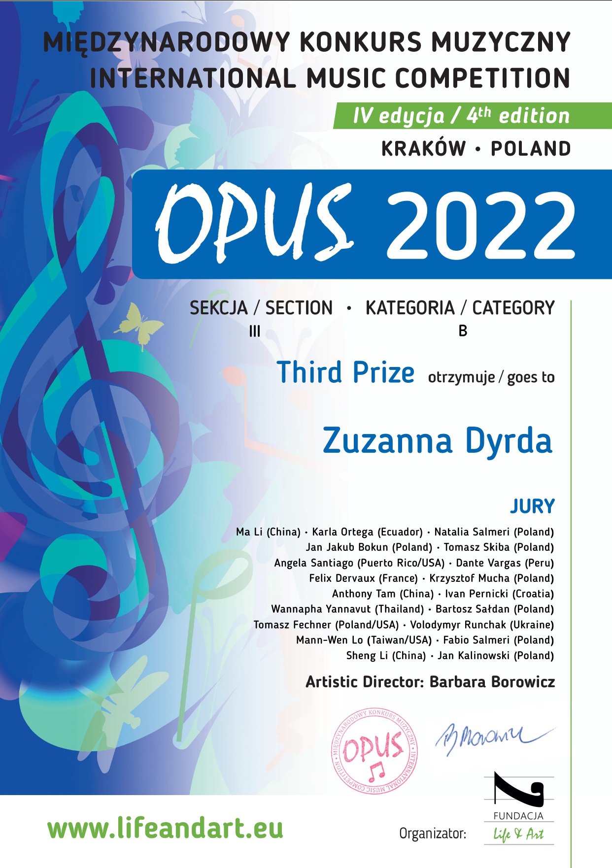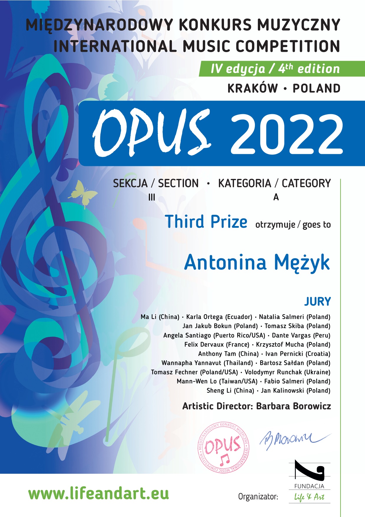 I tak podczas Międzynarodowego Konkursu Muzycznego OPUS 2022 (IV edycja) uczennice uzyskały następujące nagrody: