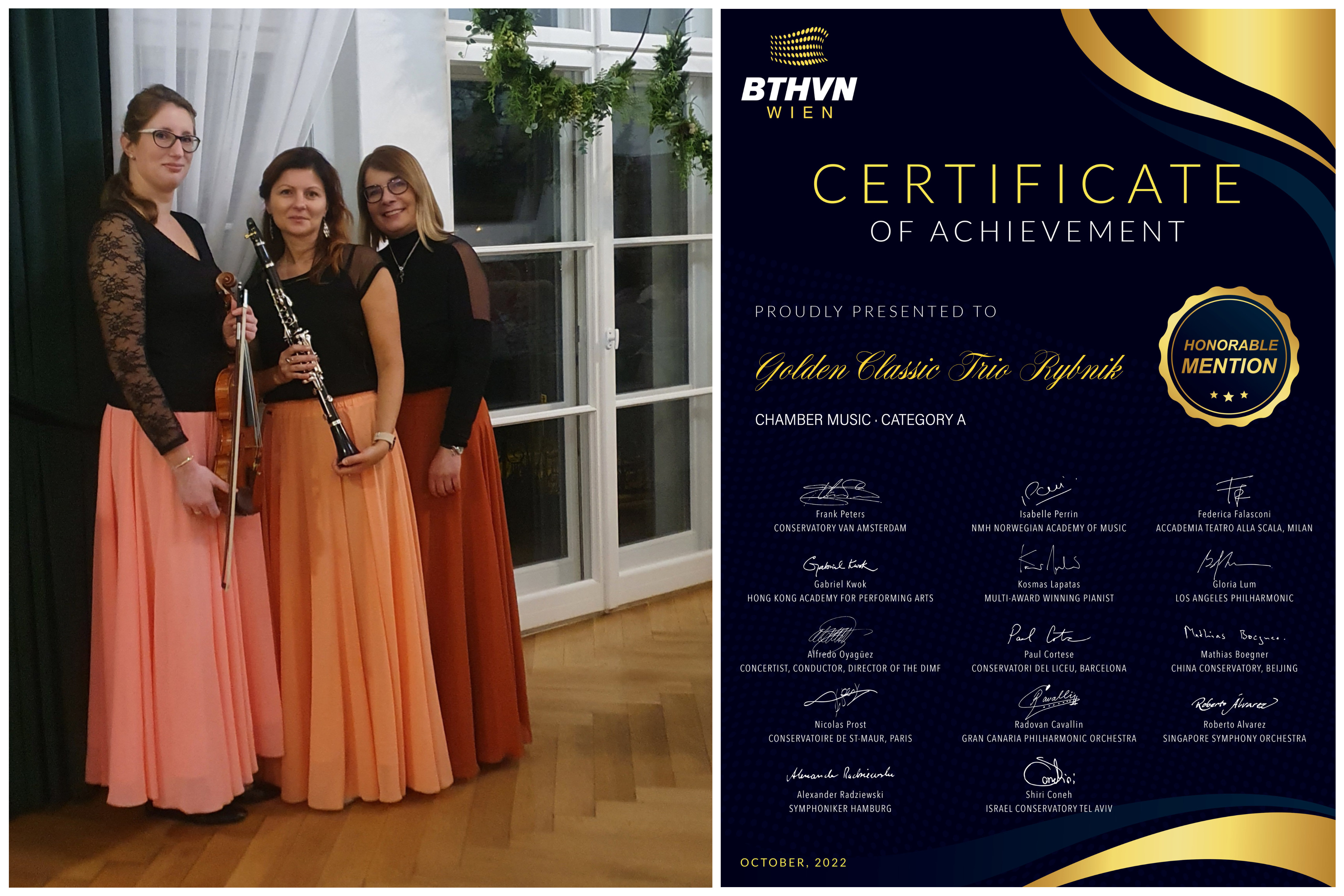 Tym razem Ksenia Więcek-Łuczak - fortepian, Barbara Bytner - skrzypce, Joanna Kania - klarnet uzyskały wyróżnienie na Online International BTHVN Wien Competition 2022.