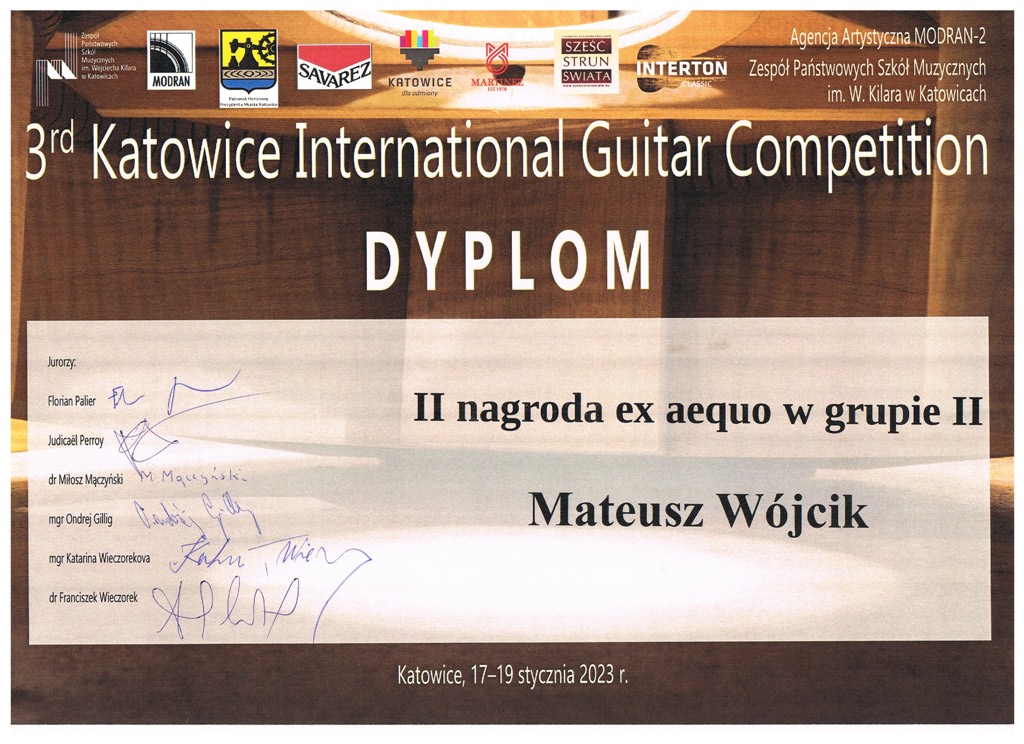 W dniach 17-19 stycznia 2023 r. odbył się 3 Międzynarodowy Konkurs Gitarowy w Katowicach, organizowany przez Agencję Artystyczną MODRAN-2 oraz Zespół Państwowych Szkół Muzycznych im. W. Kilara w Katowicach. W konkursie udział wzięło 47 gitarzystów z Polski, Czech, Łotwy i Słowacji. Sanocką szkołę muzyczną reprezentował Mateusz Wójcik z klasy gitary dr Iwony Bodziak.
