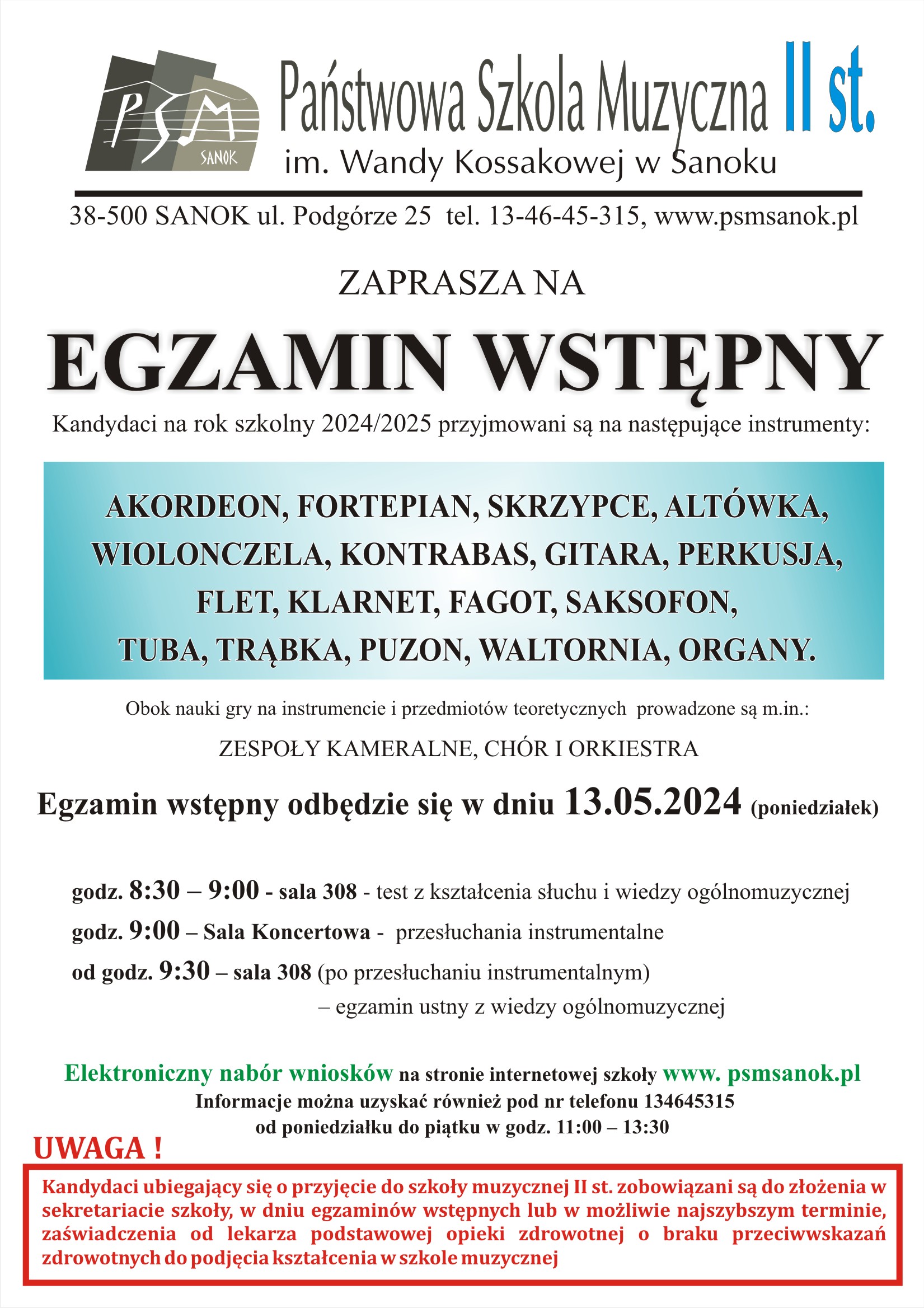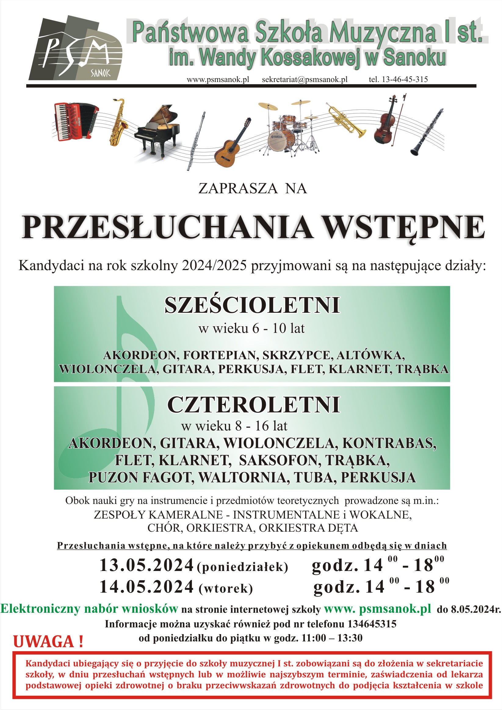 Państwowa Szkoła Muzyczna I i II st. im. Wandy Kossakowej w Sanoku ogłasza zapisy na rok szkolny 2024/2025.