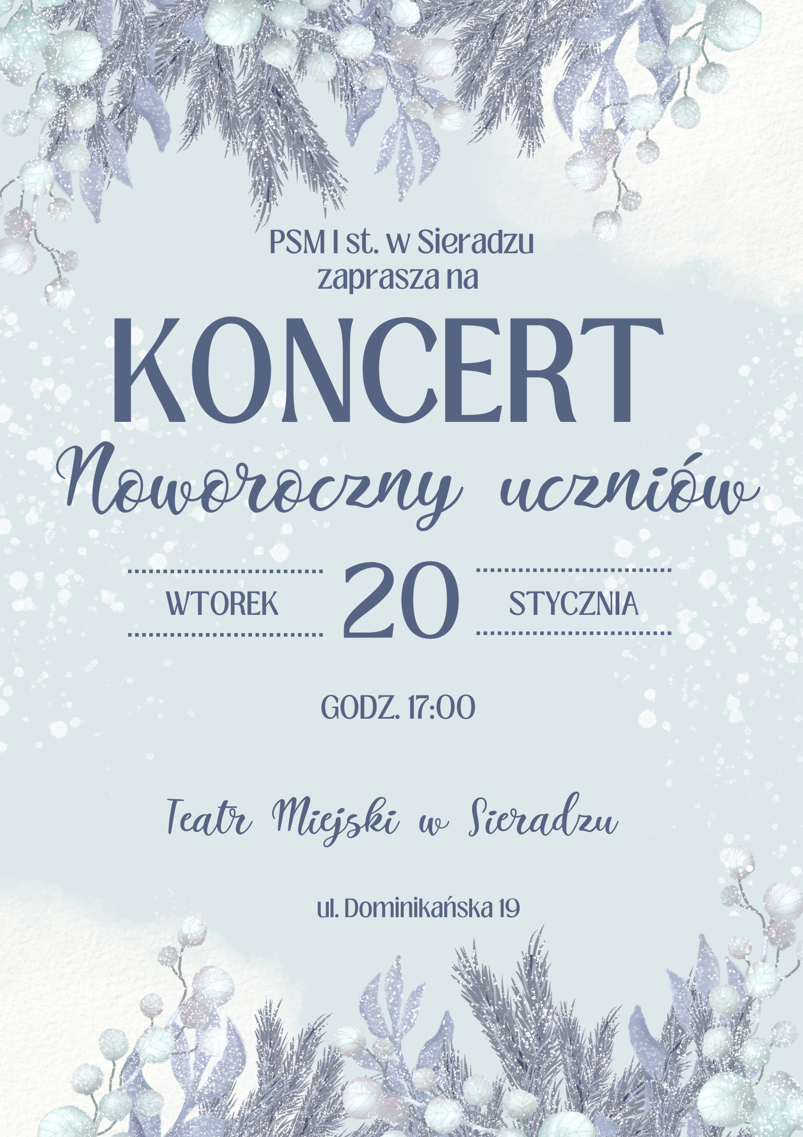 Serdecznie zapraszamy na Koncert Noworoczny w wykonaniu uczniów naszej szkoły. Koncert odbędzię się 20 stycznia 2026 r. o godzinie 17:00 w Teatrze Miejskim w Sieradzu.