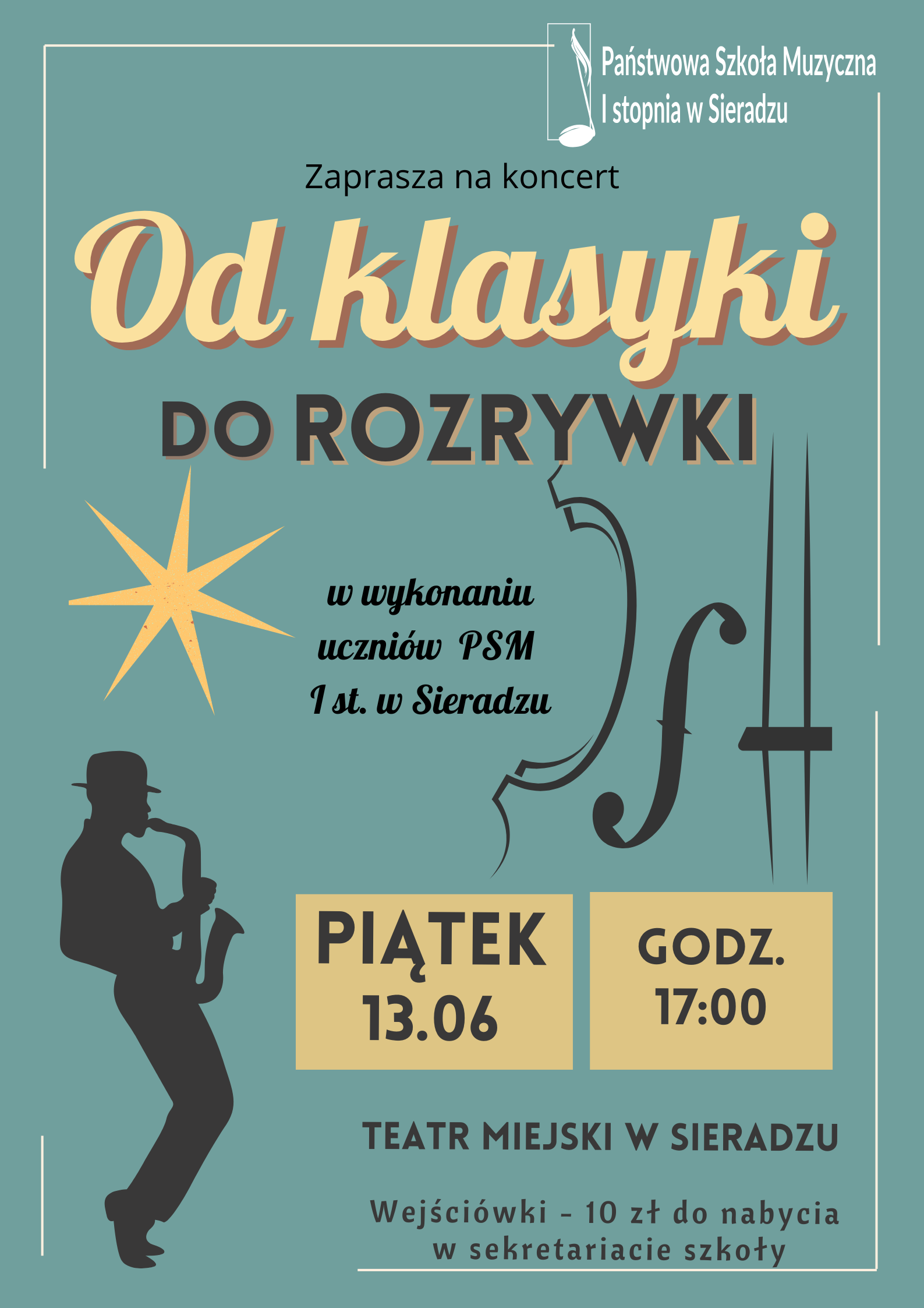 Zapraszamy na koncert uczniów "Od klasyki do rozrywki", który odbędzie się 13 czerwca 2025 roku w Teatrze Miejskim w Sieradzu o godzinie 17:00. Wydarzenie to będzie prawdziwą muzyczną podróżą. Wystąpią nasi utalentowani artyści, którzy zaprezentują różnorodny repertuar i podzielą się swoją pasją do muzyki.