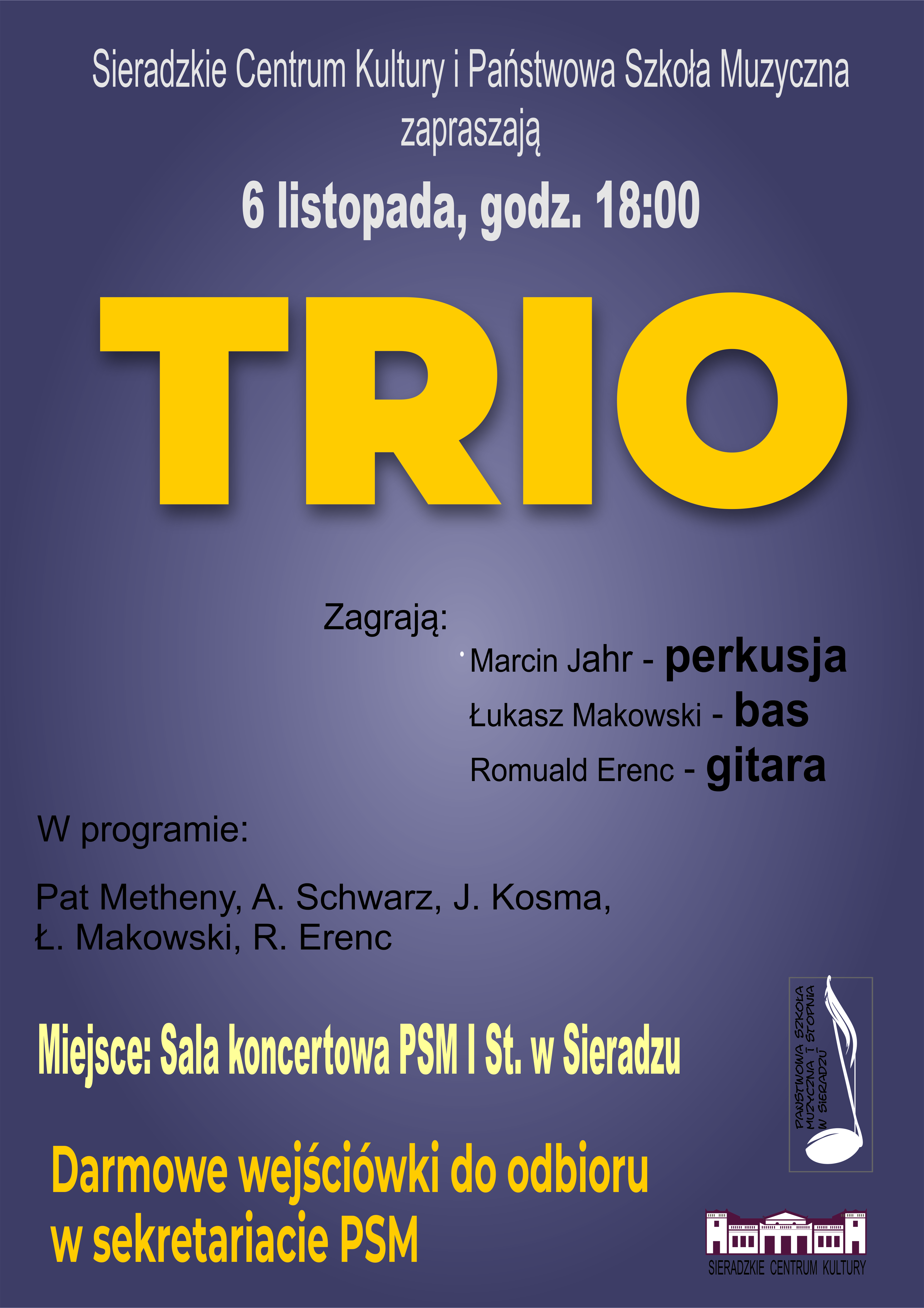 Zapraszamy na koncert Tria Erenc – gitara, Makowski – bas, Jahr – perkusja.