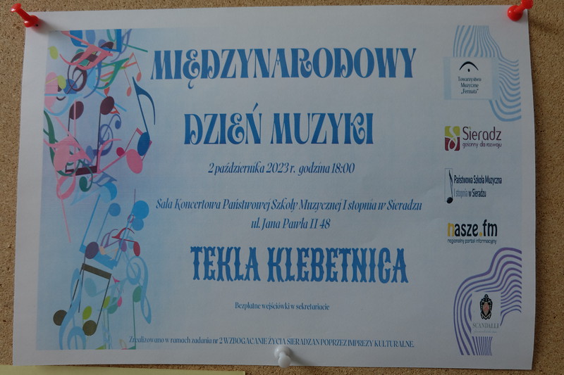 Z okazji Międzynarodowego Dnia Muzyki, 2 października, Tekla Klebetnica zagrała w gościnnej Sali Koncertowej Państwowej Szkole Muzycznej I stopnia w Sieradzu. Na scenie najwyższy kunszt muzyczny zaprezentowali: